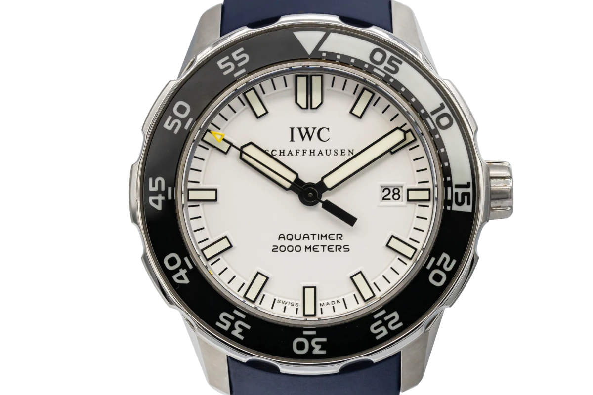 This circa 2013 IWC Aquatimer Automatic 2000 44mm features a white dial with baton markers and a blue rubber bracelet. It also features a black stainless steel bezel.