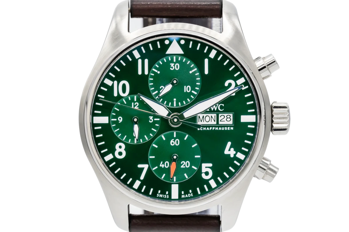 This 2021 IWC Pilot Chronograph 43mm features a green dial with arabic numerals and a brown leather strap. It also features a smooth stainless steel bezel.