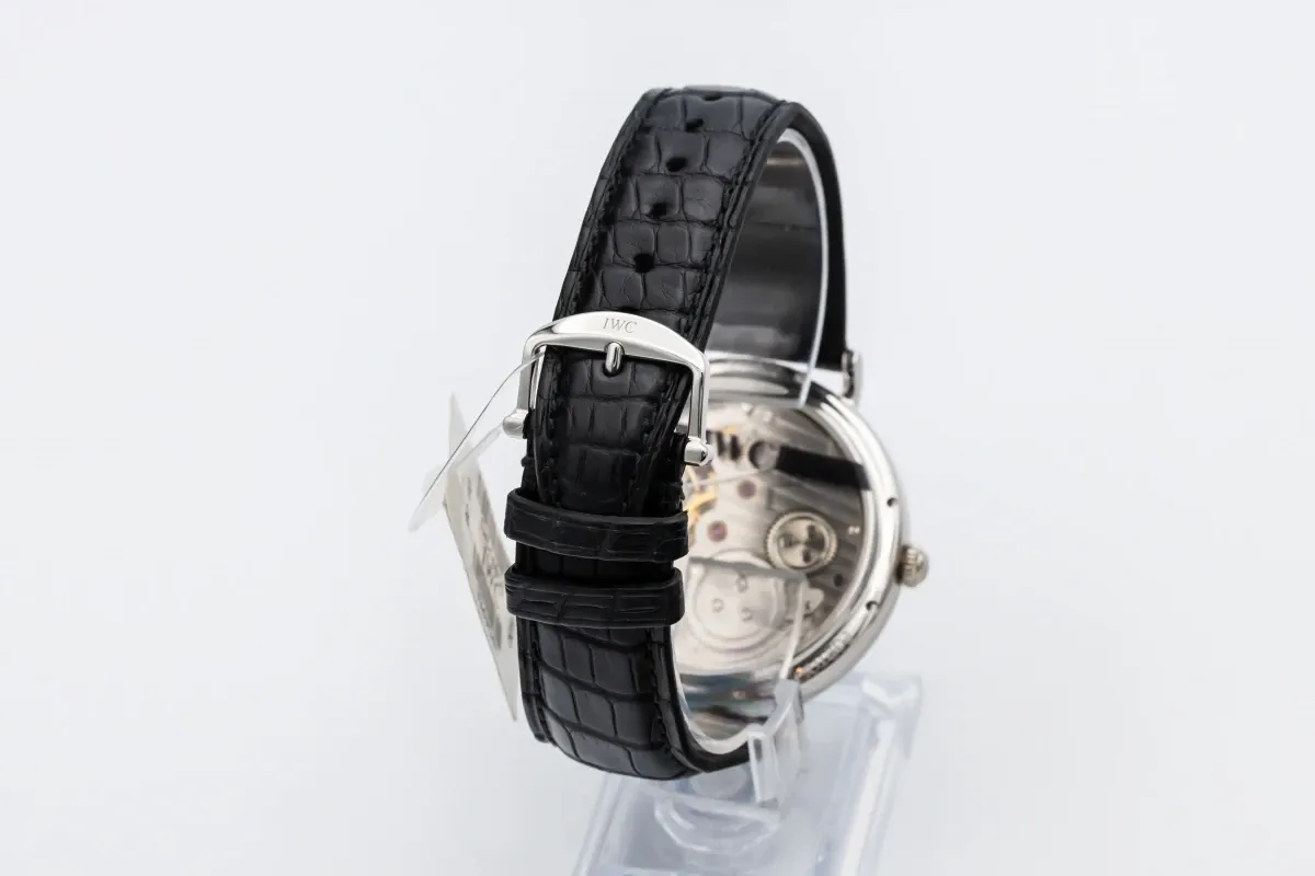 finance this from £290.56 p/m call the shop Read about our Limited Lifetime WarrantyThis unworn 2008 IWC Portofino Hand-Wound 46mm features a white dial with roman numerals and a blackleather bracelet. It also features a platinum case and bezel.