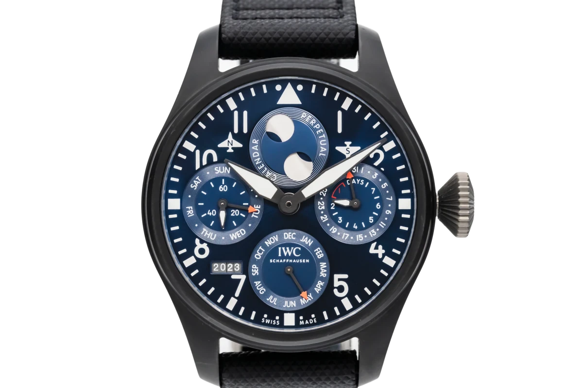 This 2022 IWC Big Pilots Perpetual Calender Edition Rodeo Drive 46mm features a blue dial with arabic numerals and a black kevlar strap. It also features a ceramic bezel.