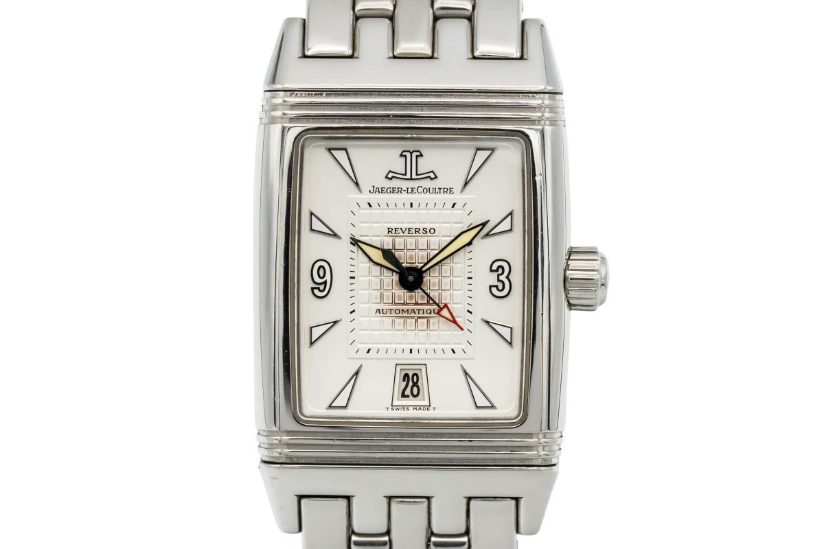 This Jaeger Le Coultre Reverso Gran Sport features a white dial with dagger markers and a stainless steel bracelet. It also features a smooth stainless steel  bezel.