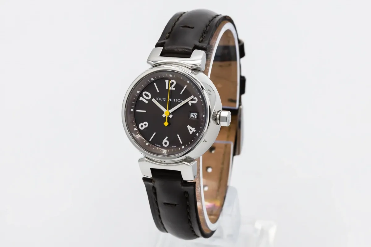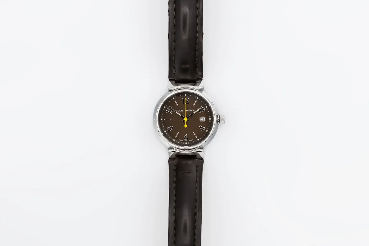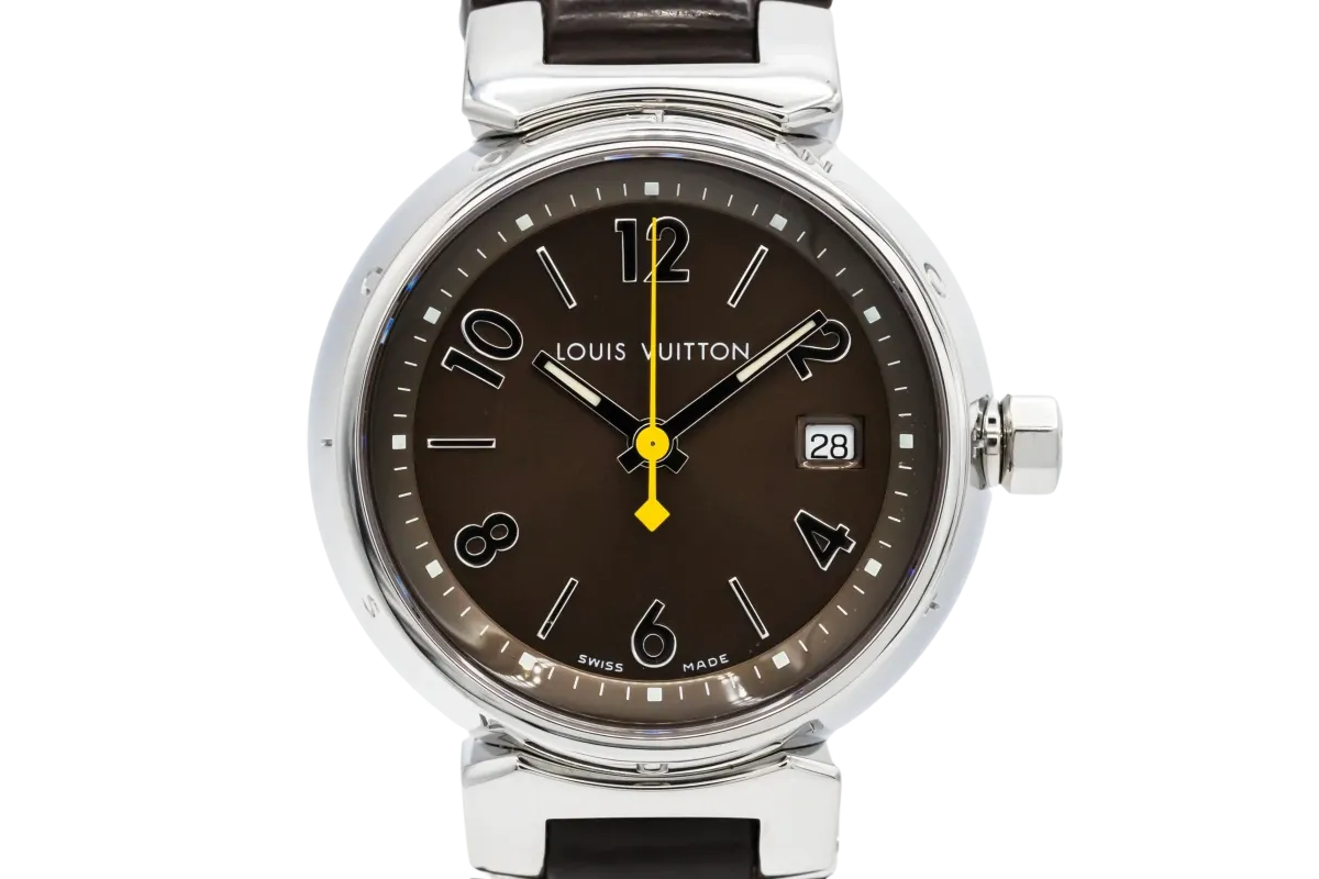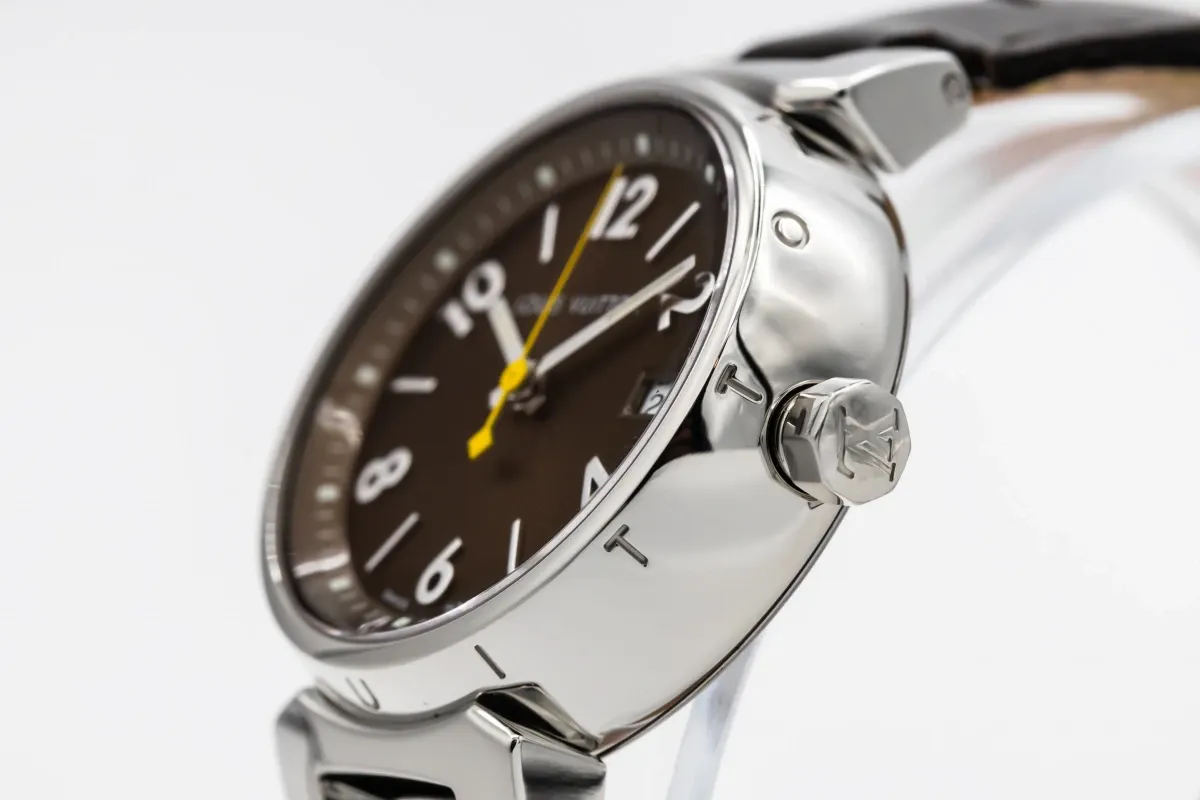 This Louis Vuitton Tambour 34mm features a brown dial with arabic numerals and baton markers. It also features a brown leather bracelet and a stainless steel bracelet.