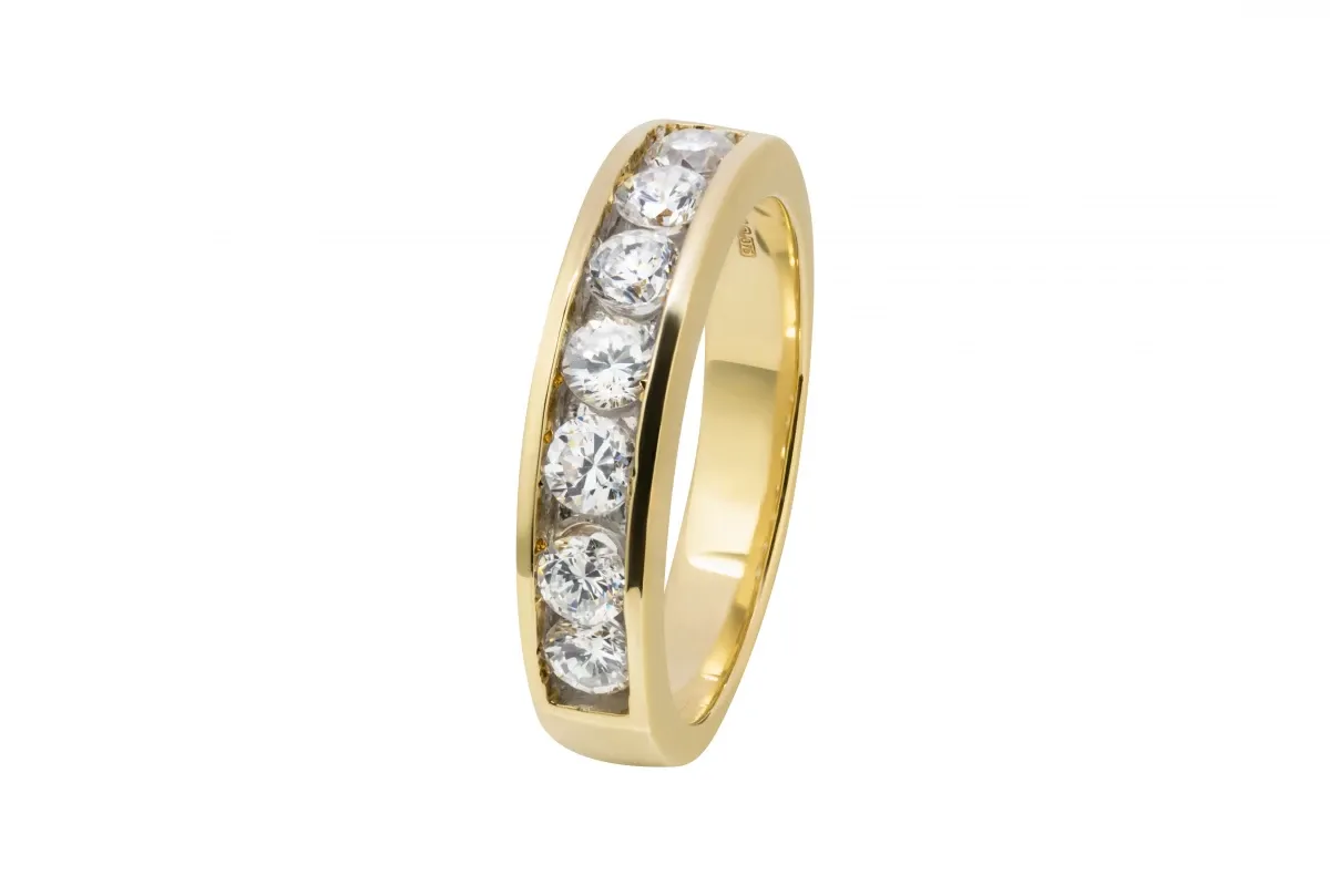 A timeless 9ct yellow gold wedding band featuring a row of dazzling cubic zirconia stones for added brilliance.