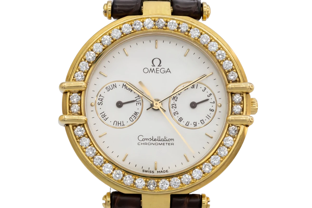 This 1990 OMEGA Constellation Day-Date 33mm features a white dial with 18ct yellow gold baton markers, 2 sub dials featuring the day and the date and a brown leather bracelet. It is also fitted with a 18ct yellow gold factory diamond encrusted bezel.