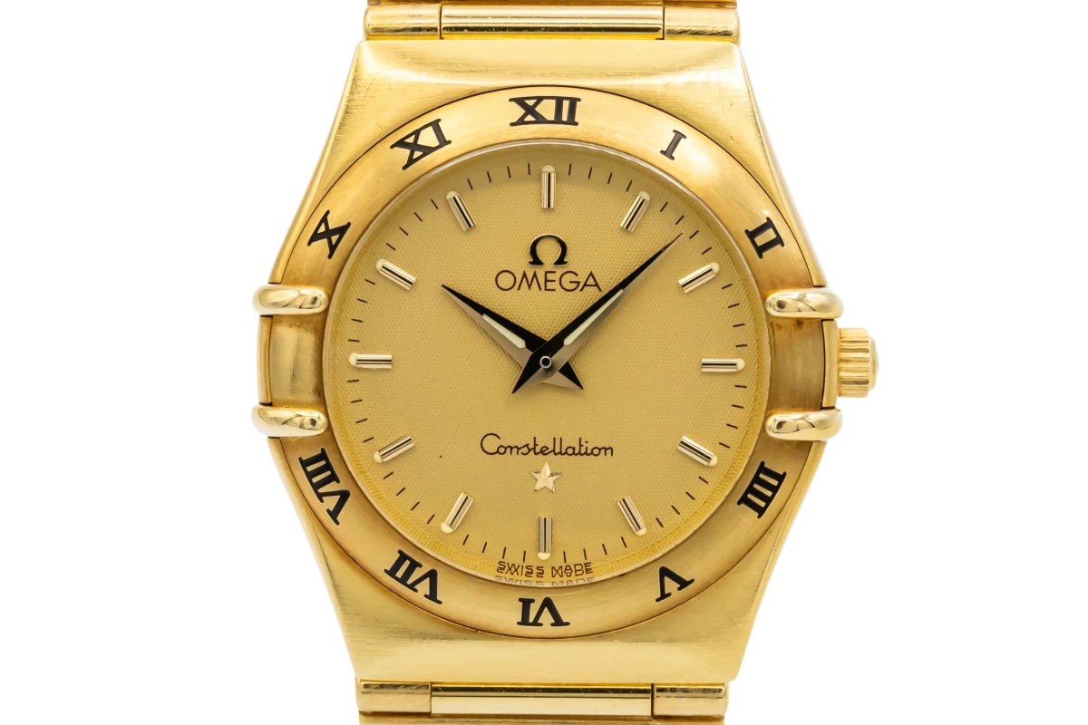 This 1998 OMEGA Constellation Ladies 25mm features a champagne dial with baton markers and a 18ct yellow gold bracelet. It also features a 18ct yellow gold bezel.