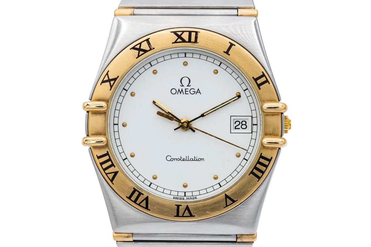 This circa 1990 OMEGA Constellation 33mm features a white dial with round index markers and a stainless steel and 18ct yellow gold bracelet. It is also fitted with an 18ct yellow gold bezel with roman numeral markers.