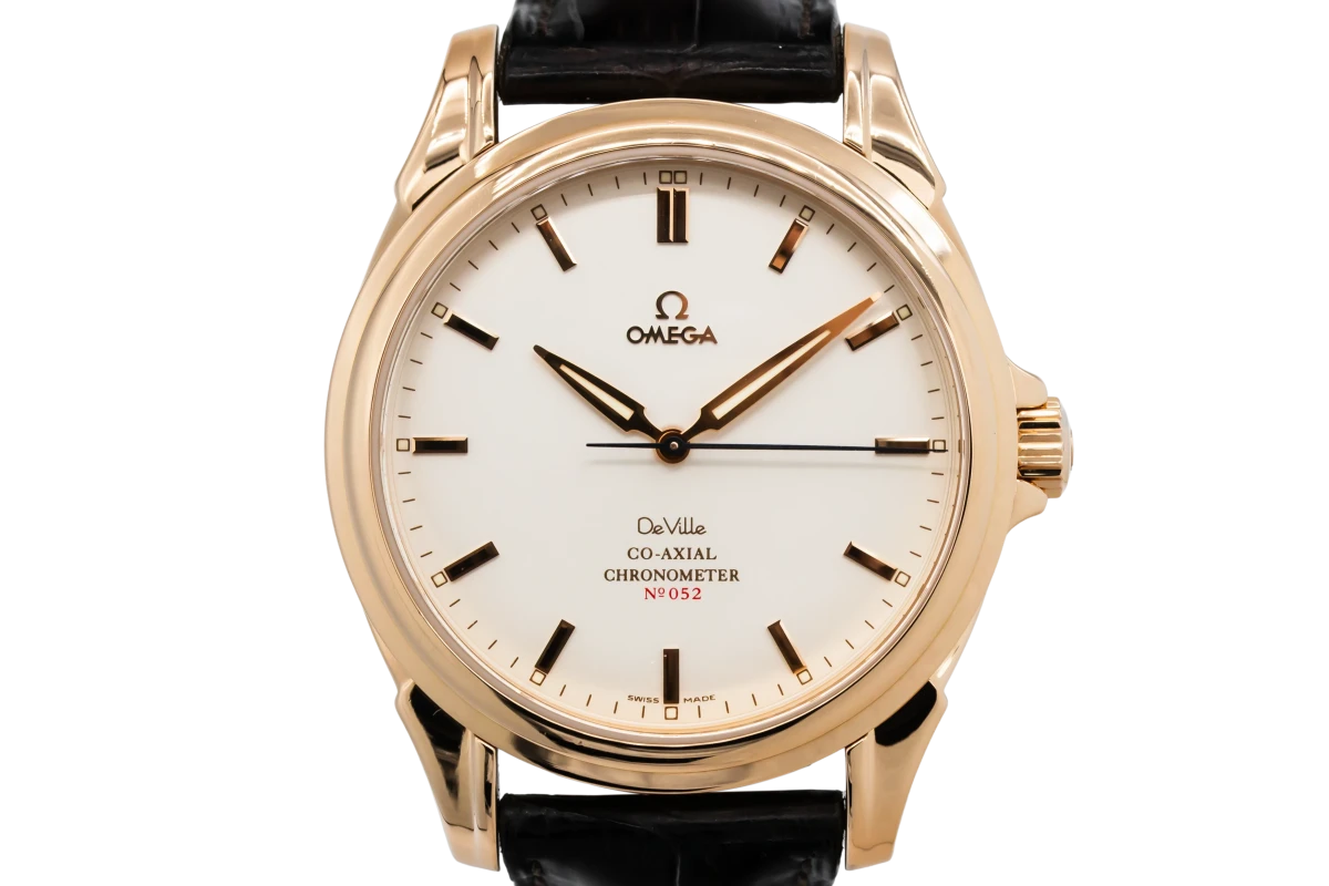 This 2005 OMEGA De Ville Co Axial 46mm features a silver dial with baton markers and a black leather bracelet. It also features a 18ct rose gold smooth bezel.