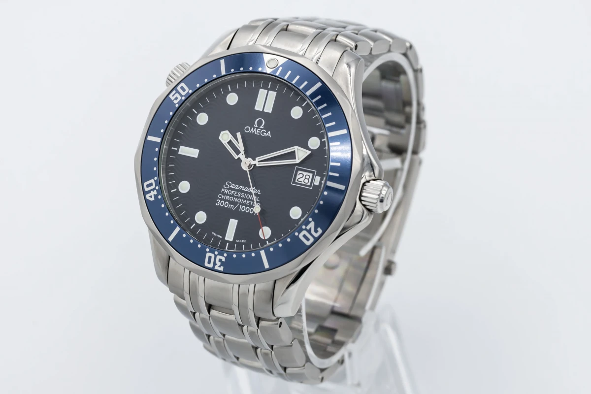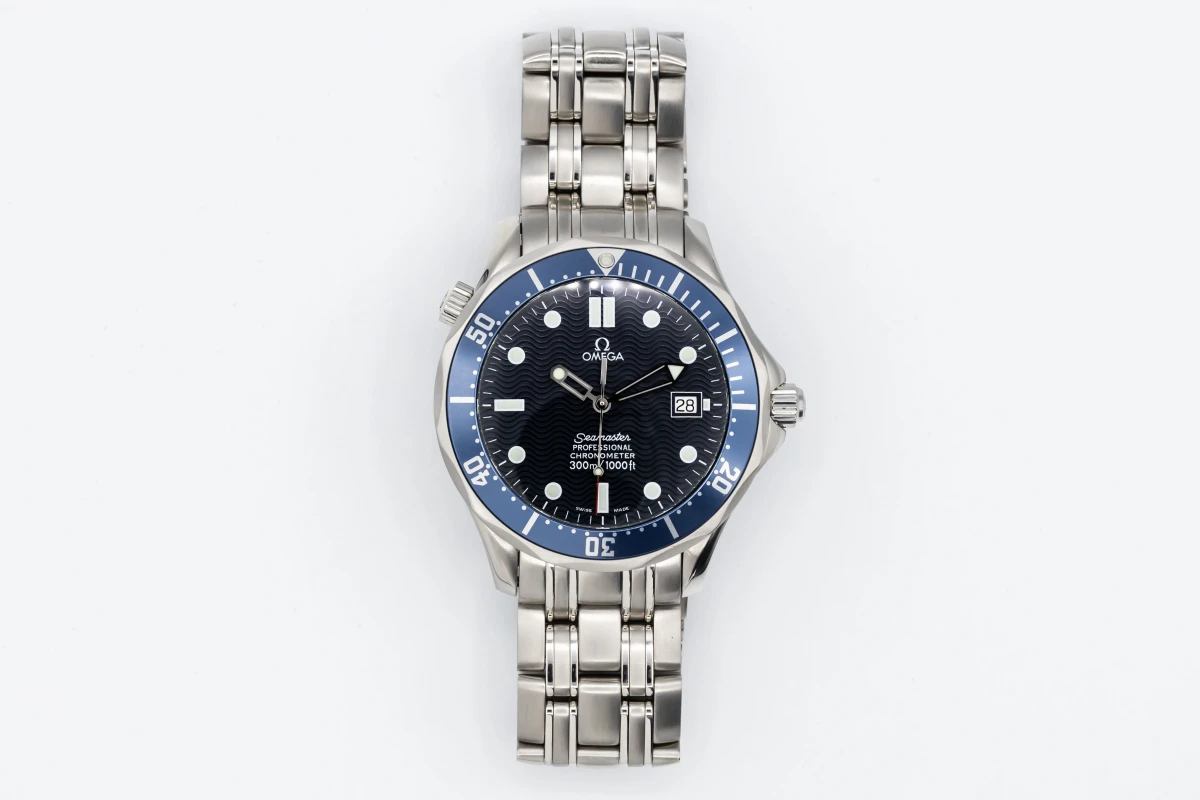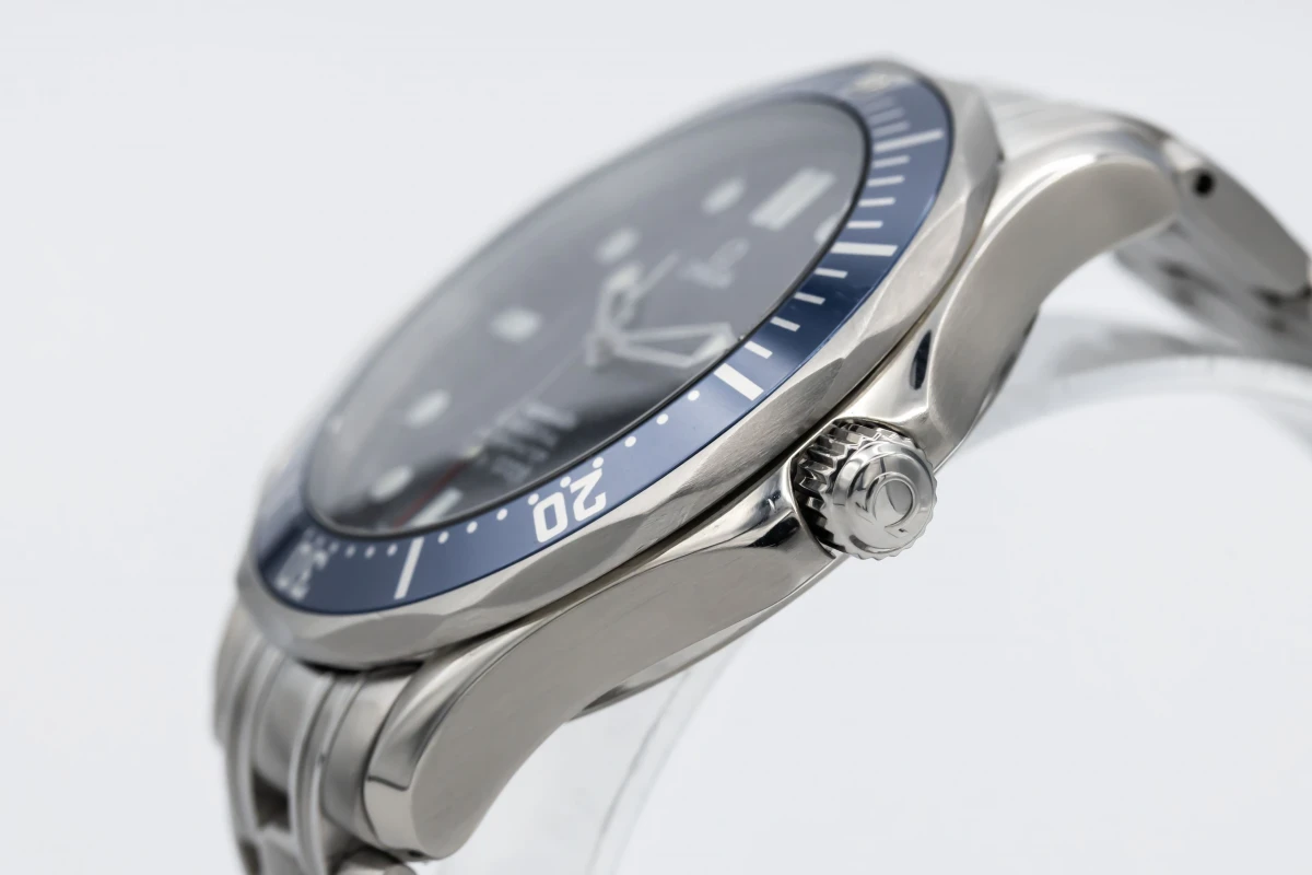 This circa 2003 Omega Seamaster 41mm features a blue dial with baton markers and a stainless steel bracelet. It is also fitted with a blue stainless steel smooth bezel.