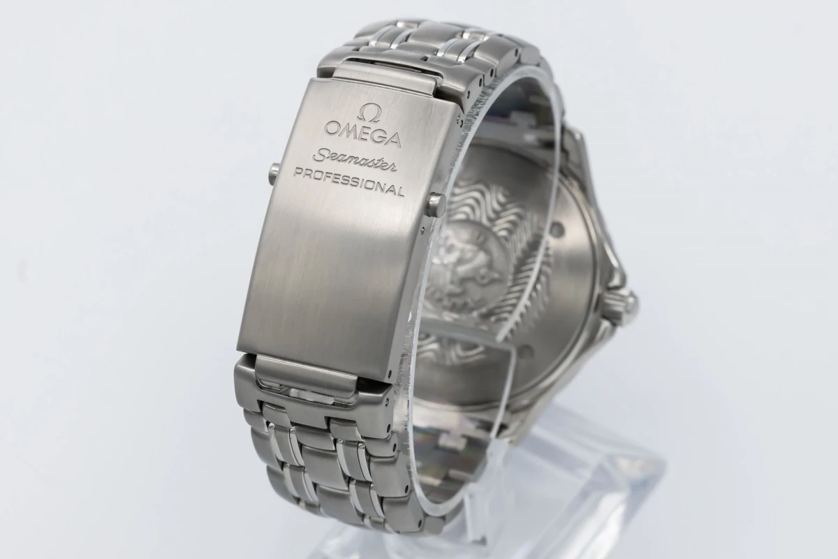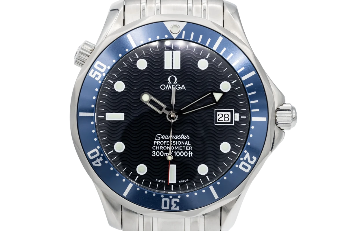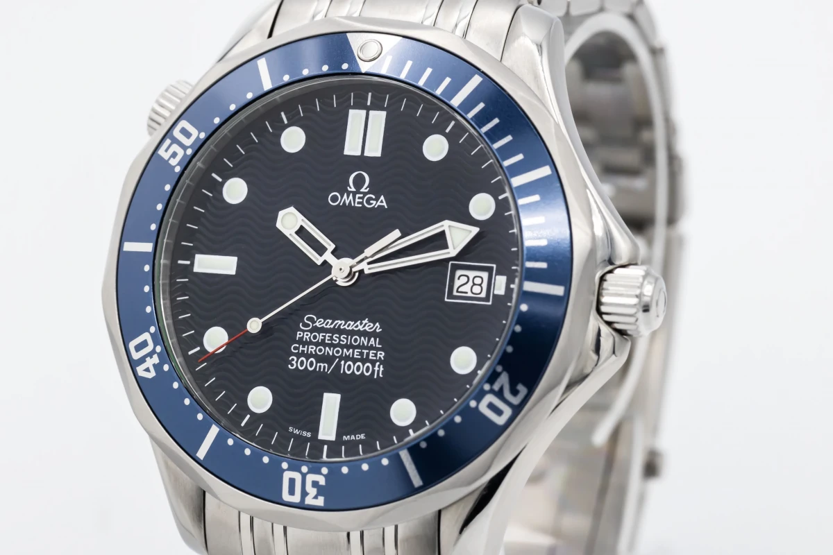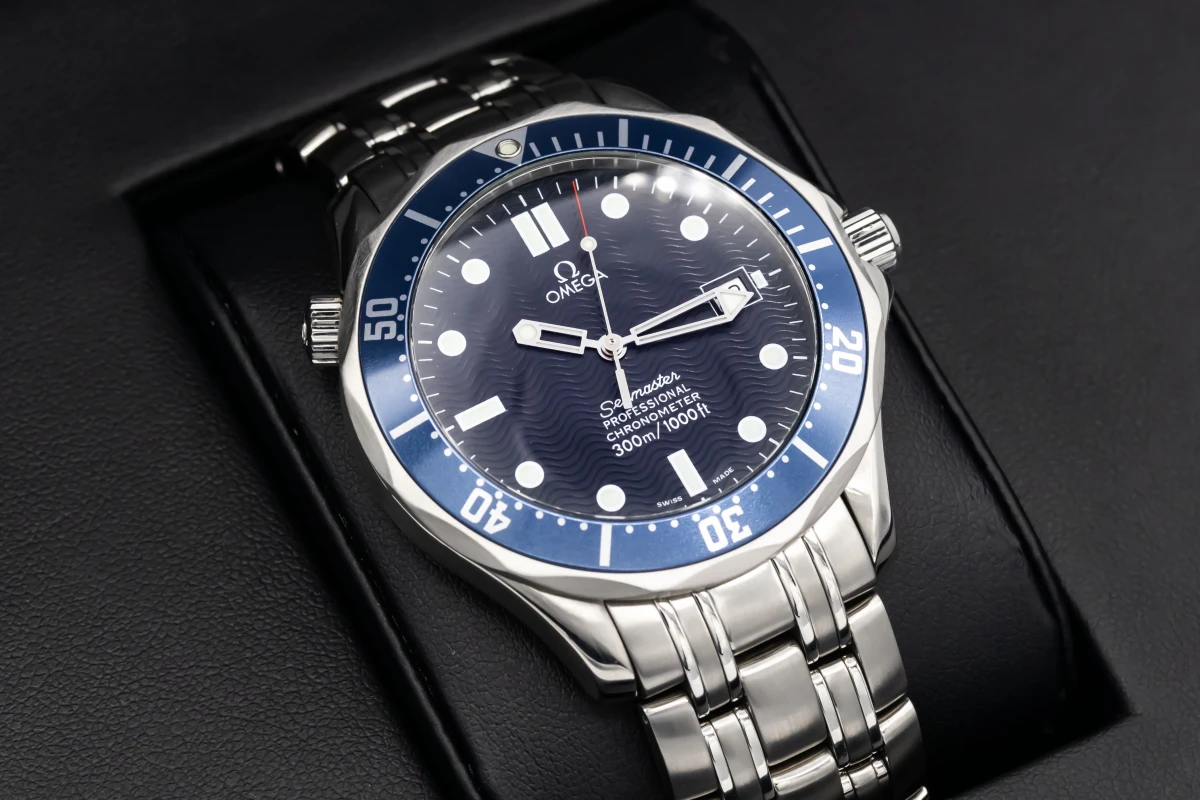 This circa 2003 Omega Seamaster 41mm features a blue dial with baton markers and a stainless steel bracelet. It is also fitted with a blue stainless steel smooth bezel.