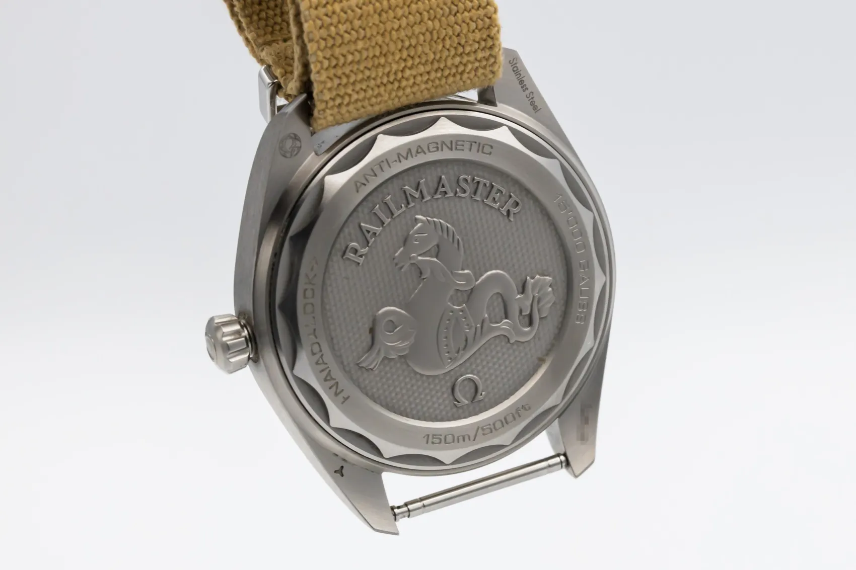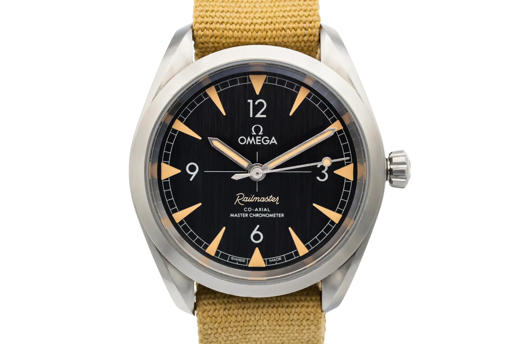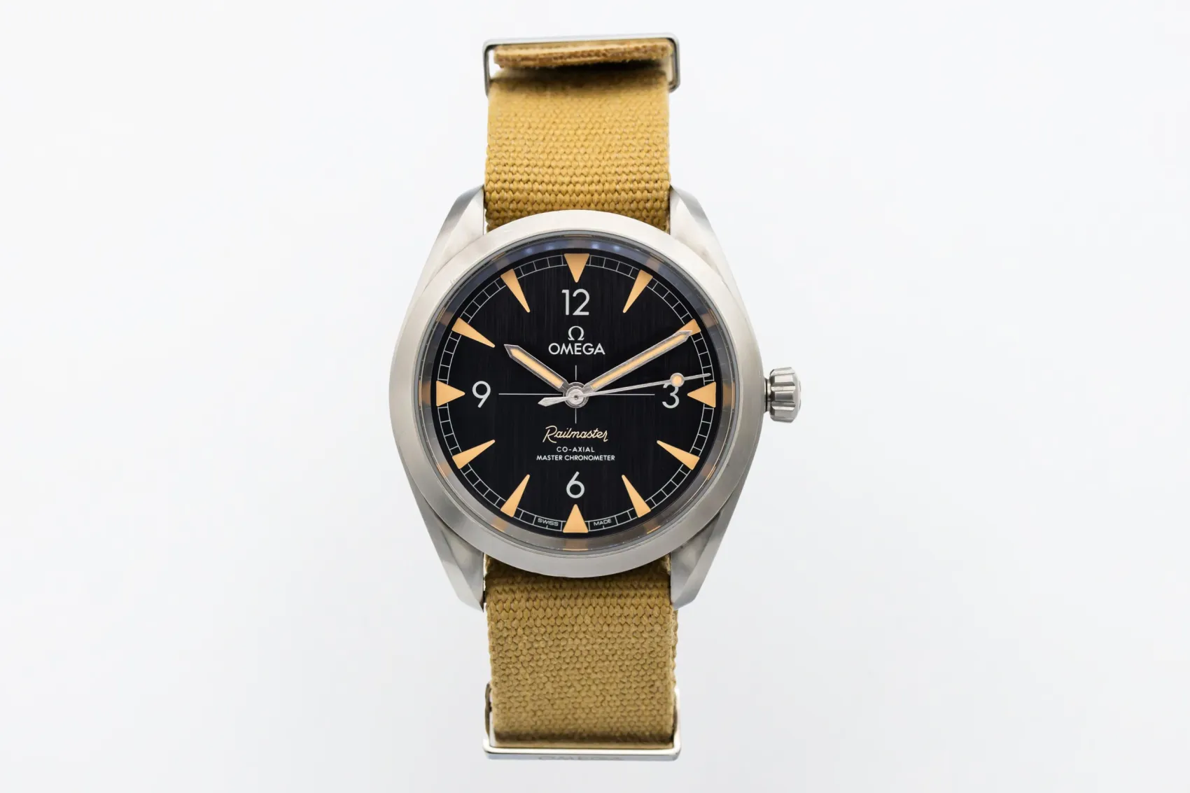 finance this from £54.66 p/m call the shop Read about our Limited Lifetime WarrantyThis 2019 OMEGA Seamaster Railmaster 40mm is a rugged yet refined timepiece crafted in stainless steel. The black dial features large luminous Arabic numerals and vintage-inspired markers for excellent legibility, complemented by a clean three-hand layout. Finished on a beige fabric NATO-style strap.