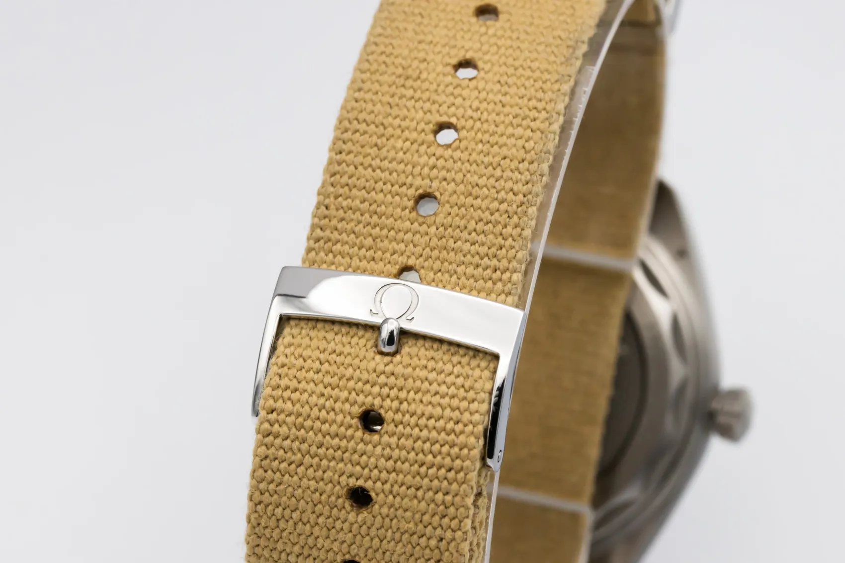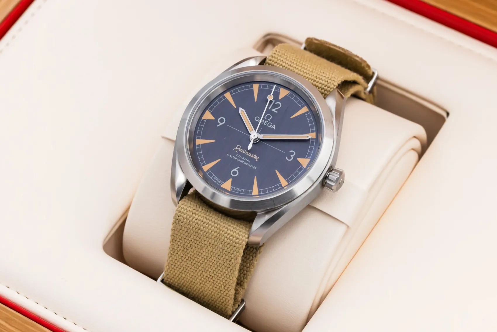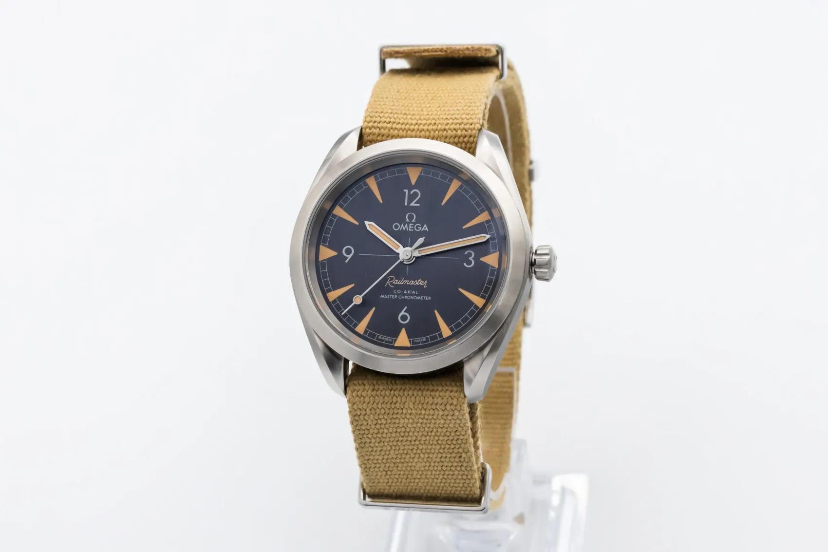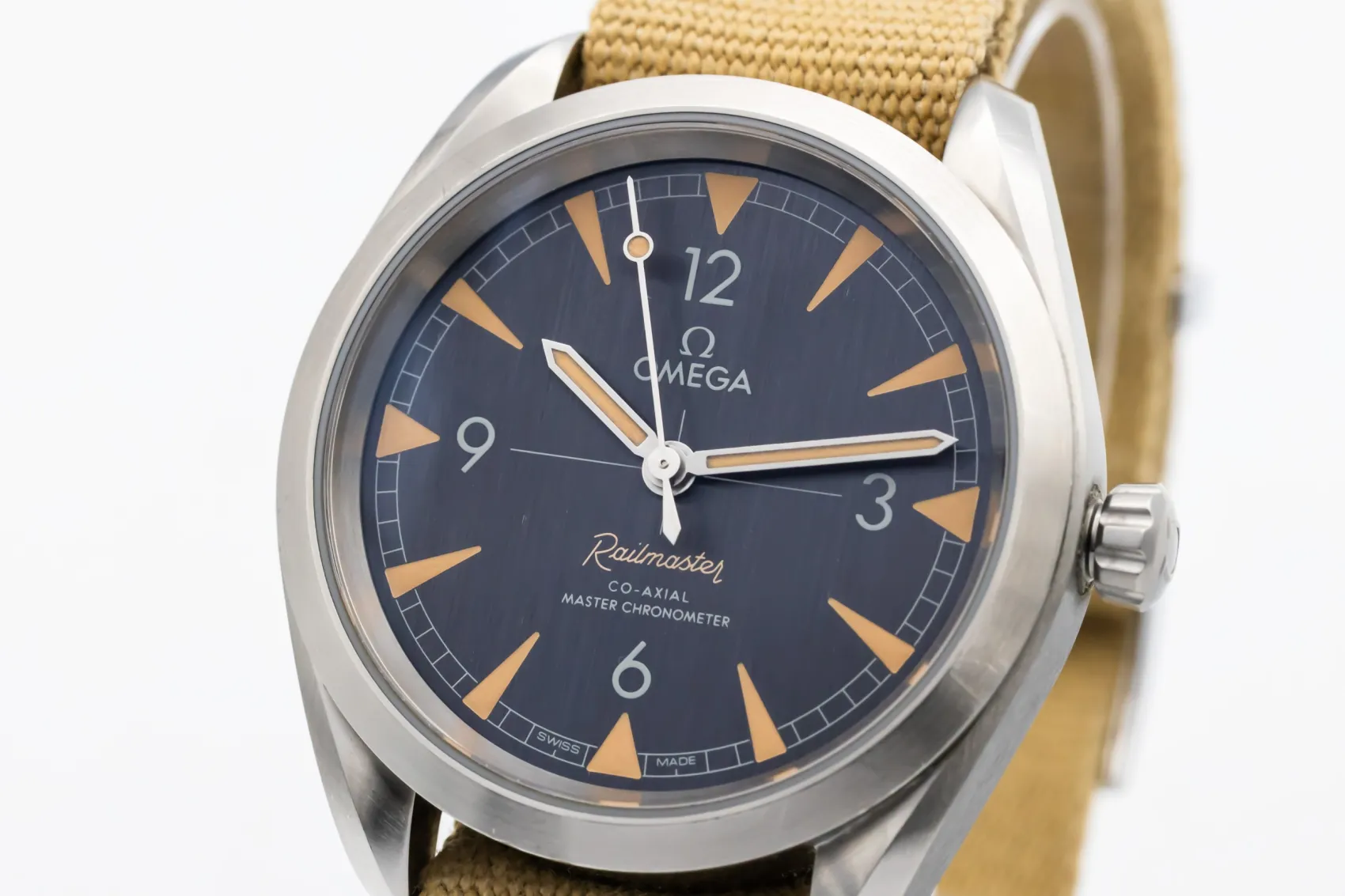 finance this from £54.66 p/m call the shop Read about our Limited Lifetime WarrantyThis 2019 OMEGA Seamaster Railmaster 40mm is a rugged yet refined timepiece crafted in stainless steel. The black dial features large luminous Arabic numerals and vintage-inspired markers for excellent legibility, complemented by a clean three-hand layout. Finished on a beige fabric NATO-style strap.
