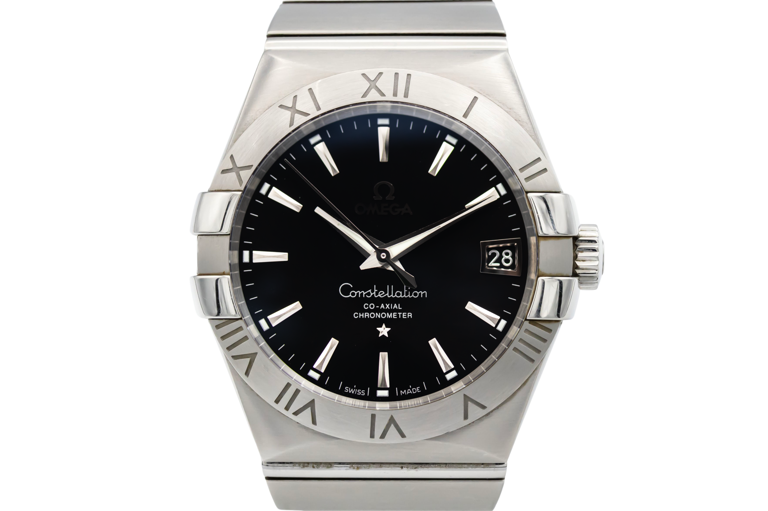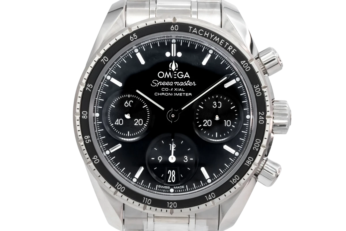 This unworn 2022 Omega speedmaster Co-Axial Chronometer 38mm features a black dial with 3 subdials and rhodium-plated indexes and hands. It is also fitted with a stainless steel bracelet and a stainless steel case and bezel which includes a tachymeter scale on a black aluminum ring.