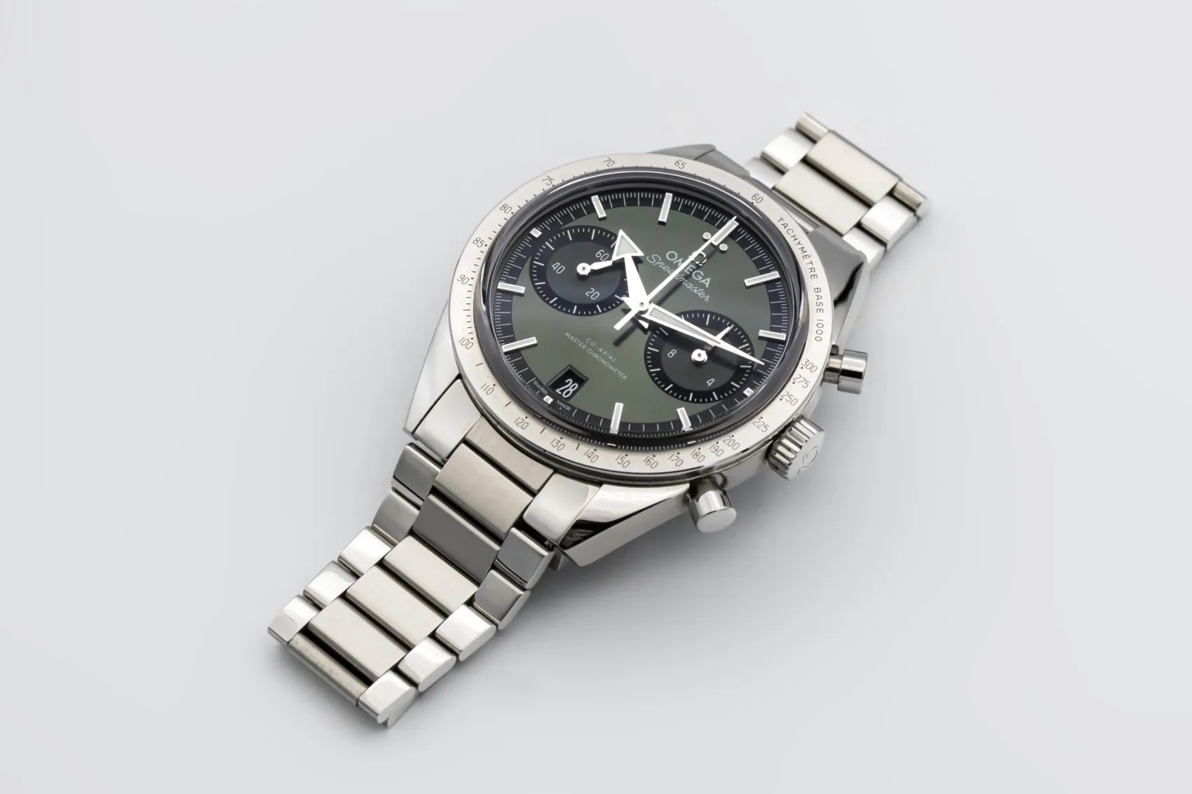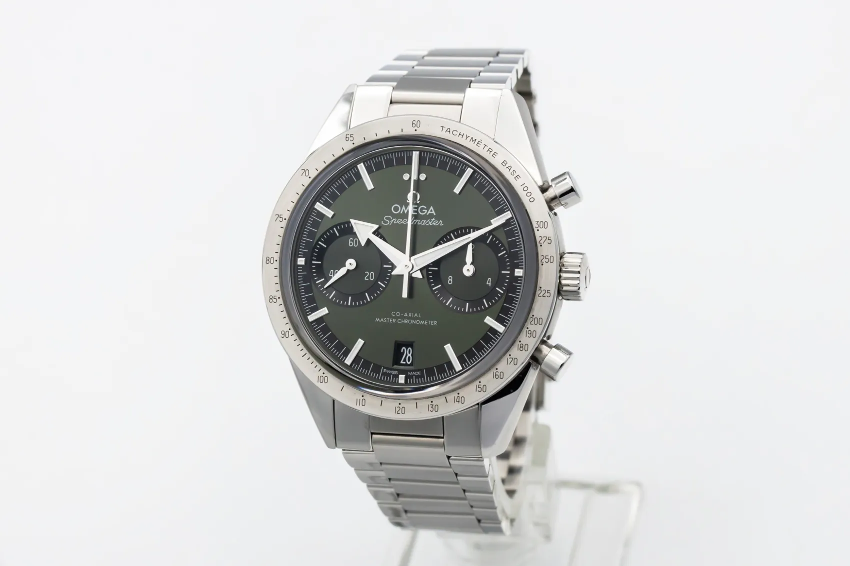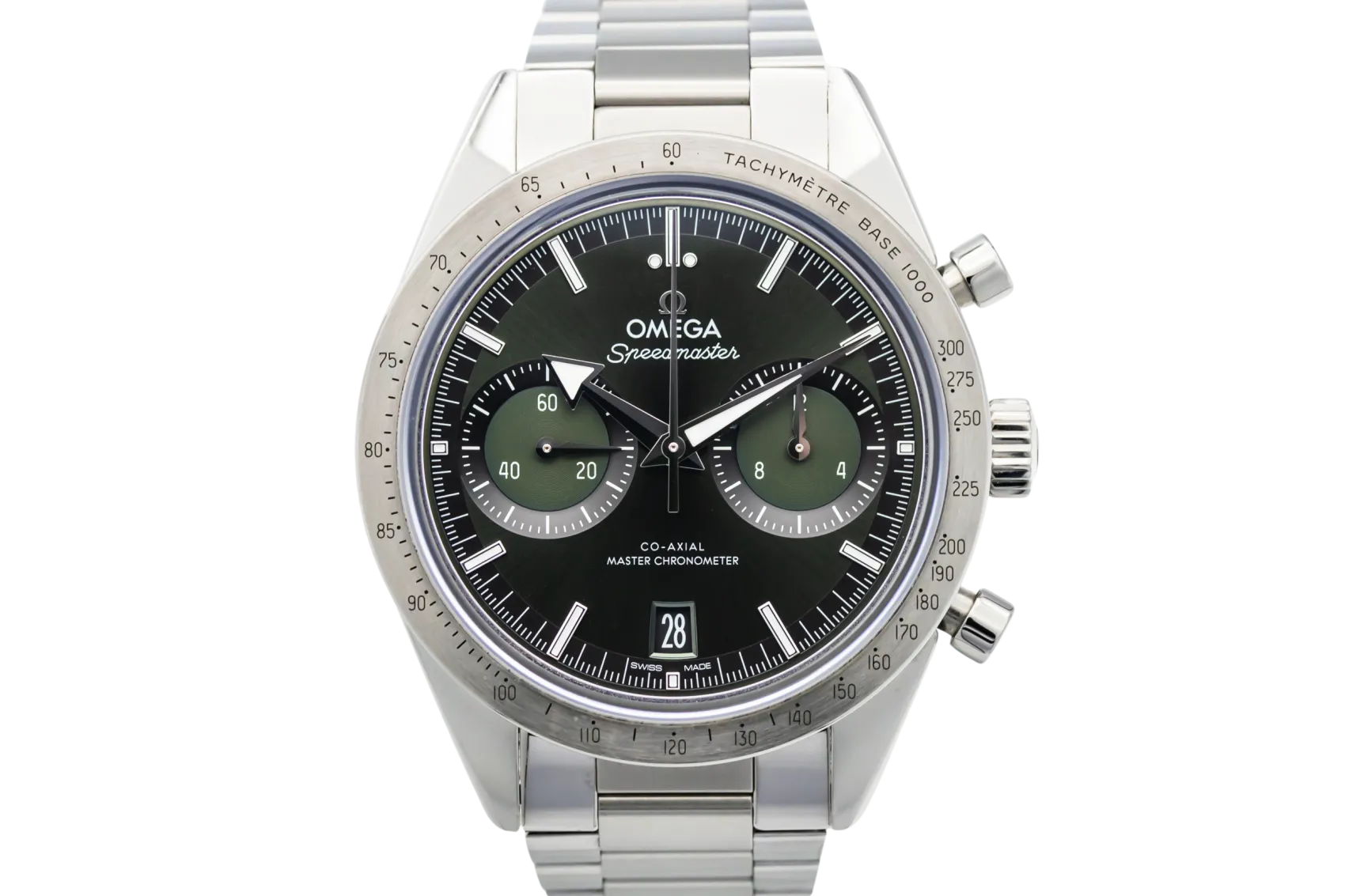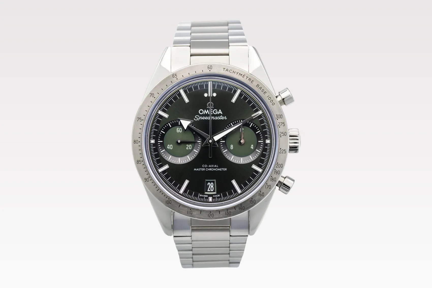 finance this from £93.76 p/m call the shop Read about our Limited Lifetime WarrantyThis 2023 OMEGA Speedmaster ’57 40.5mm is a refined chronograph crafted entirely in stainless steel. The striking green dial features applied hour markers and contrasting chronograph sub-dials for excellent legibility, complemented by a tachymeter scale inspired by the original 1957 Speedmaster. Finished on the classic stainless steel bracelet.