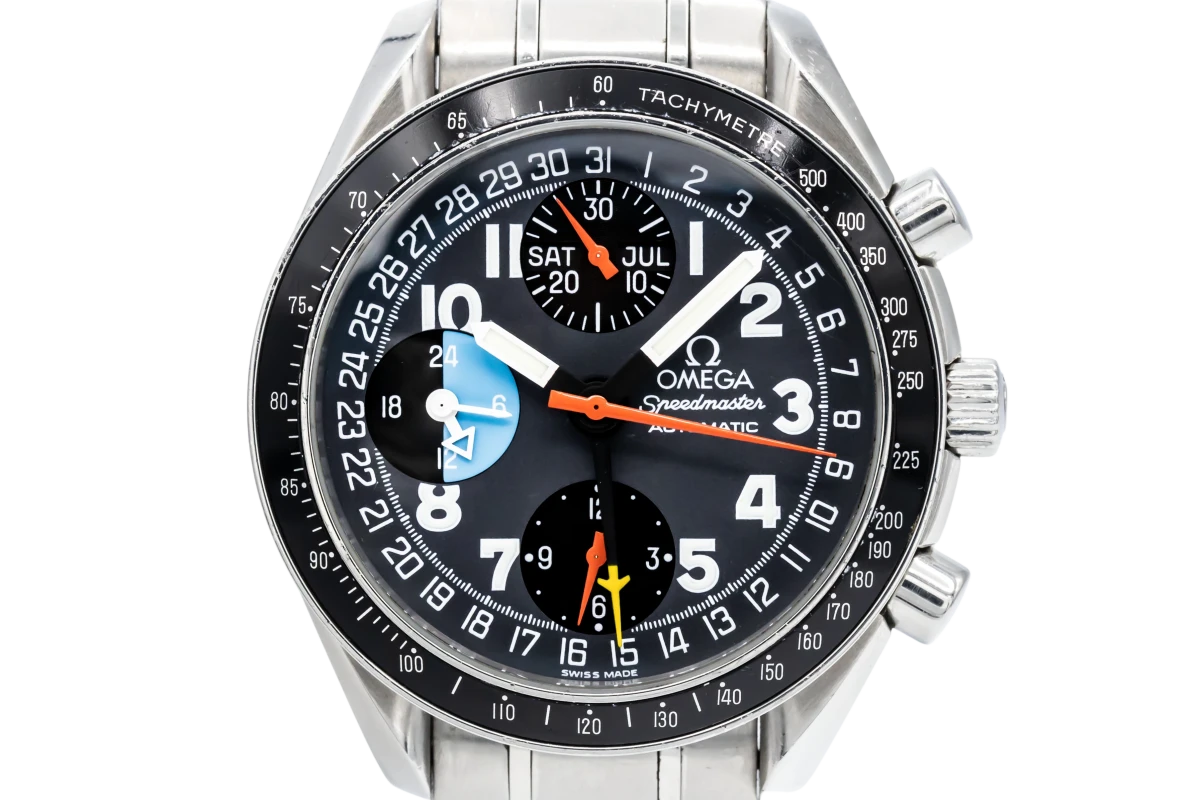This circa 1995 Omega Speedmaster Chronograph 'Michael Schumacher limited edition' 39mm features a super rare triple date black Tritium dial. An original Omega stainless steel bracelet with folding clasp. It also features a Tachymetric scale bezel, on black quoted steel.
