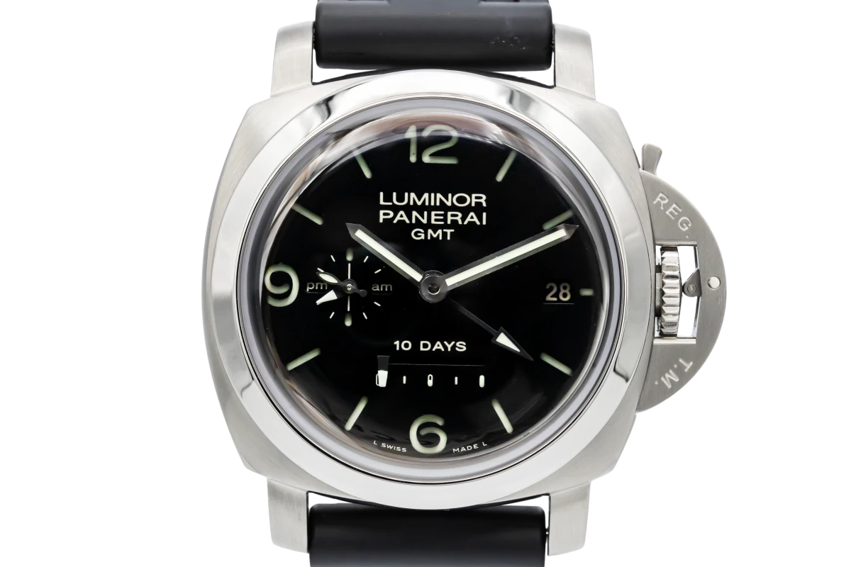 This 2008 Panerai 10 Day GMT 44mm features a black dial with baton markers and a black rubber bracelet. It also features a smooth stainless steel bezel.