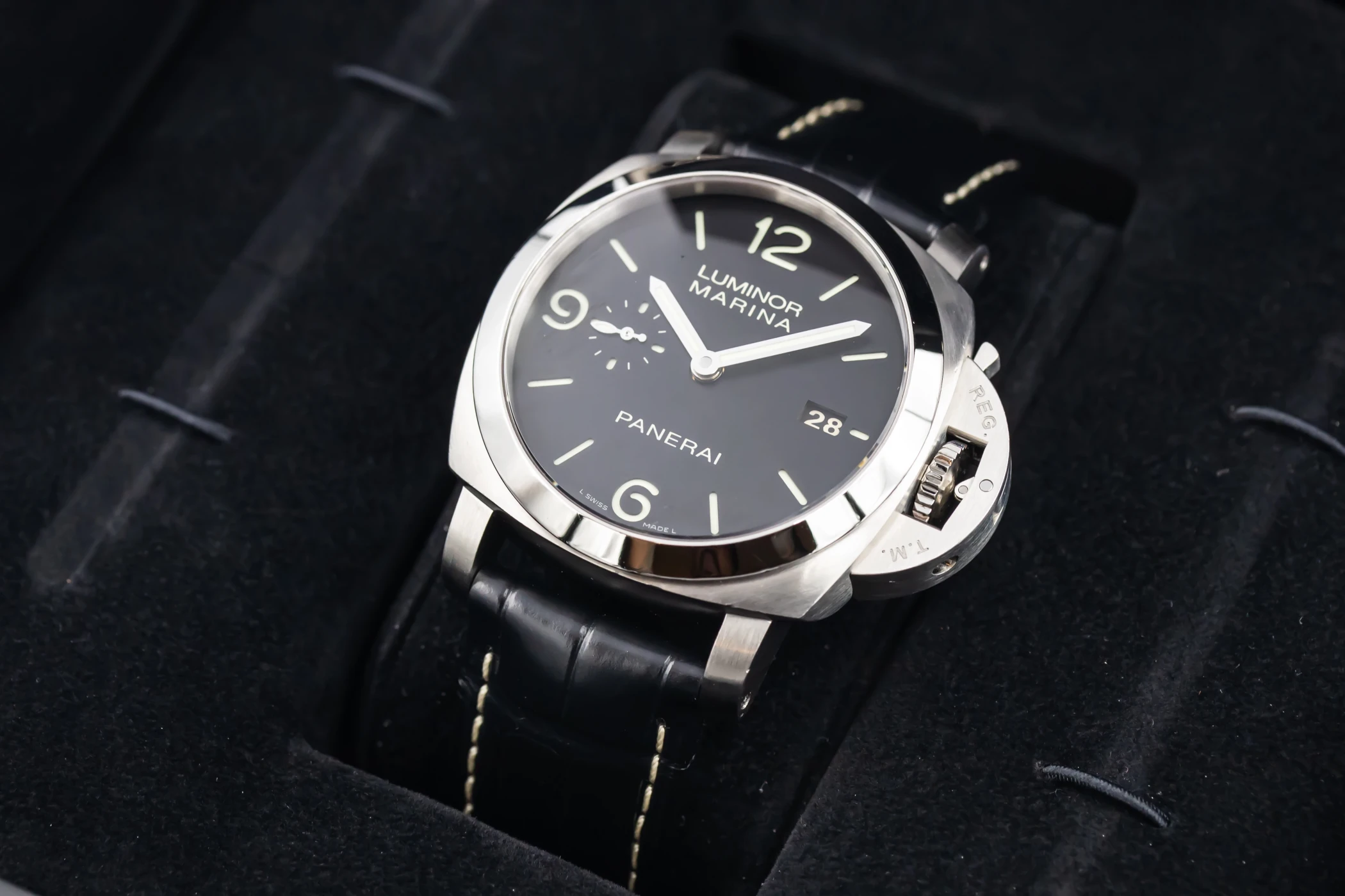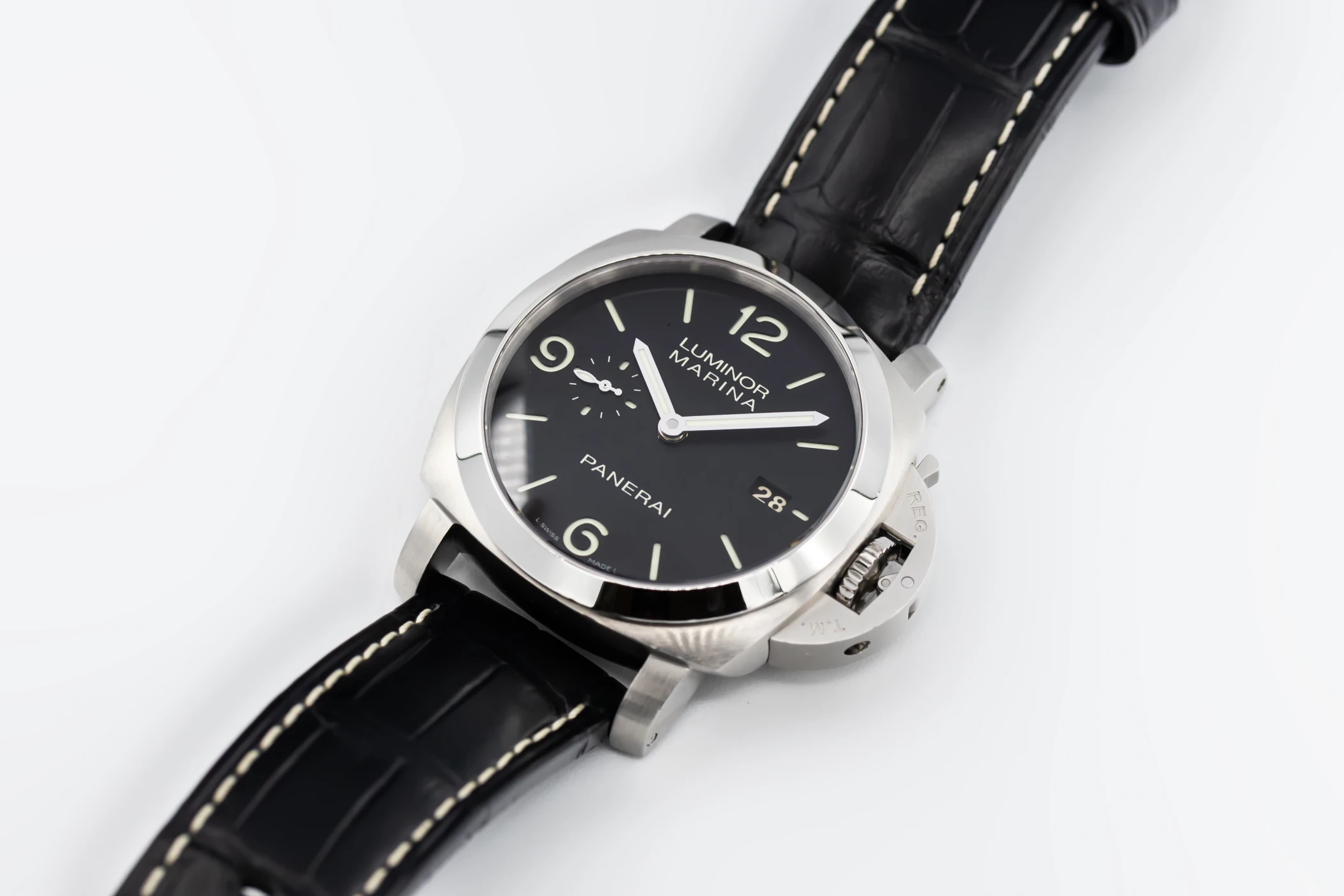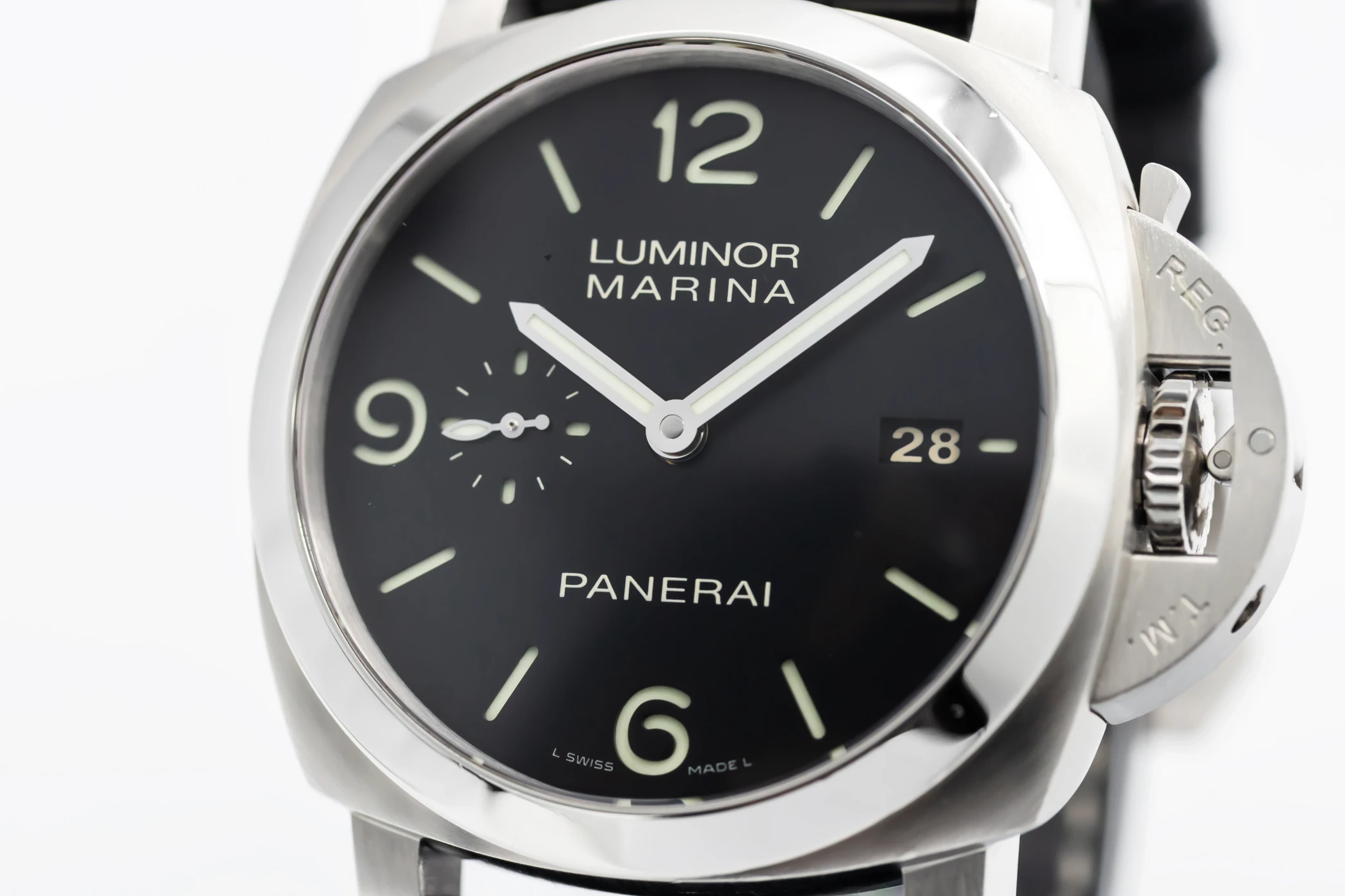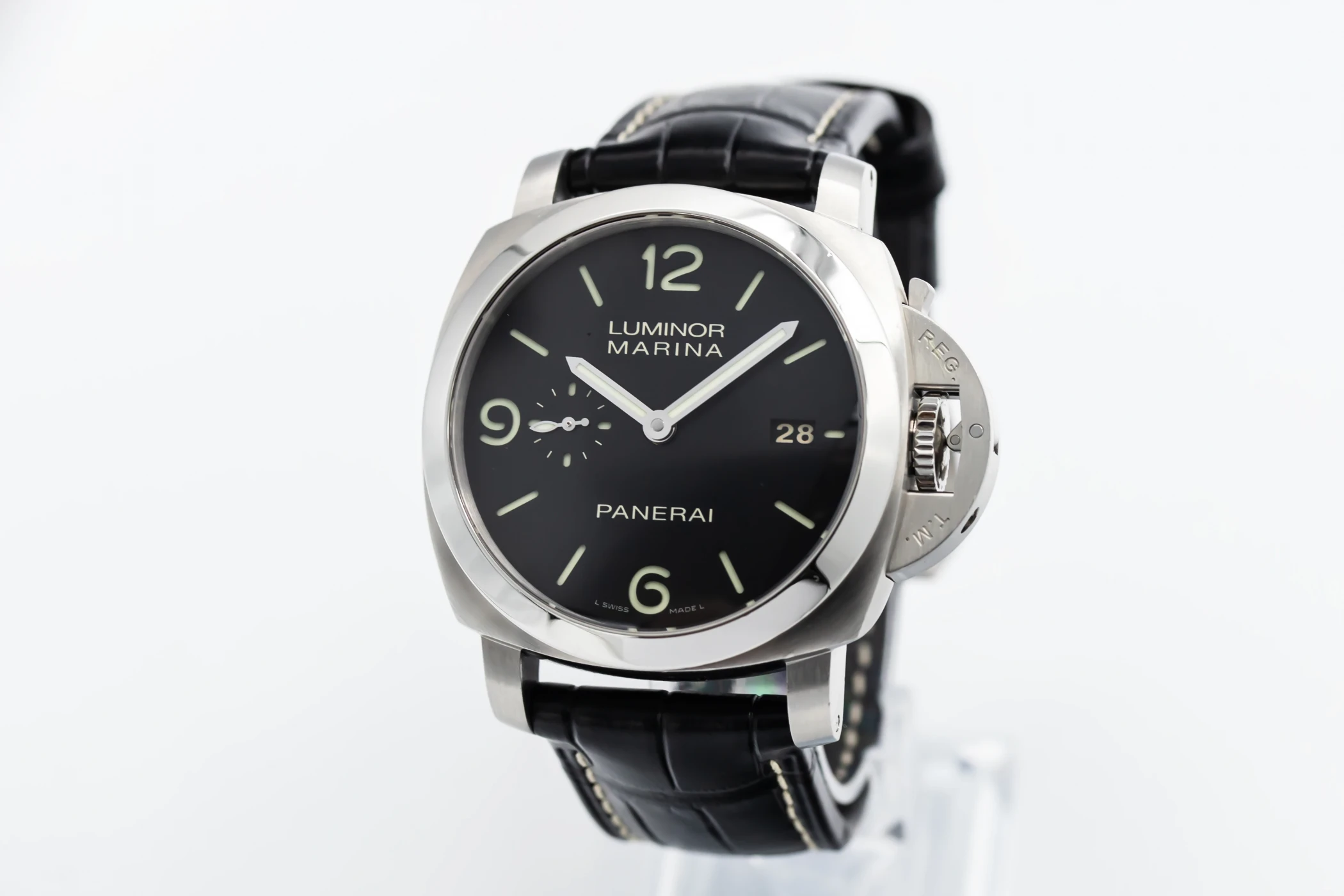 finance this from £67.17 p/m call the shop Read about our Limited Lifetime WarrantyThis circa 2012 Panerai Luminor Marina Auto 44mm features a black dial with arabic numerals and a black leather strap. It also features a stainless steel smooth bezel.