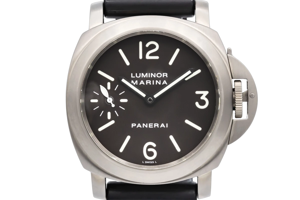 This 2001 Titanium Panerai Luminor Base Logo 44mm features a black dial with numeral and baton markers and a black rubber strap.
