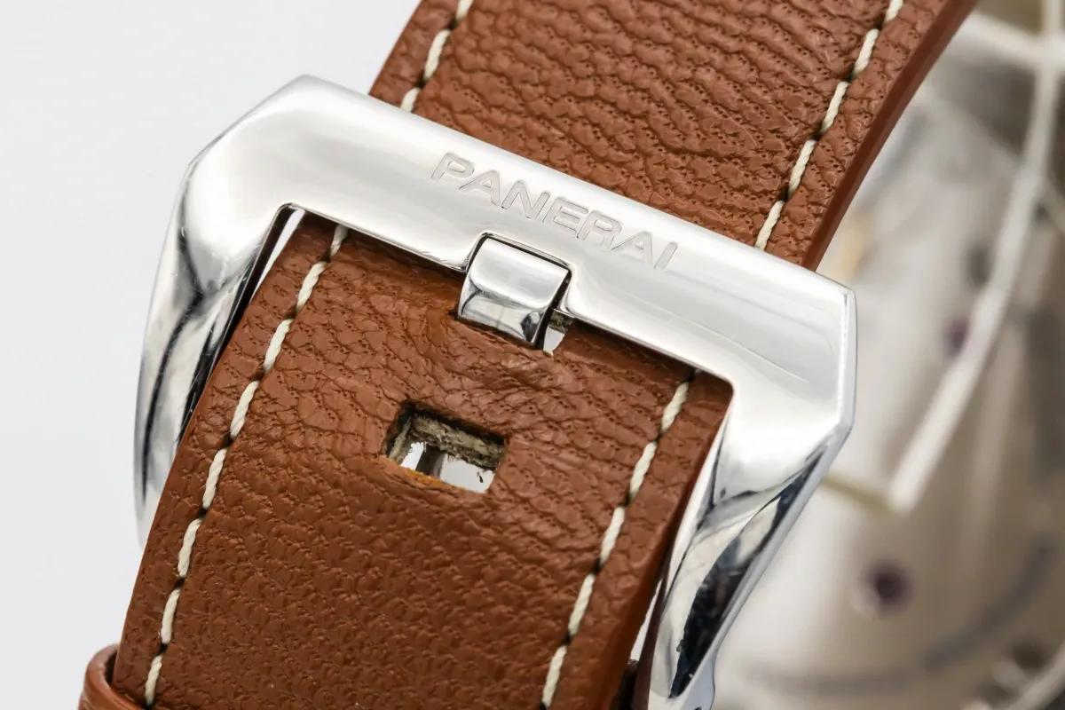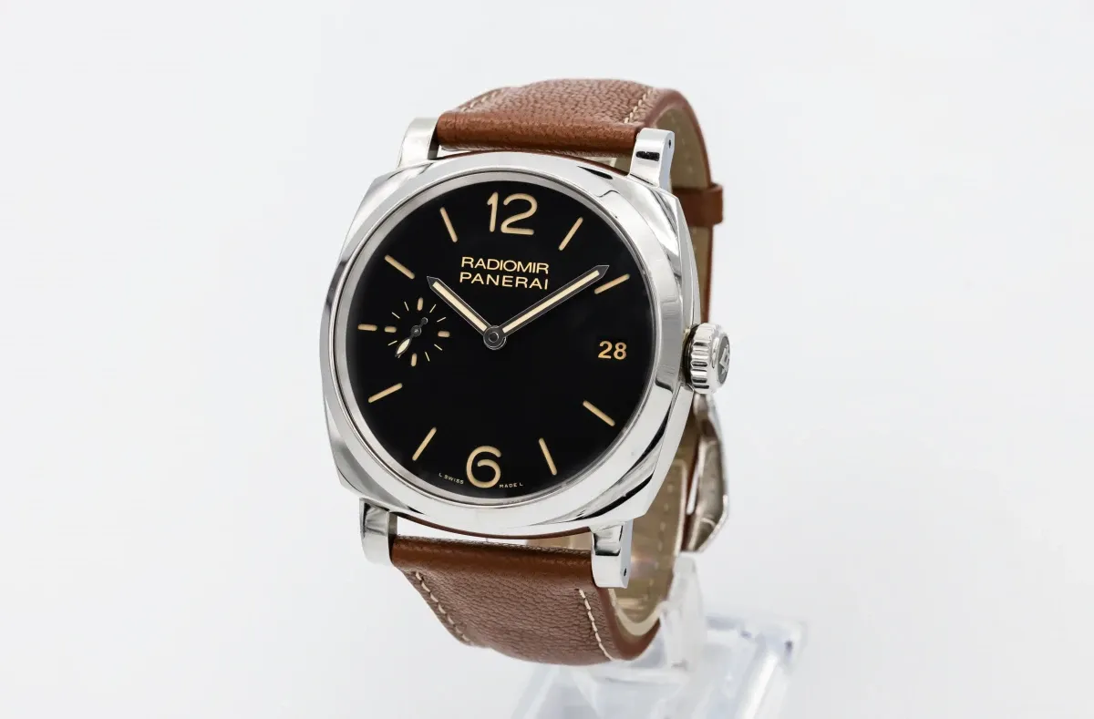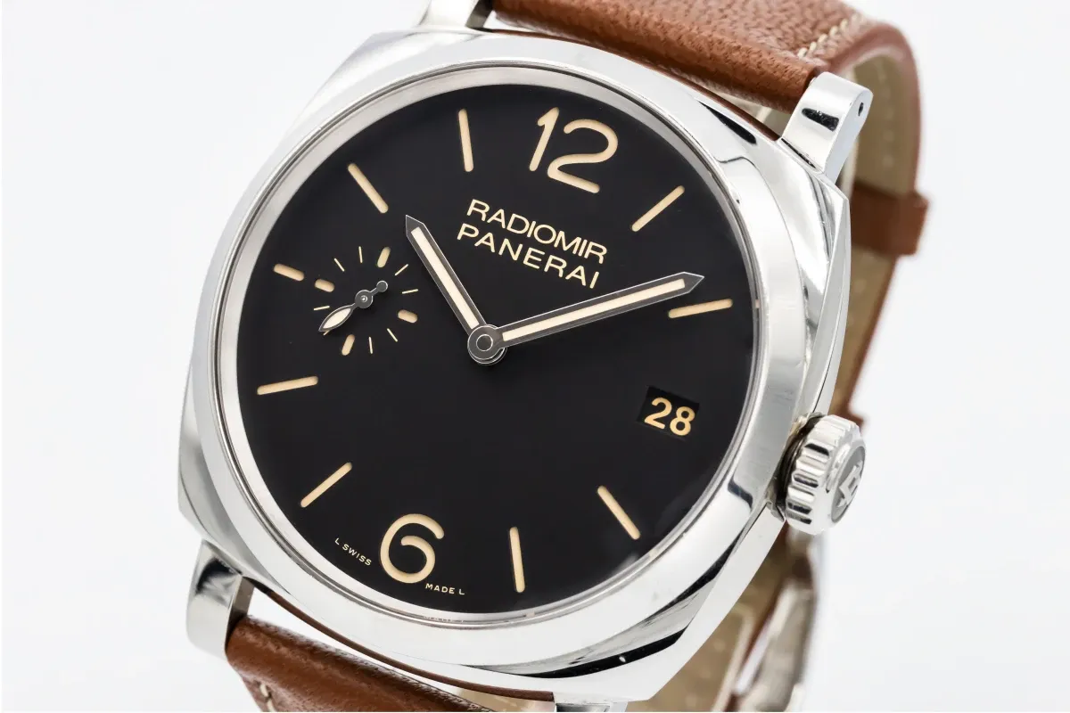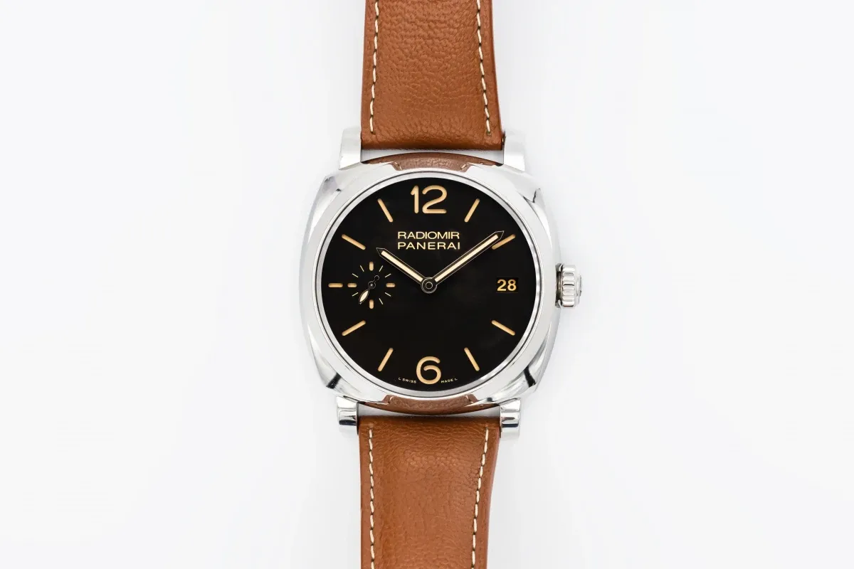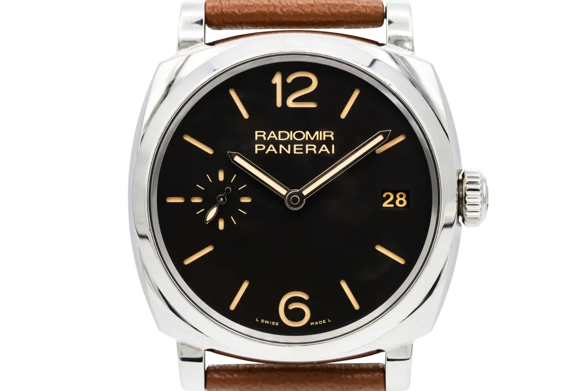 This 2014 Panerai Radiomir 47mm features a black dial that showcases luminous Arabic numerals and baton hour markers in Panerai’s signature sandwich-style layout. A smooth polished bezel enhances the watch’s clean silhouette, while the brown leather strap adds warmth and classic character.