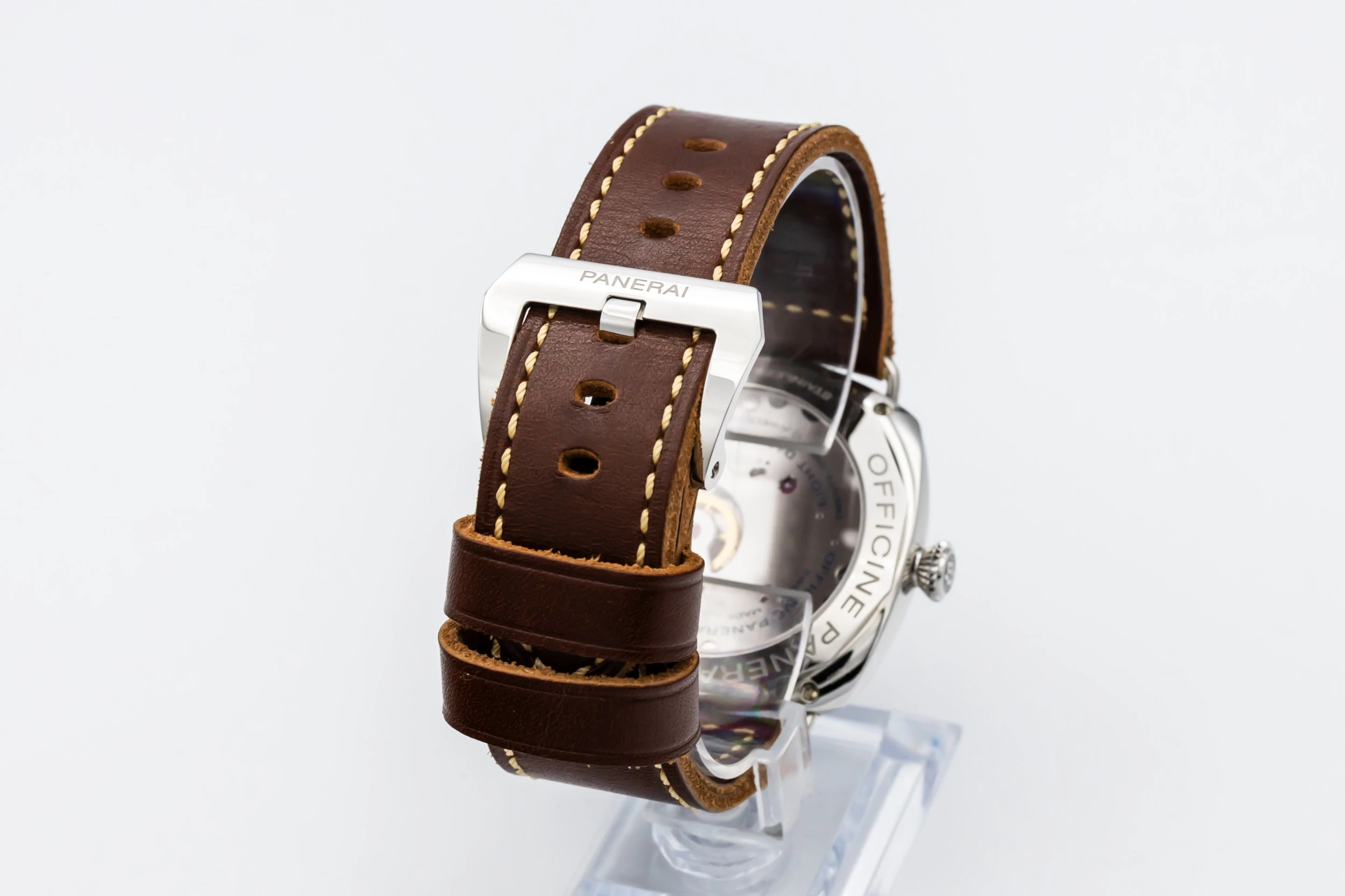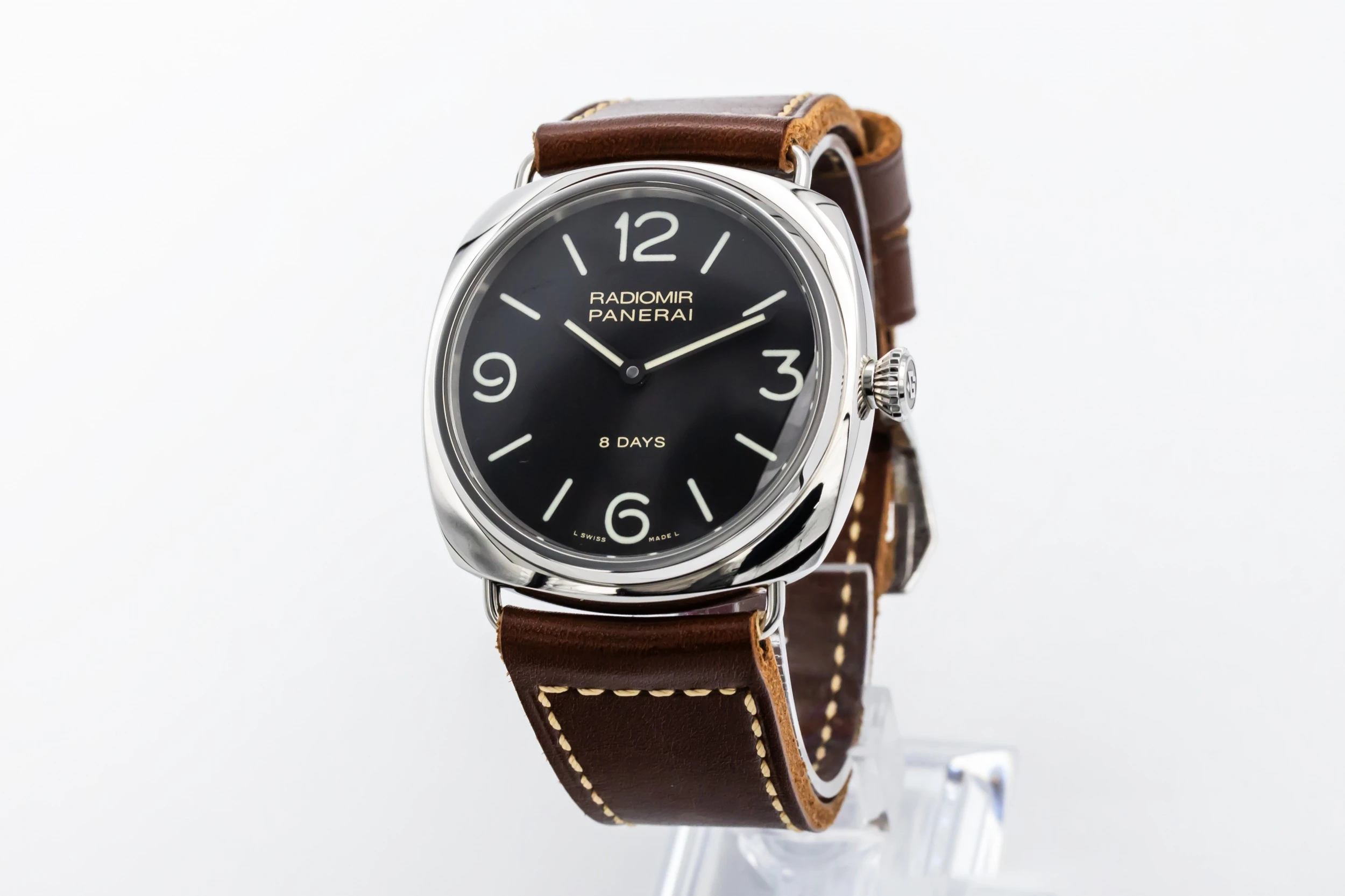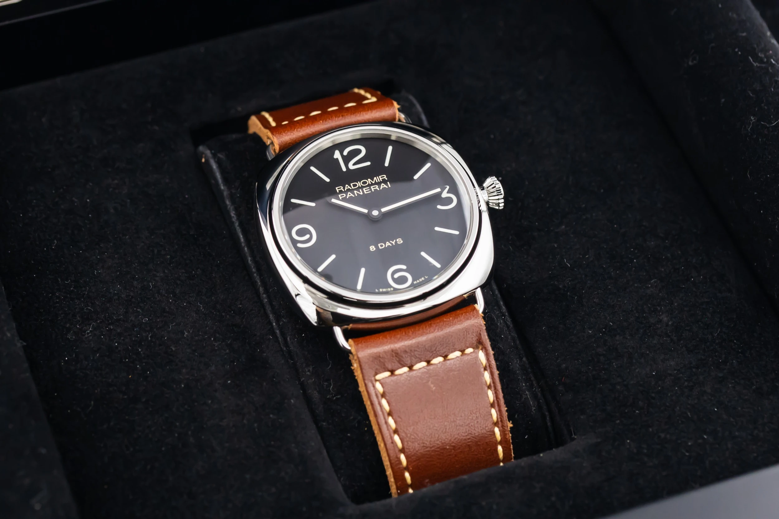 The 2017 Panerai Radiomir features a robust 45mm stainless steel cushion-shaped case paired with a rich brown leather strap that accentuates its vintage military-inspired character. Its clean black sandwich dial showcases luminous Arabic numerals and baton indices, along with a small seconds sub-dial at 9 o’clock.