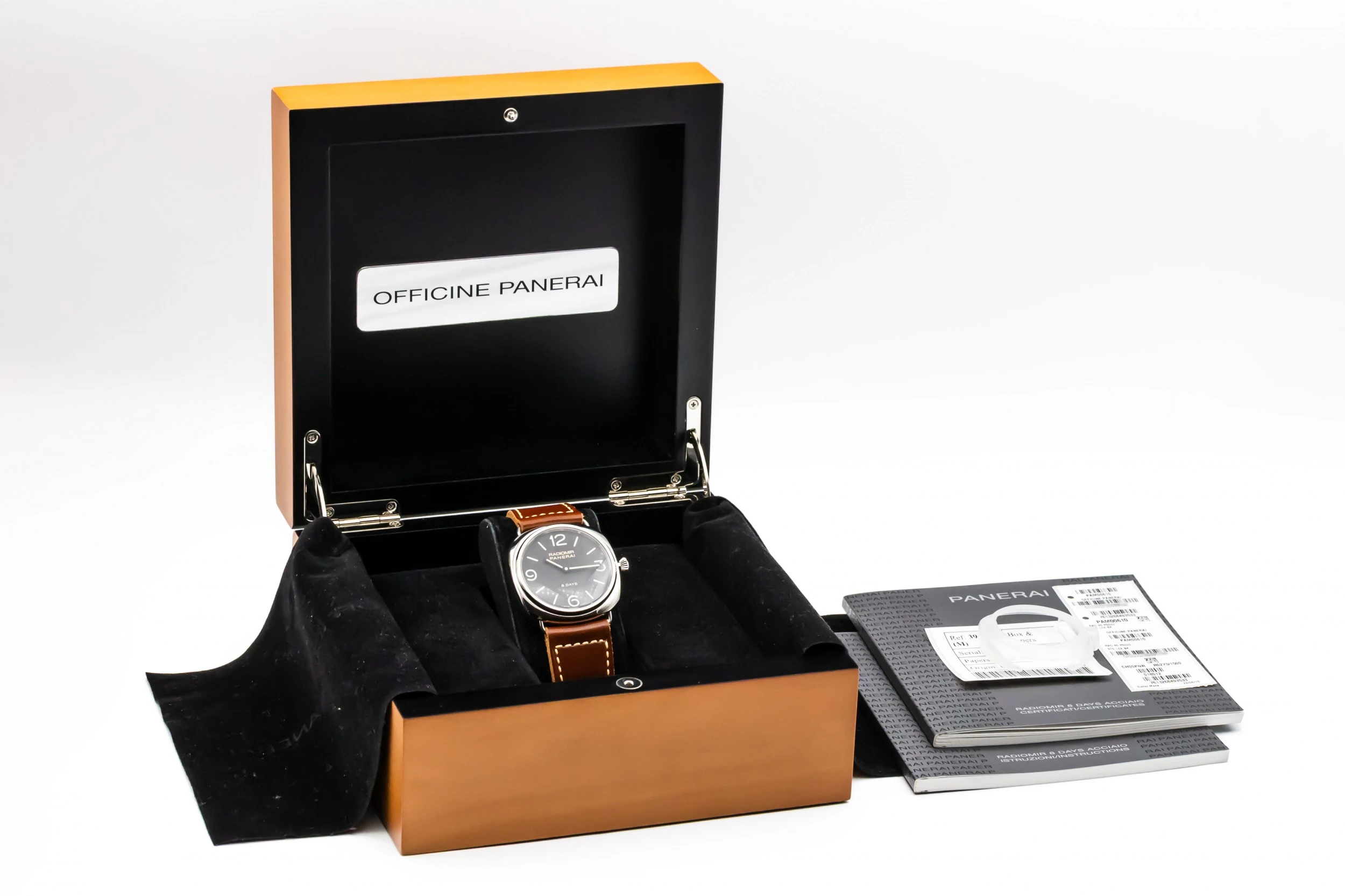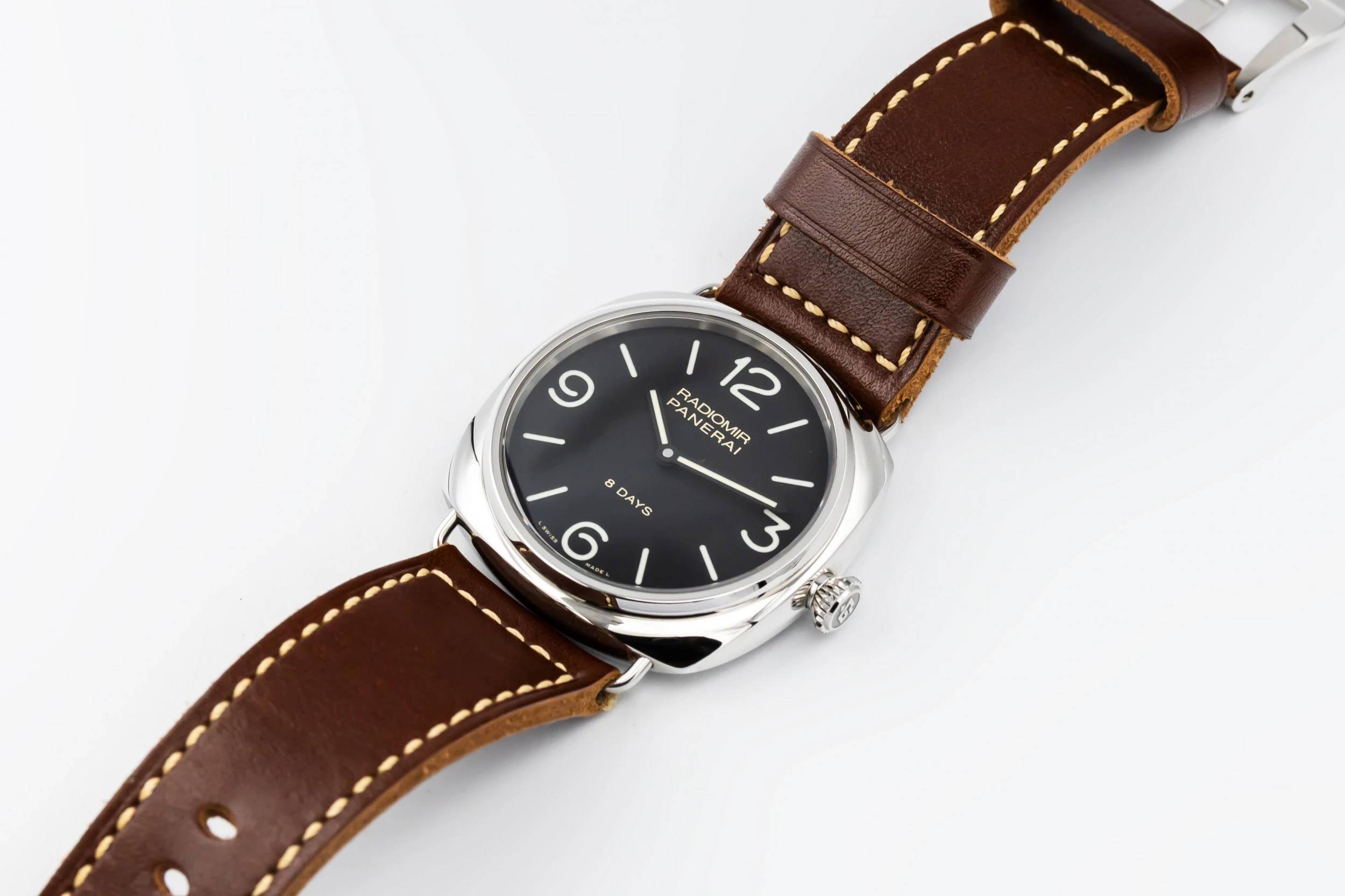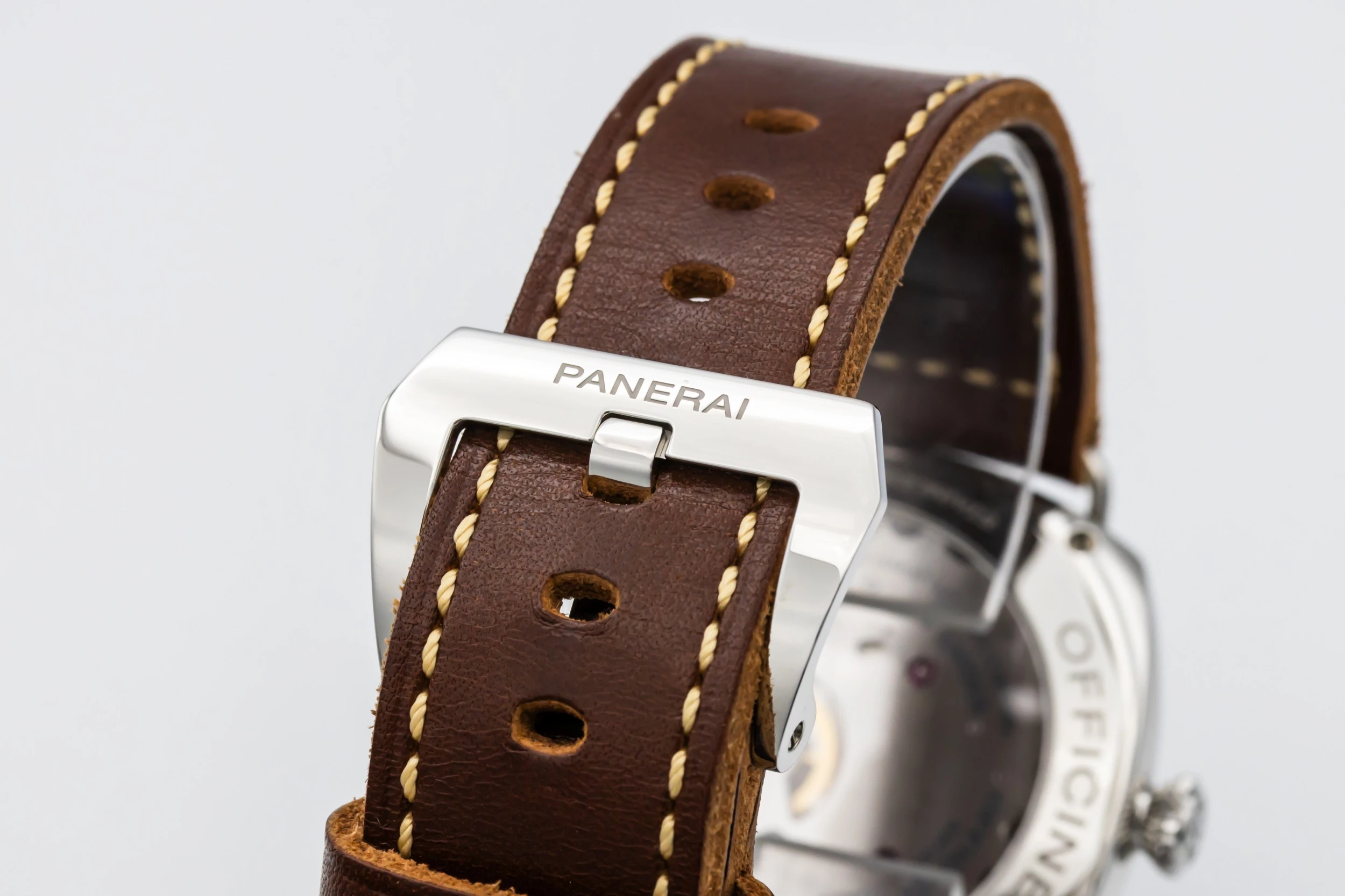The 2017 Panerai Radiomir features a robust 45mm stainless steel cushion-shaped case paired with a rich brown leather strap that accentuates its vintage military-inspired character. Its clean black sandwich dial showcases luminous Arabic numerals and baton indices, along with a small seconds sub-dial at 9 o’clock.