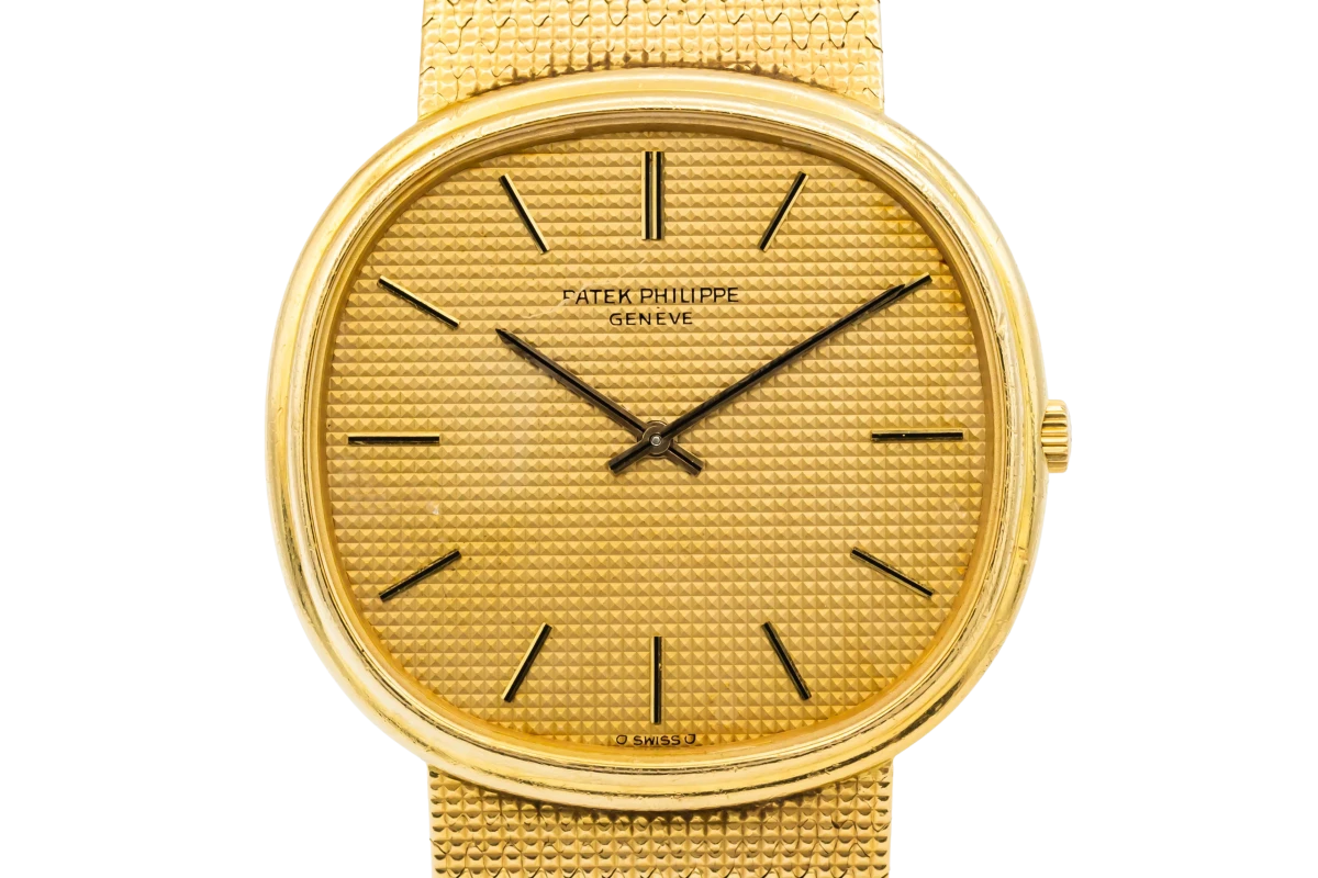 This circa 1979 Patek Philippe Ellipse Jumbo 36mm features a champagne dial with baton markers and a 18ct yellow gold braclet. It also features a 18ct yellow gold smooth bezel.
