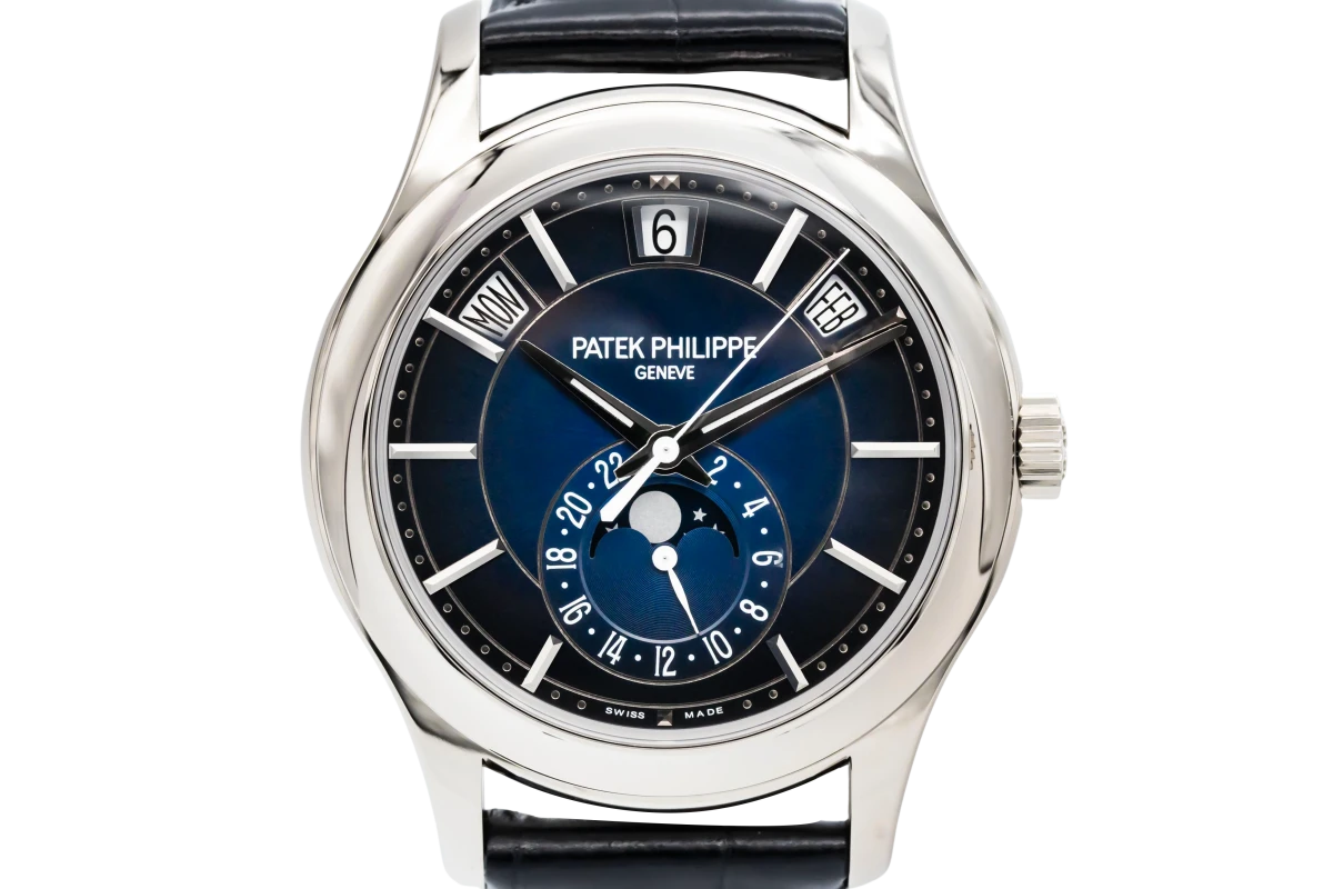 This 2023 Patek Philippe Annual Calendar 40mm features a blue sunburst dial. The 18ct white gold case is paired with a refined black alligator leather strap.The Annual Calendar complication displays the day, date, and month through apertures at 10 o'clock, 12 o'clock, and 2 o'clock, respectively. The beautifully detailed moonphase indicator, combined with a 24-hour subdial, is positioned gracefully at 6 o'clock.