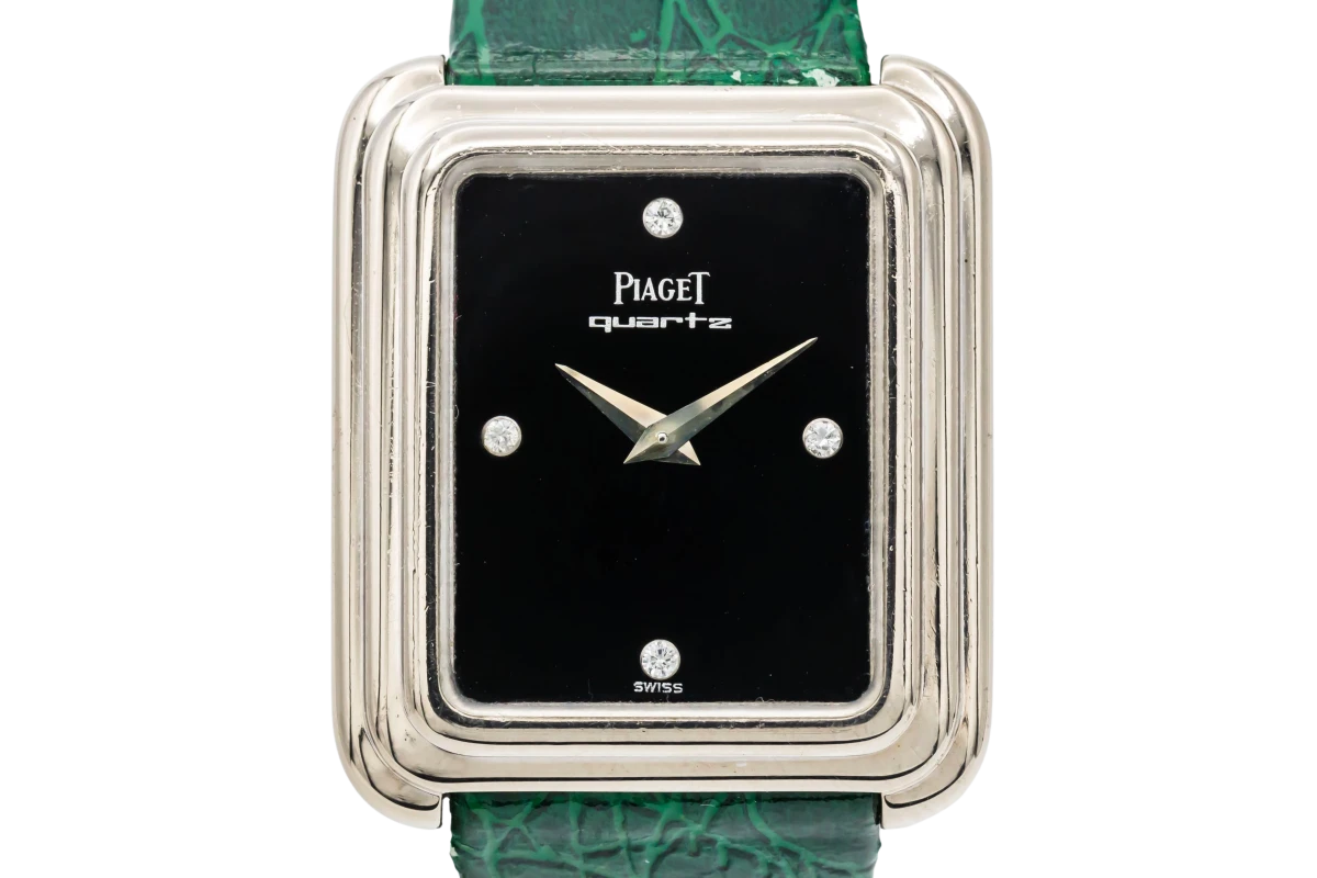 This circa 1980s Piaget Protocole 26mm features a black onyx dial with simple baton hour markers and slim hands for an understated yet distinguished aesthetic. The compact 26mm dimensions make it an ideal fine dress watch, offering timeless style on the wrist with a classic profile. The striking green leather strap enhances the watch’s sophisticated charm.