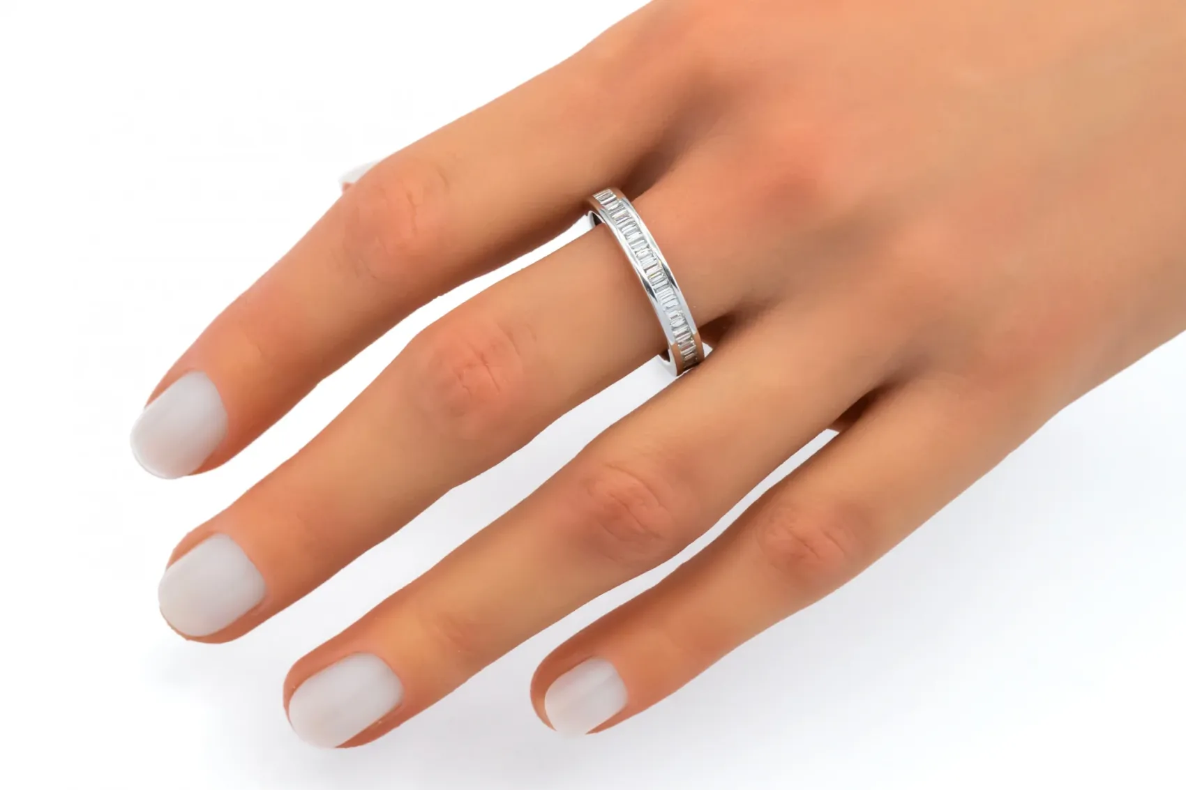 This timeless platinum eternity ring is set with 0.68ct of baguette cut diamonds, graded G colour with SI1 clarity for exceptional brilliance and style.
