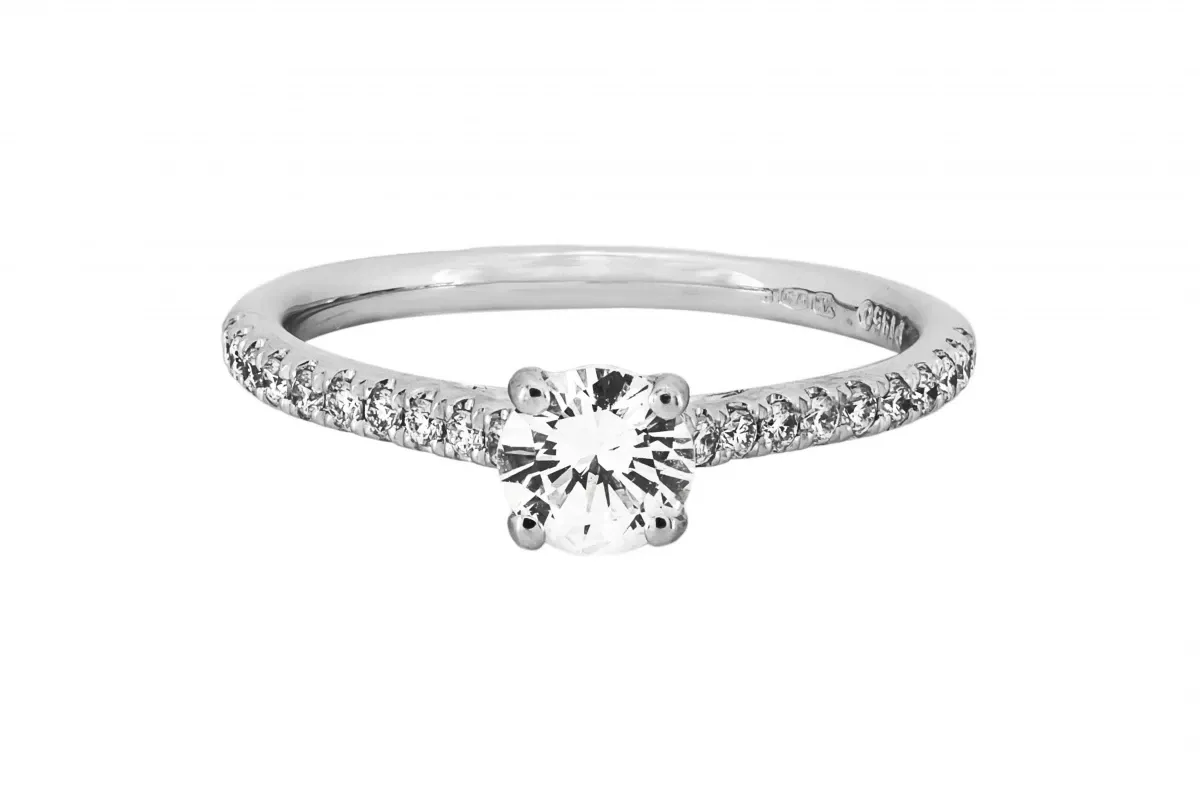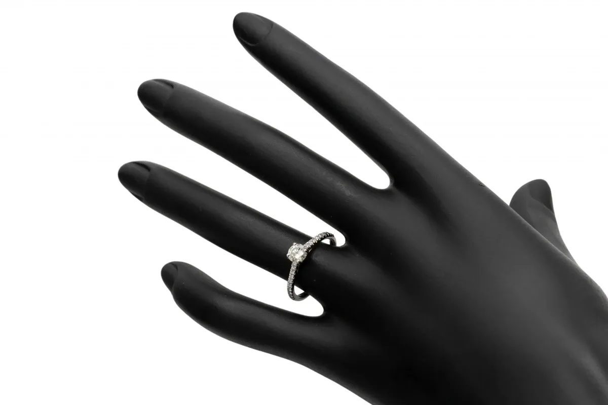 The round brilliant cut center diamond is 0.40 carat and the surrounding diamonds on the shoulders are 0.18 carat.