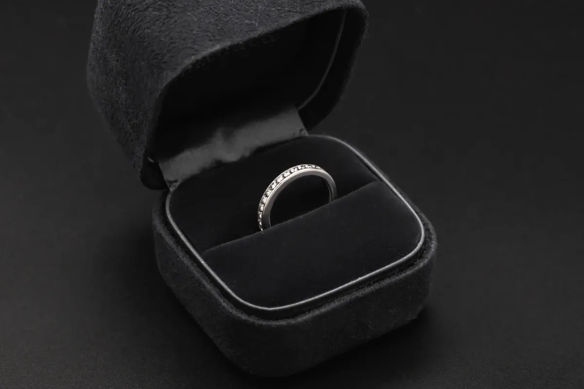 Platinum eternity ring from Tiffany & Co, showcasing a dazzling round brilliant cut diamond at its centre.
