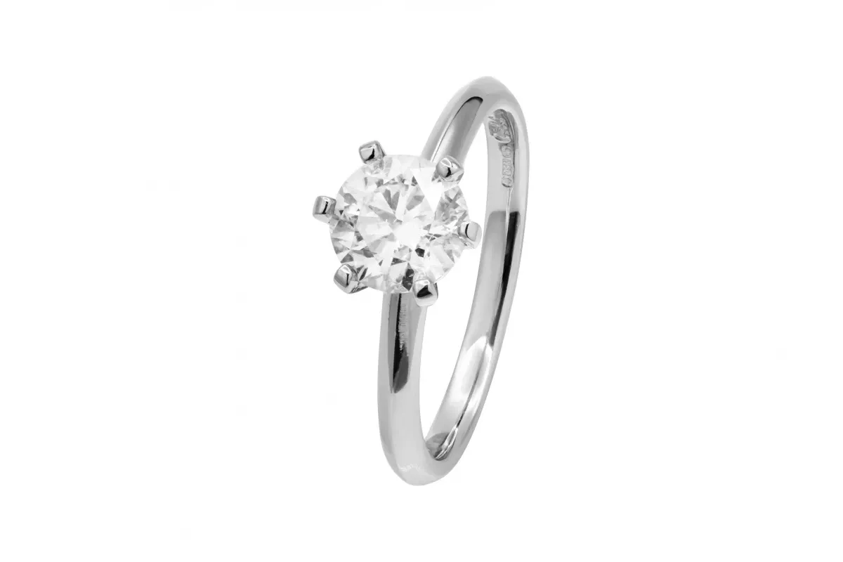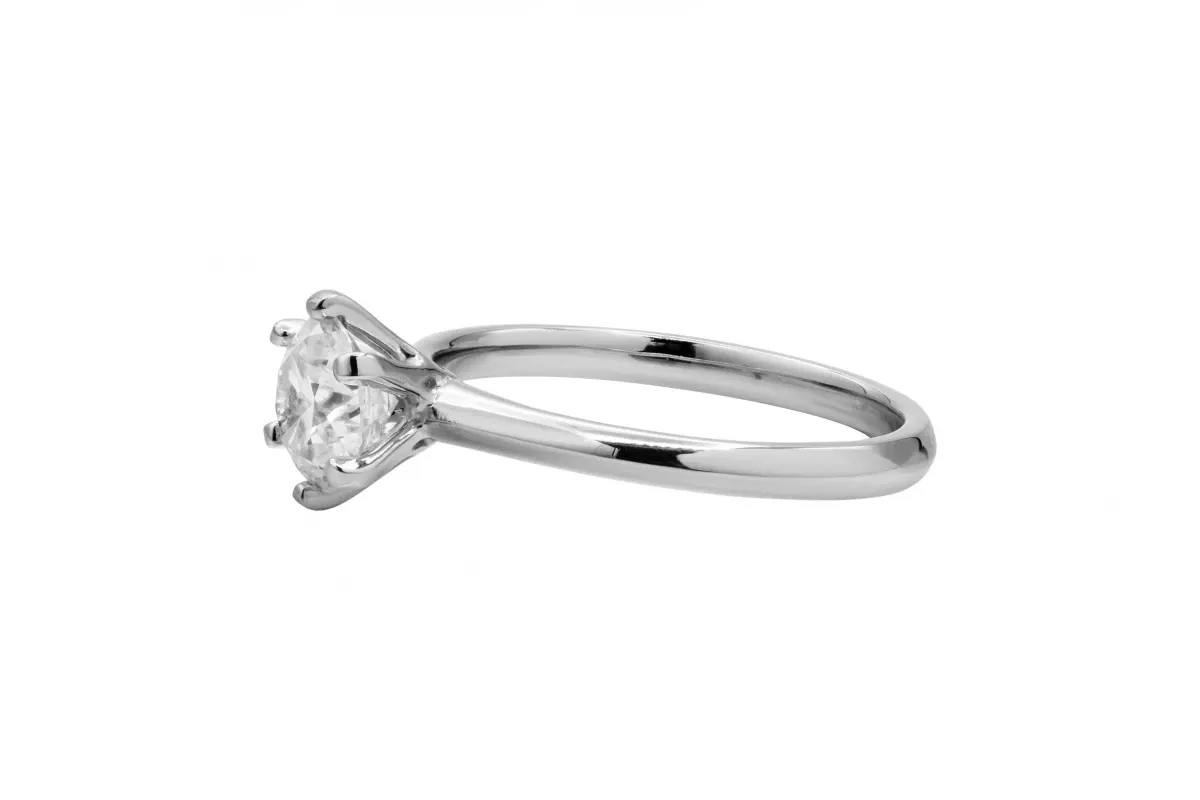 This elegant platinum diamond engagement ring features a 1.01ct round diamond, graded F color and VS clarity.