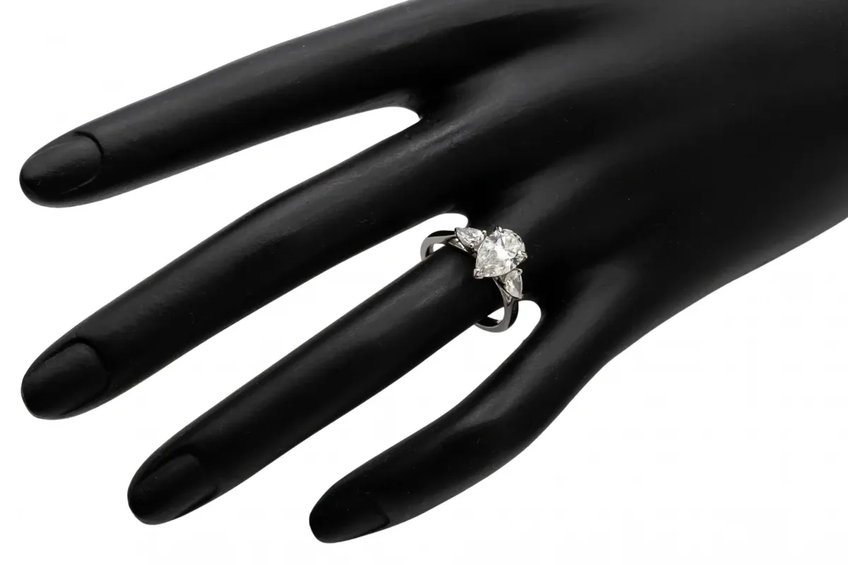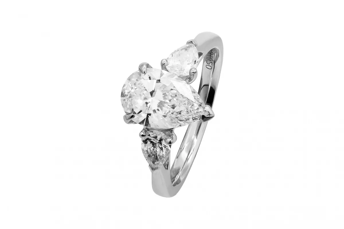 This is a stunning platinum diamond engagement ring set with our brand of our Above Earth Lab Grown diamonds featuring a 1.61ct Pear shaped solitair with a Colour and Clarity grade of F VVS2.