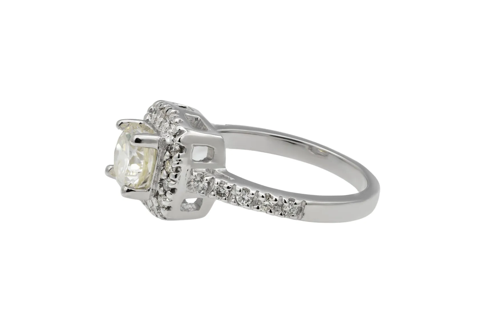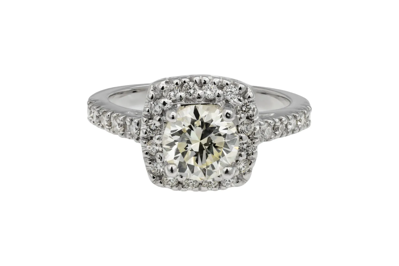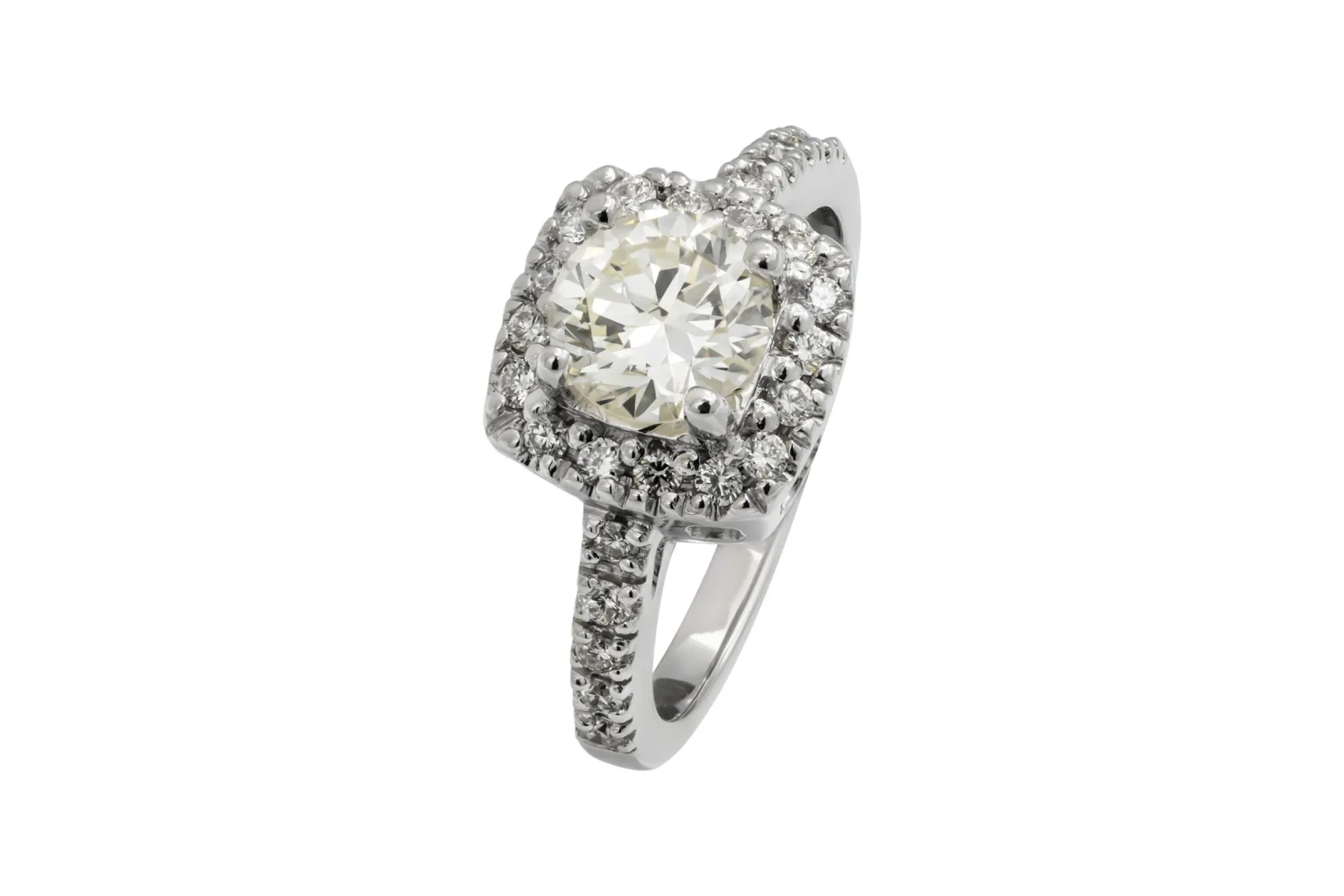 A brilliant round centre diamond is encircled by a refined halo setting, enhancing light return and presence within a platinum mount.