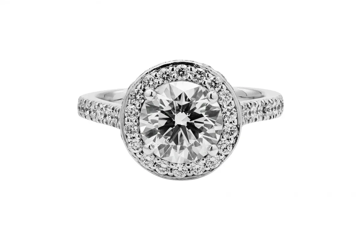 This exquisite Platinum Halo Diamond Engagement Ring features a 1.59ct GIA-certified center diamond, surrounded by a brilliant prong-set halo of 0.89ct diamonds.