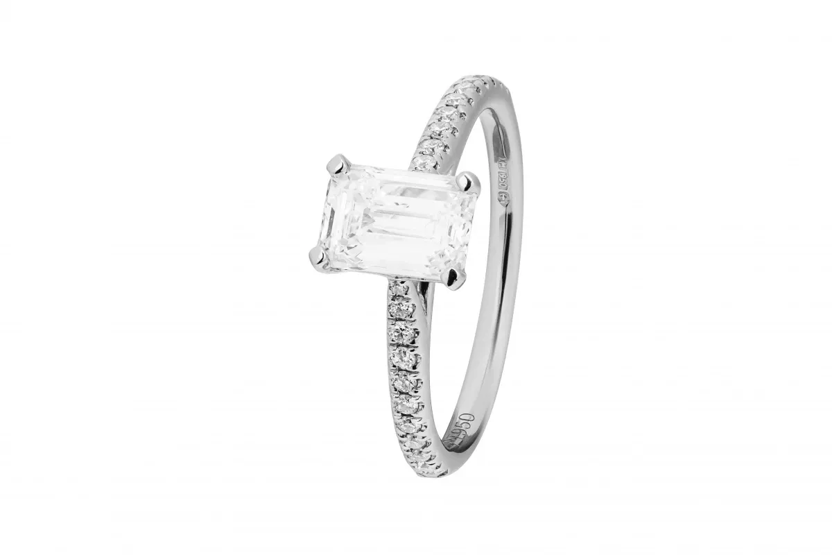 With an E colour grade and VVS2 clarity, the diamond displays exceptional brilliance and purity. The platinum band, weighing 3.3g with a width of 1.8mm, is a size J 1/2.