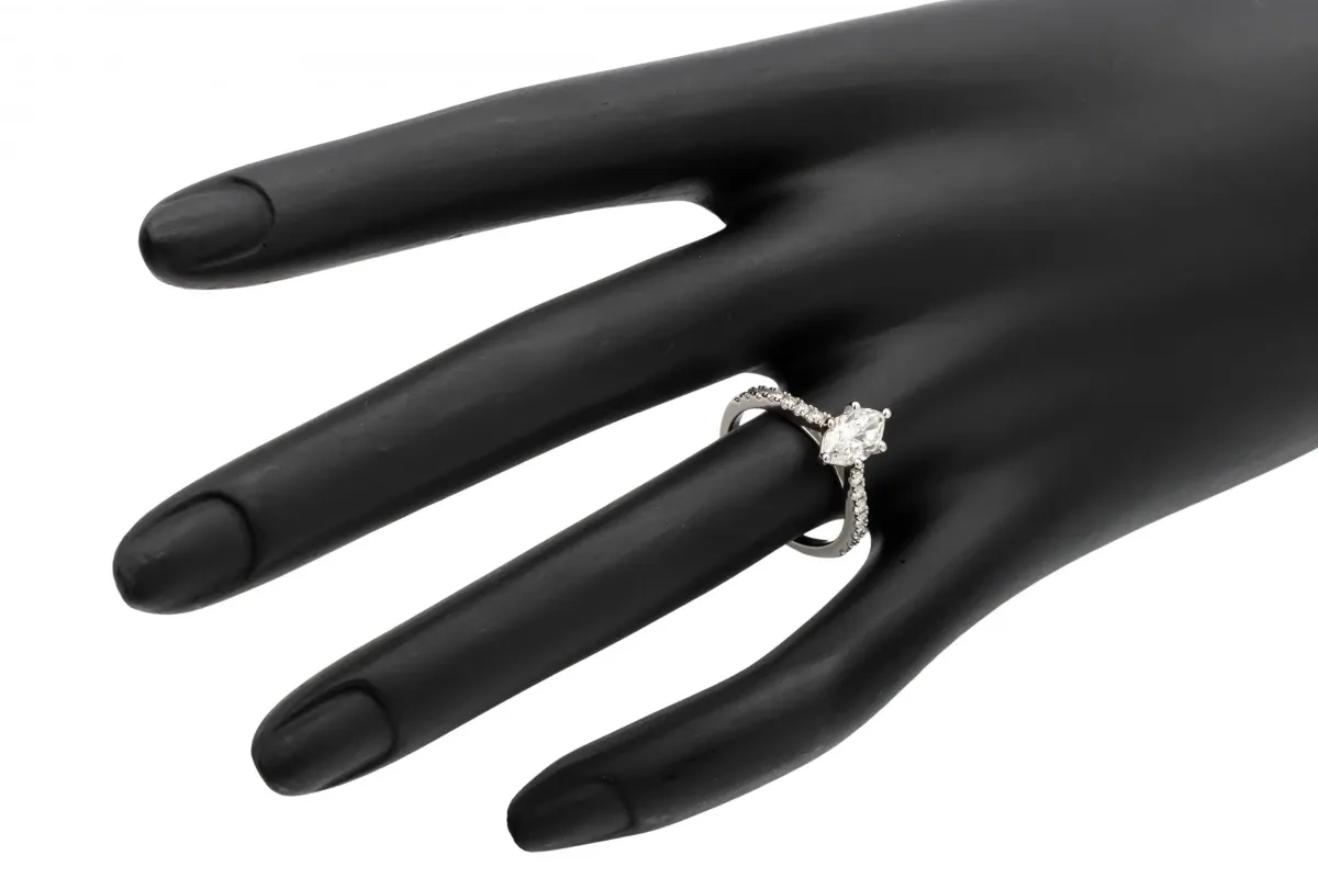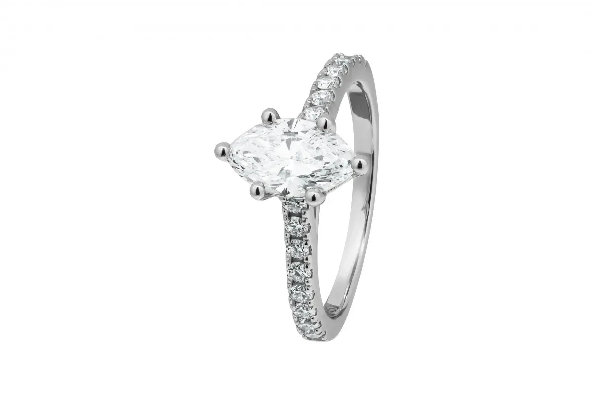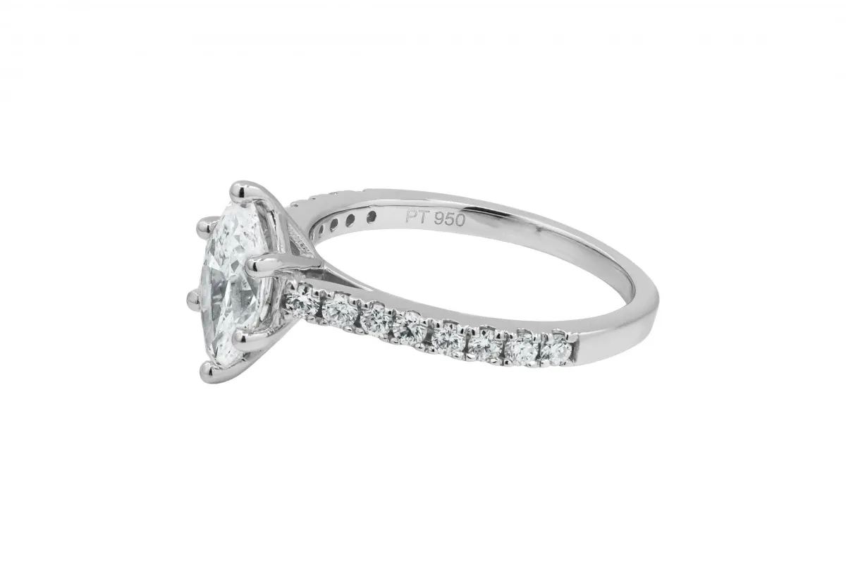 A stunning marquise-cut diamond takes centre stage in this elegant platinum engagement ring, weighing 1.01ct with a G colour and SI2 clarity, GIA certified for peace of mind.