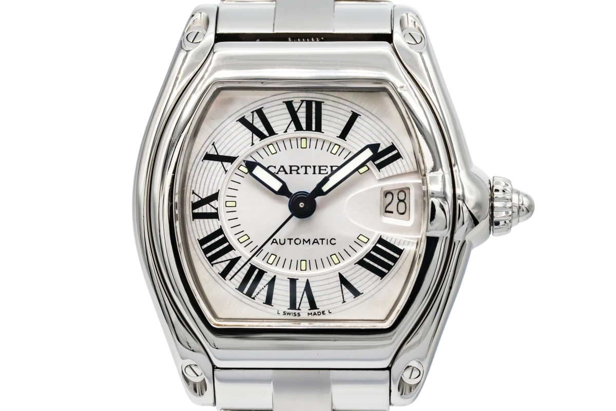 This 2012 Cartier Roadster 37mm features a silver dial with roman numerals and a stainless steel bracelet. It also features a stainless steel bezel.