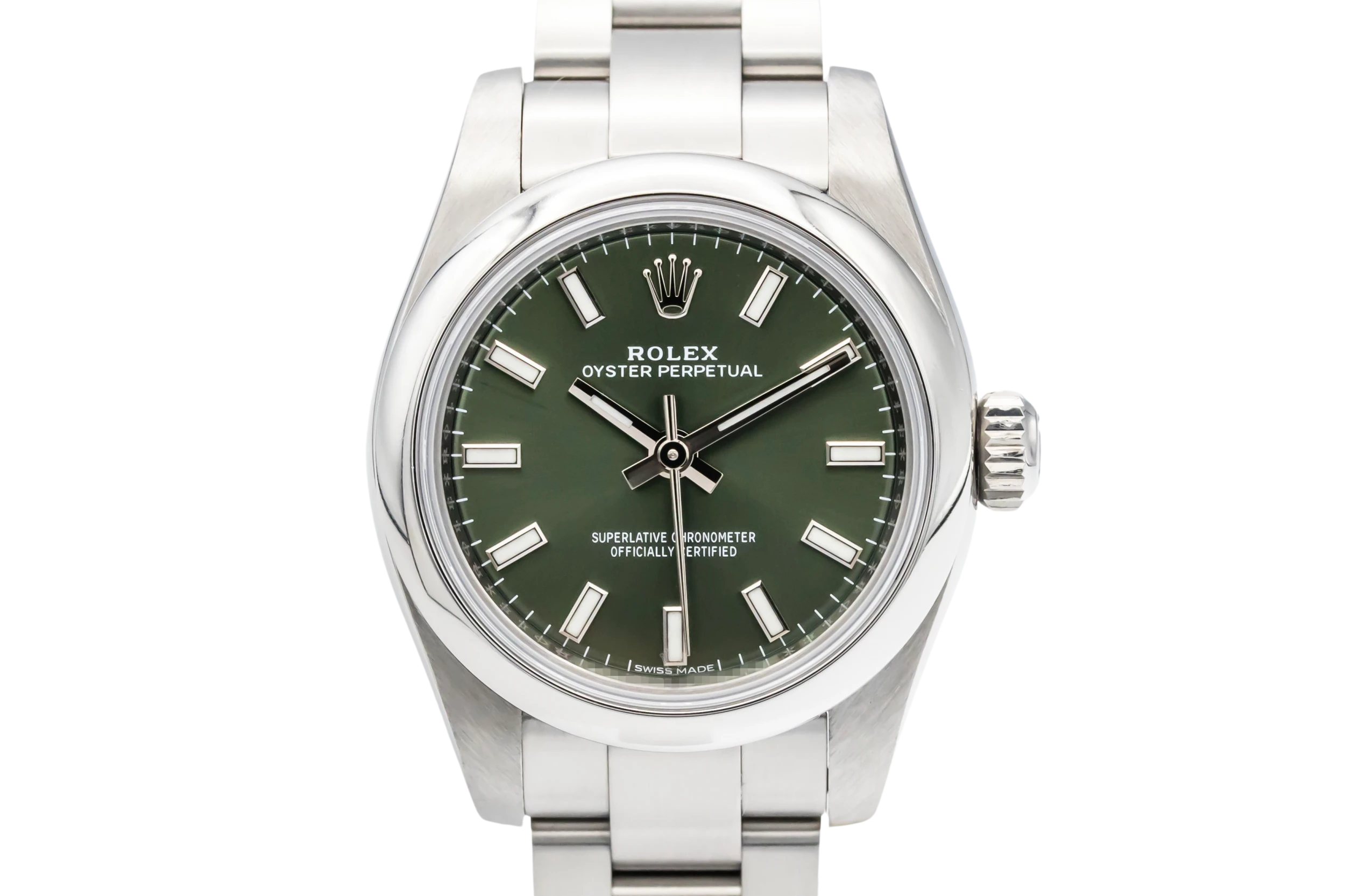 This 2012 Rolex Oyster Perpetual 26mm features a polished stainless steel case paired with the iconic Oyster bracelet. Its clean, green balanced dial displays luminous baton hour markers and refined hands, offering excellent legibility and timeless styling.