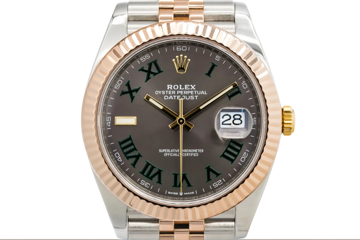 This 2021 Rolex DateJust 41mm features a grey dial with roman numerals and a stainless steel and 18ct rose gold jubilee bracelet. It fitted with a 18ct rose gold fluted bezel.