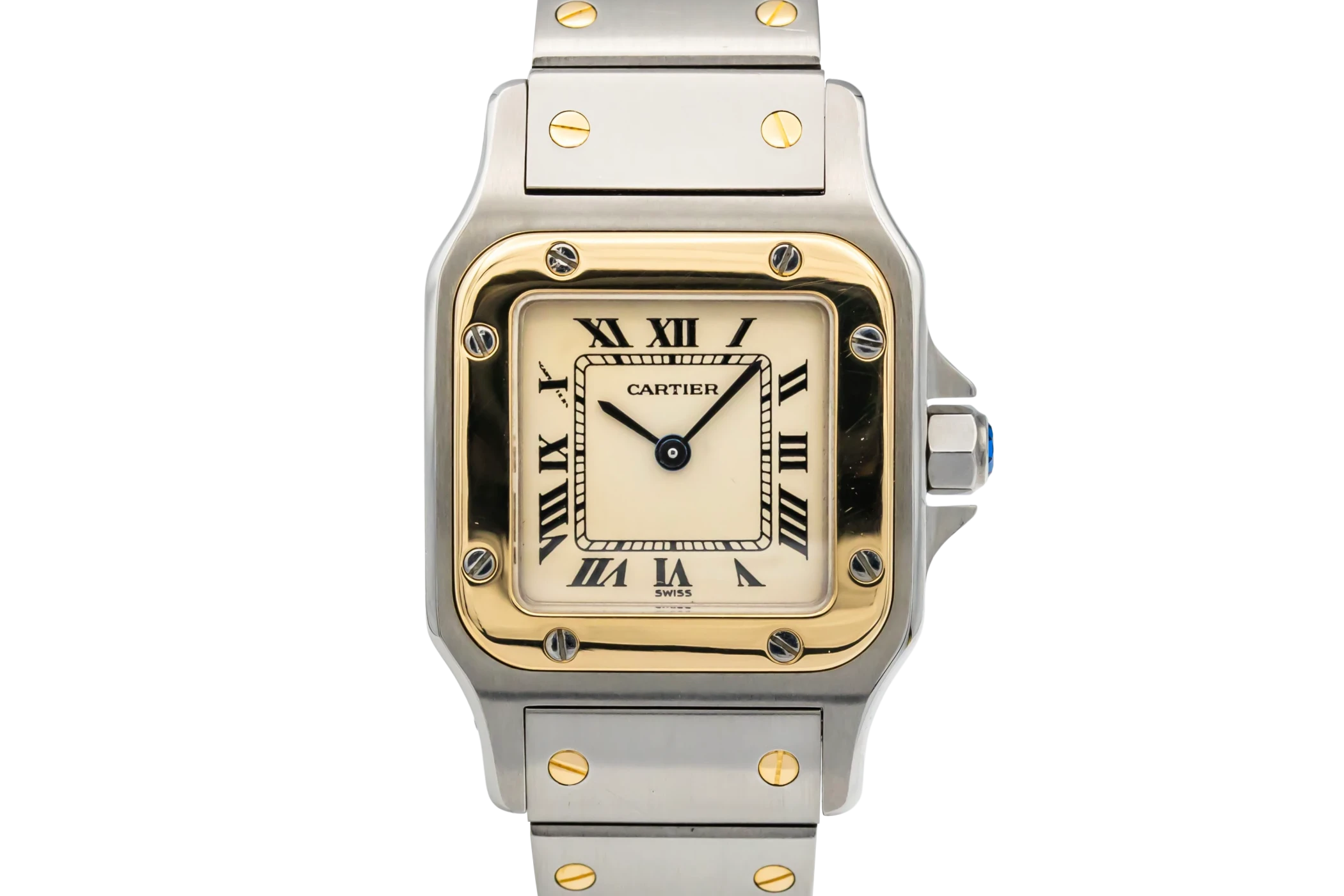 This 1997 Cartier Galbee 24mm features a white dial with roman numerals and a stainless steel and 18ct yellow gold bracelet. It also features a 18ct yellow gold smooth bezel.