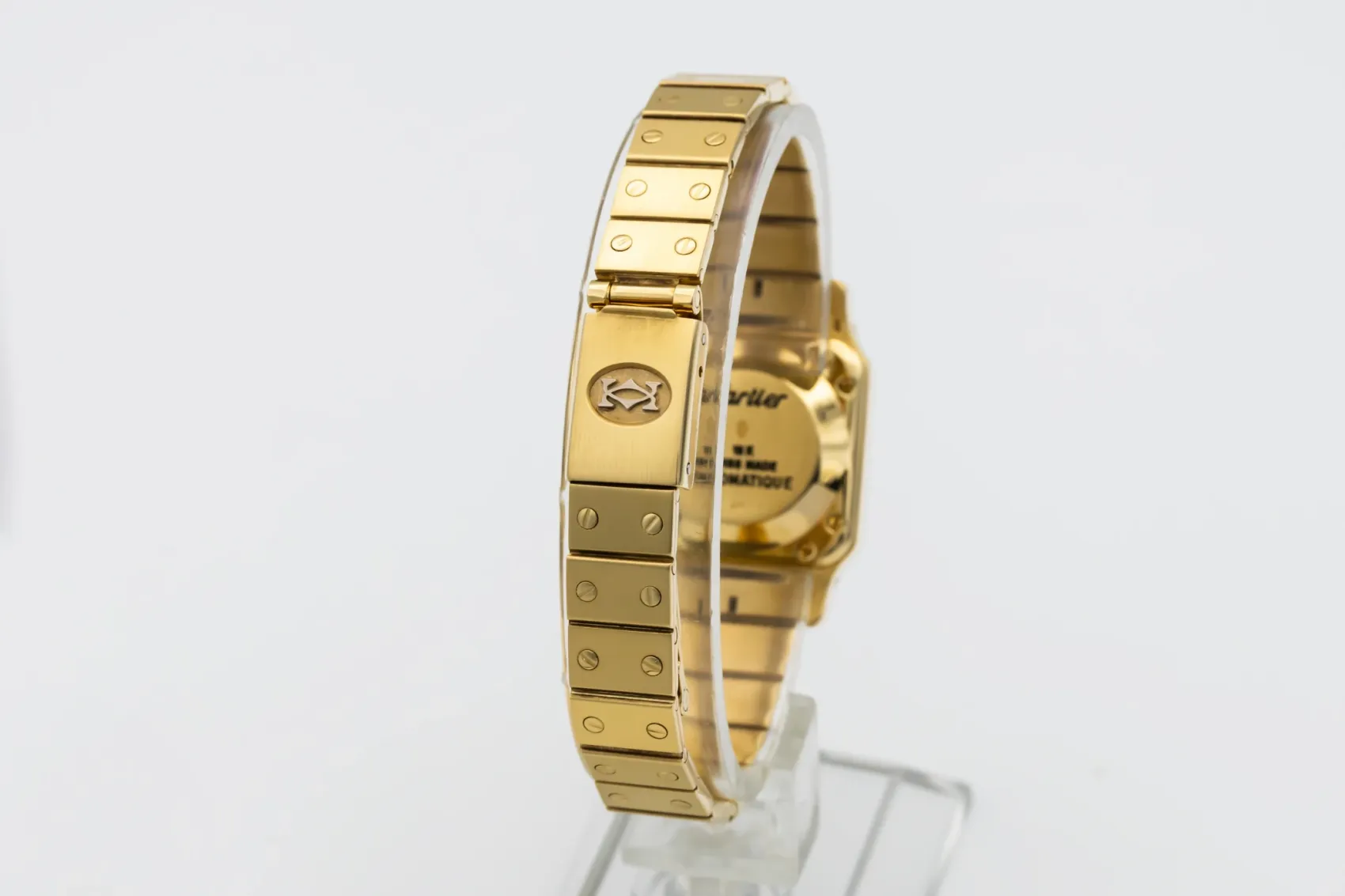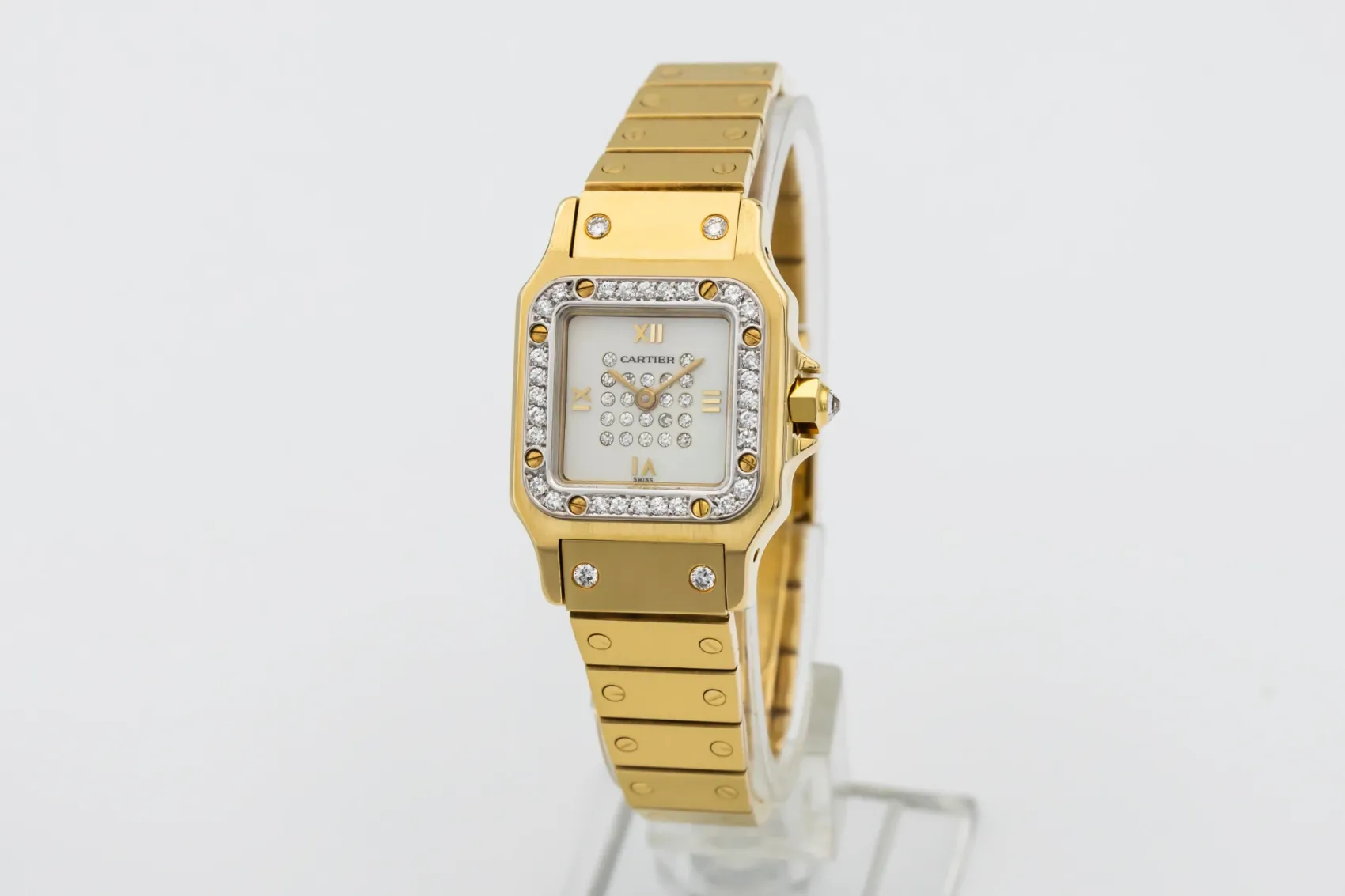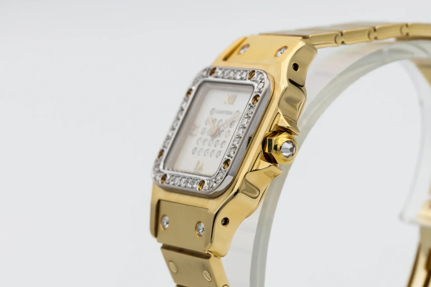 finance this from £351.79 p/m call the shop Read about our Limited Lifetime WarrantyThis Circa 1990s Cartier Santos Carree 24mm features a mother-of-pearl dial with Roman numeral markers at the quarter hours, with brilliant-cut diamonds. The luxurious square case is framed by a diamond-set bezel with Cartier’s signature exposed gold screws, while the matching bracelet continues the motif with diamond-set screw links.