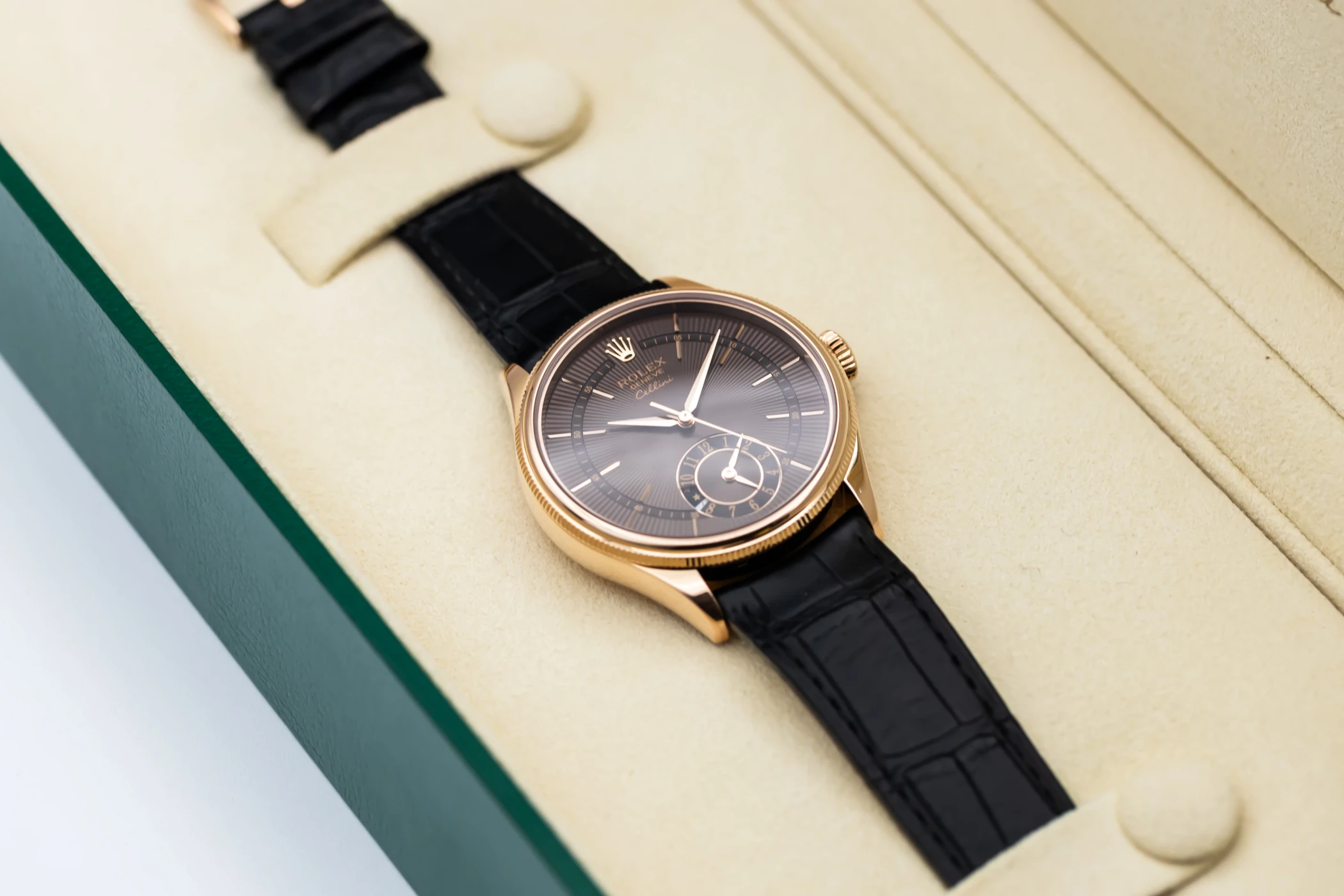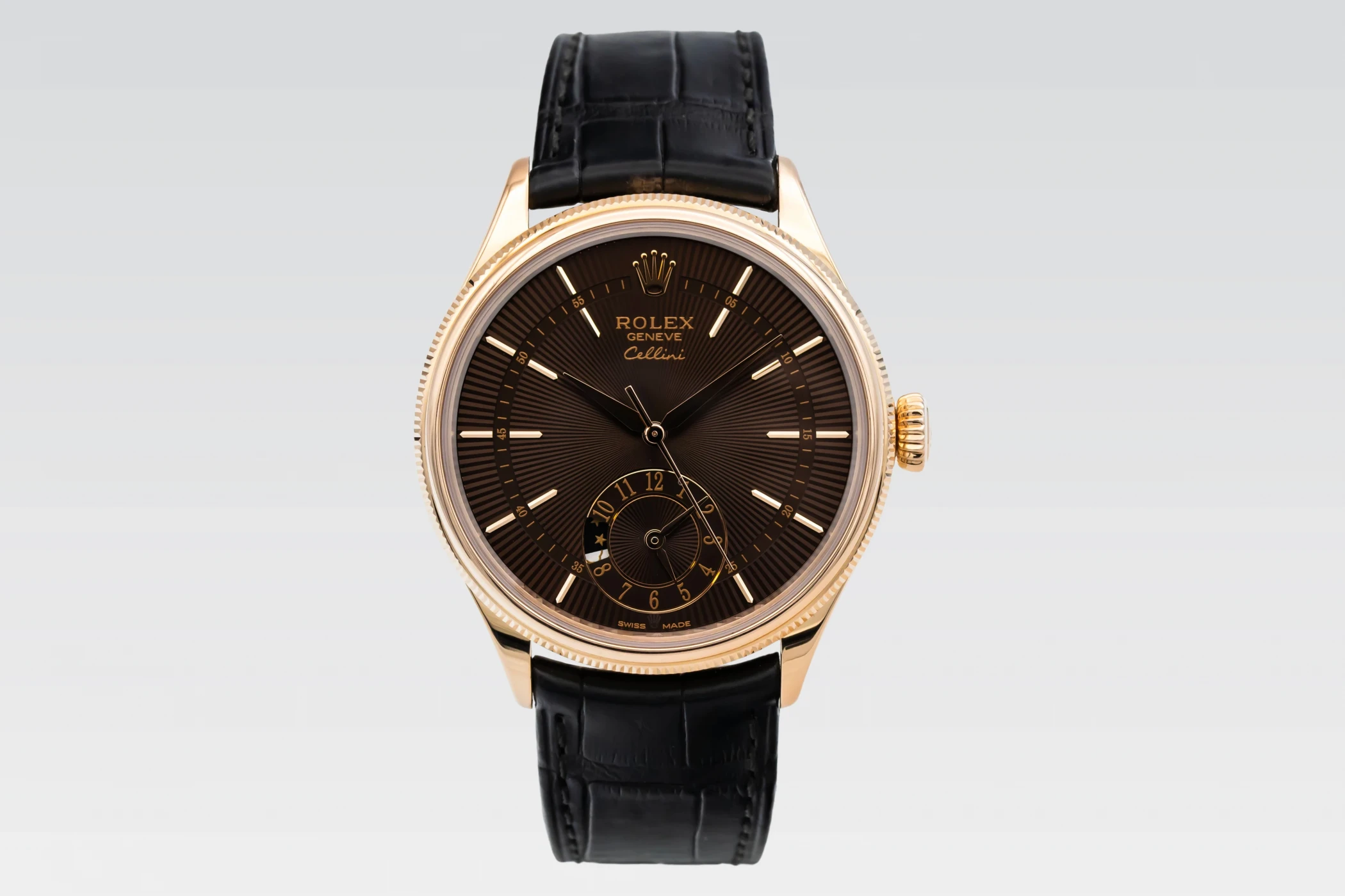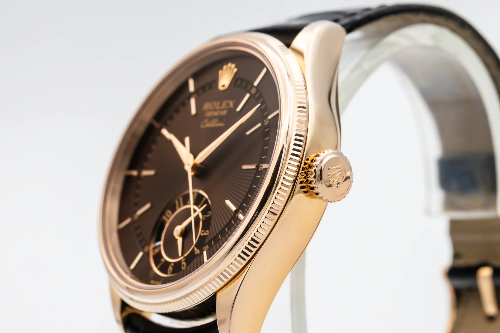 finance this from £203.23 p/m call the shop Read about our Limited Lifetime WarrantyThis 2020 Cellini Dual Time 39mm features a chocolate guilloché dial with applied rose gold hour markers and slender hands, while a sub-dial at 6 o’clock displays a second time zone complete with a day/night indicator. The piece is complemented by a premium black alligator leather strap secured with an 18ct Everose gold folding clasp, offering understated luxury and comfort in equal measure.