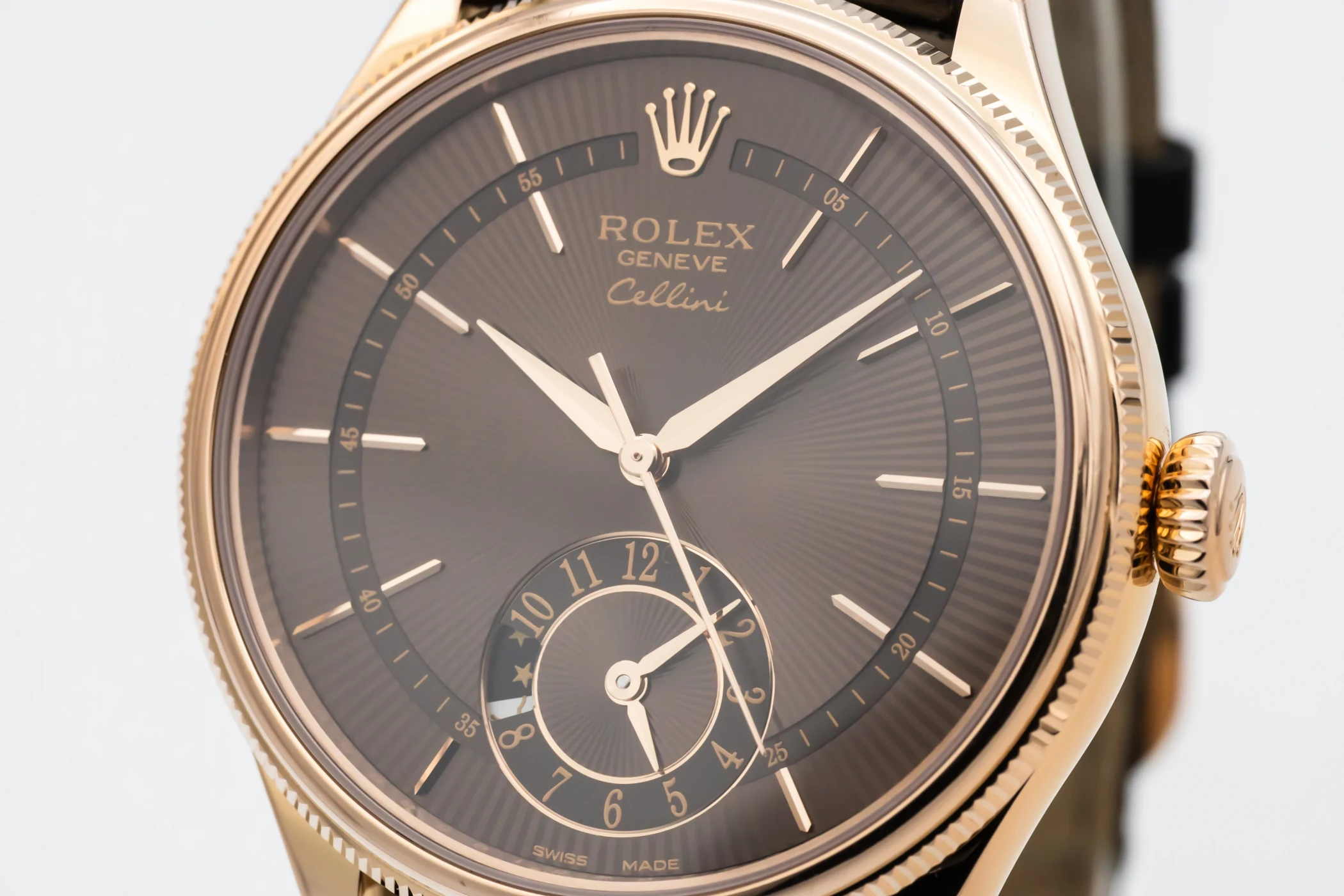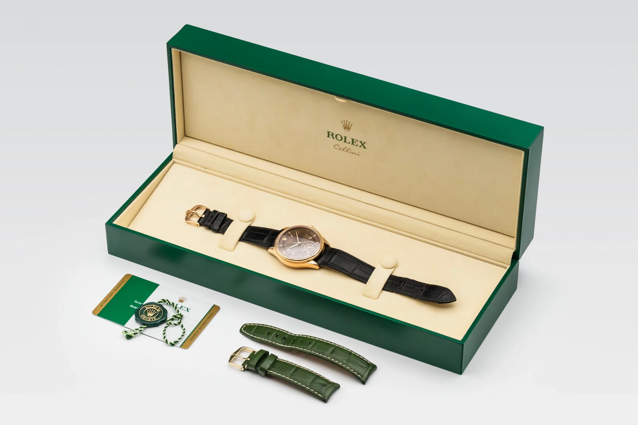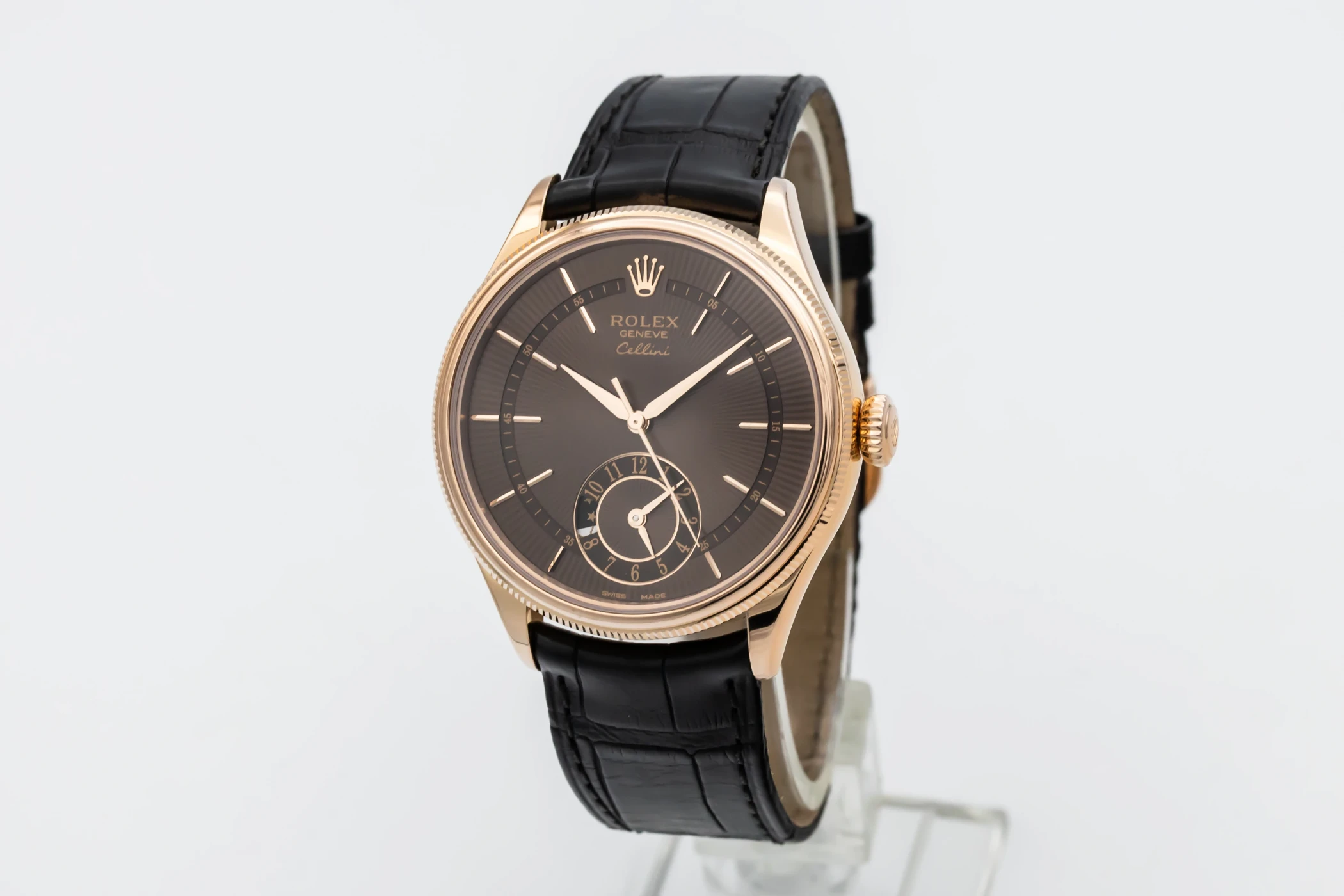 finance this from £203.23 p/m call the shop Read about our Limited Lifetime WarrantyThis 2020 Cellini Dual Time 39mm features a chocolate guilloché dial with applied rose gold hour markers and slender hands, while a sub-dial at 6 o’clock displays a second time zone complete with a day/night indicator. The piece is complemented by a premium black alligator leather strap secured with an 18ct Everose gold folding clasp, offering understated luxury and comfort in equal measure.