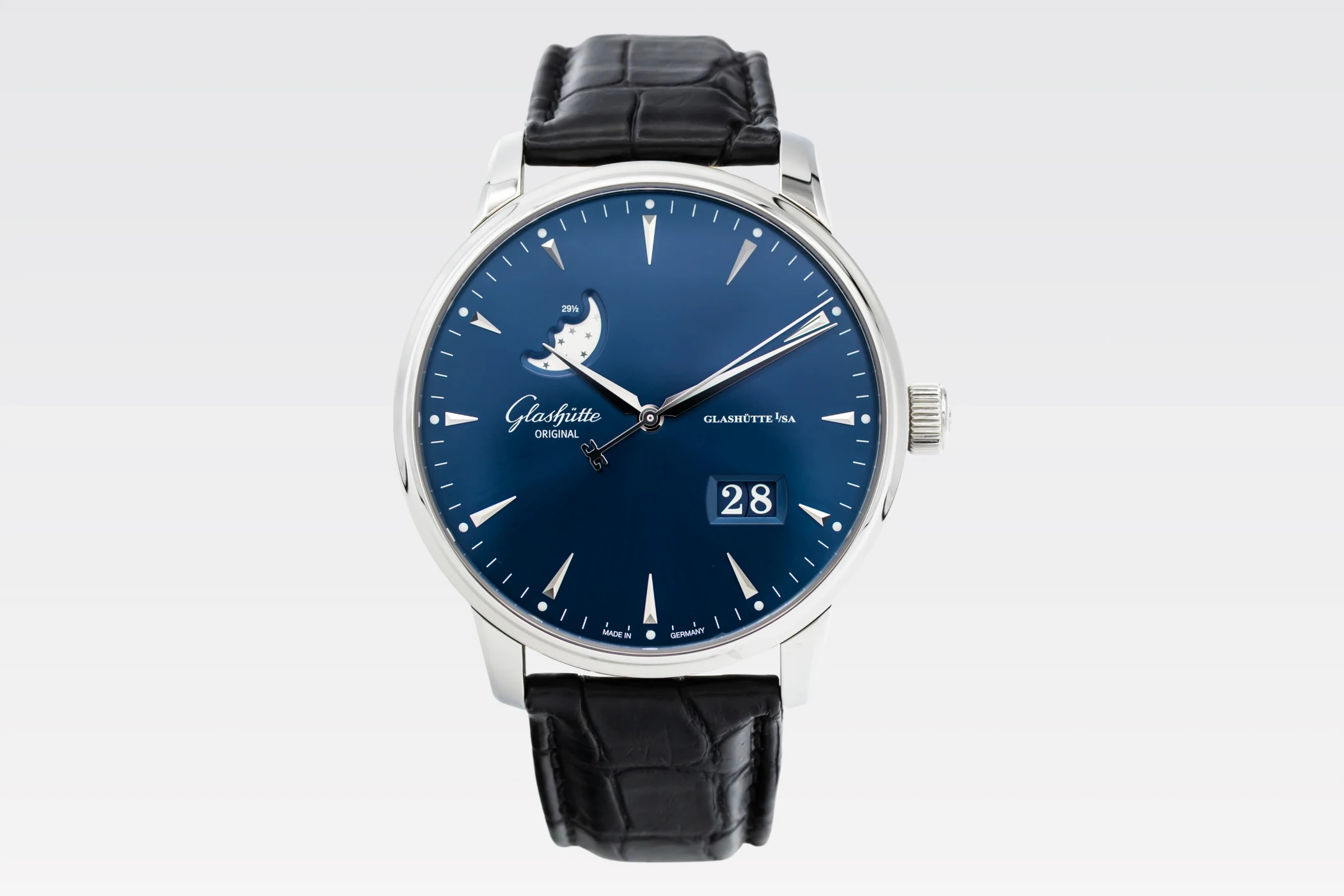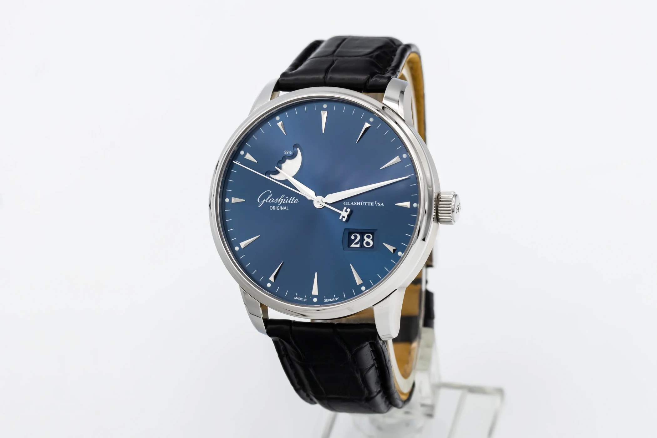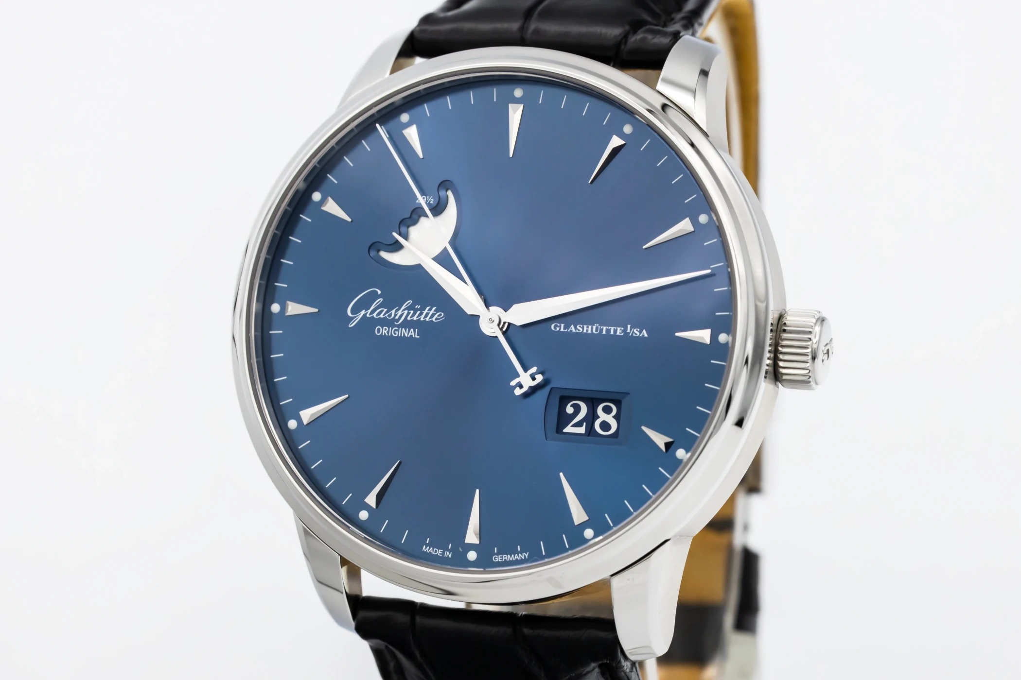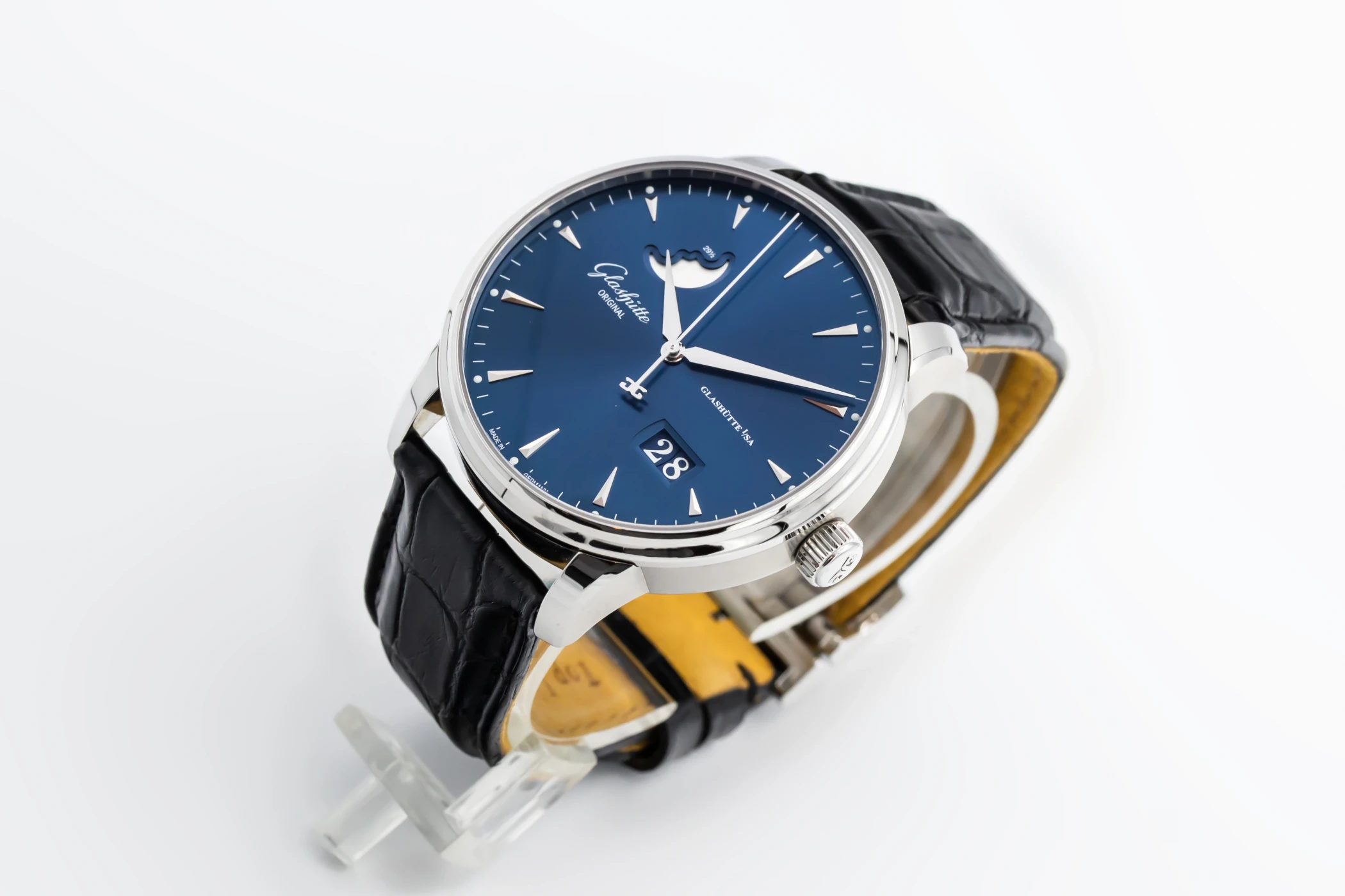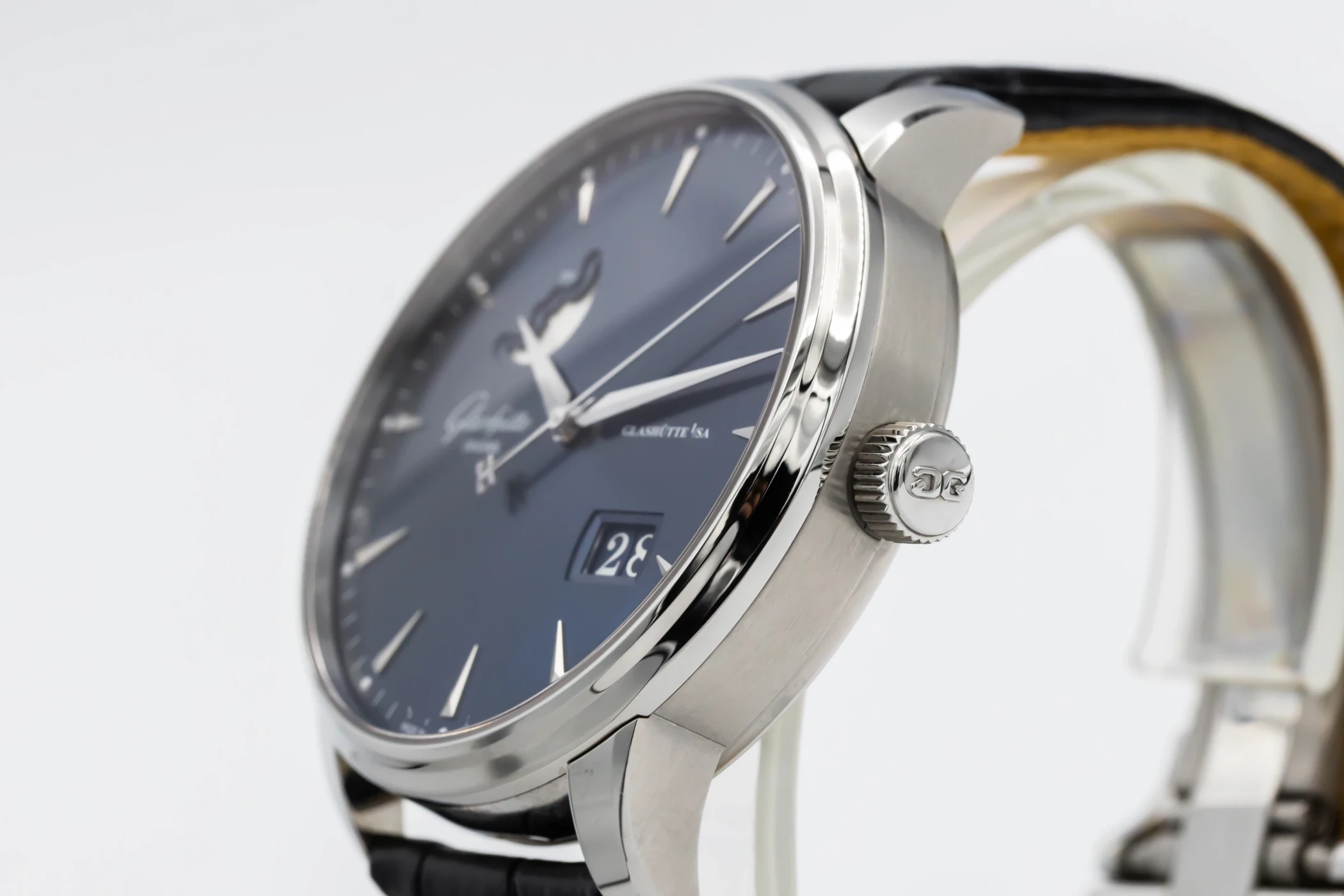 finance this from £78.12 p/m call the shop Read about our Limited Lifetime WarrantyThis circa 2016 Glashutte original senator excellence 42mm features a blue dial with dagger markers and a black leather bracelet. It also features a stainless steel bezel.