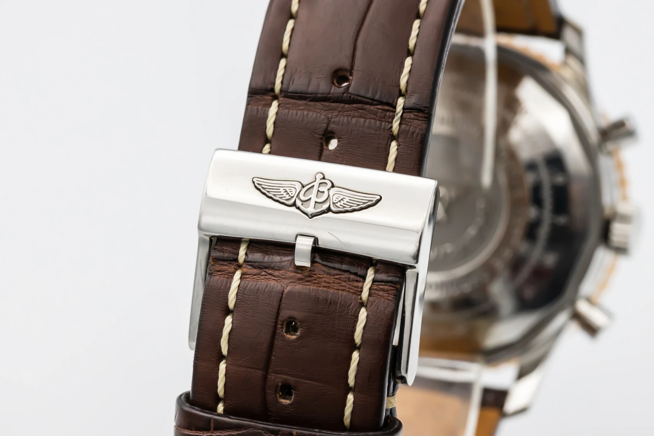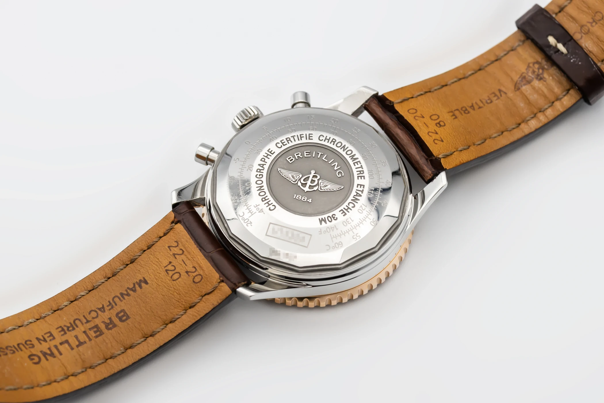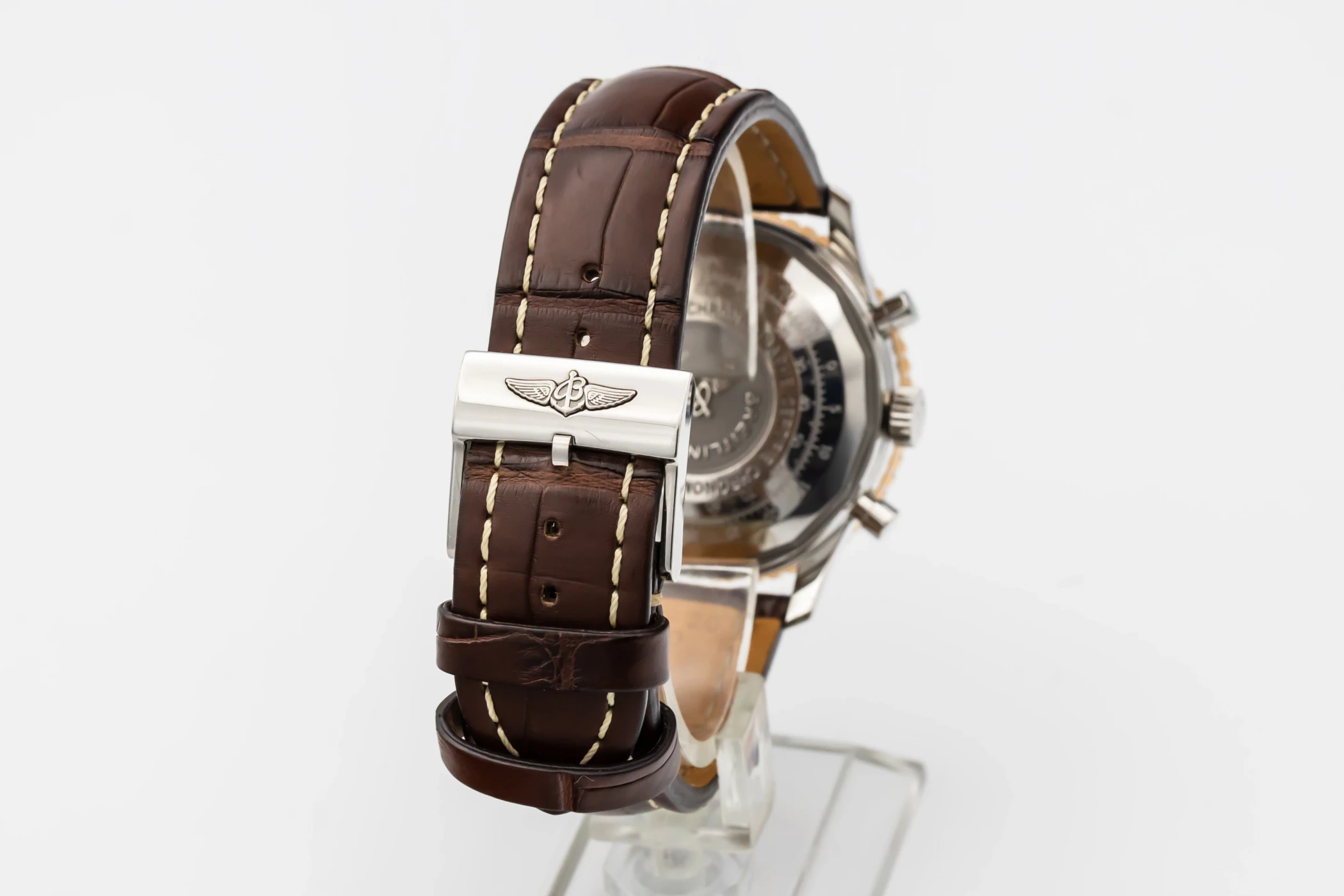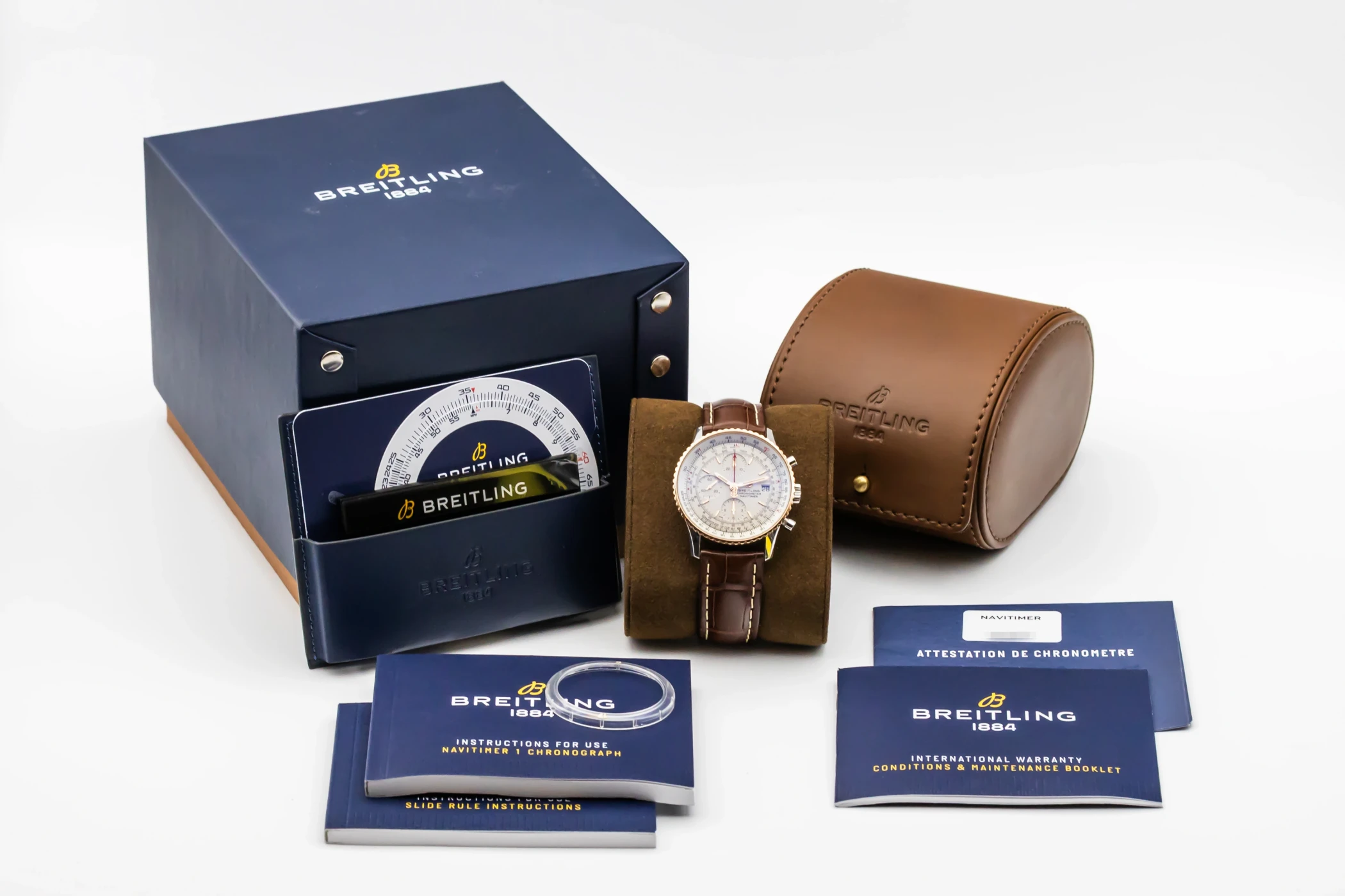 finance this from £85.94 p/m call the shop Read about our Limited Lifetime WarrantyThis 2020 Breitling Navitimer B01 Chrono 41mm features a elegant silver dial which is enhanced by gold-tone hands and applied hour markers, complemented by three silver sub-dials displaying chronograph functions with impeccable clarity. Completing the design is a rich brown alligator leather strap with a folding clasp.