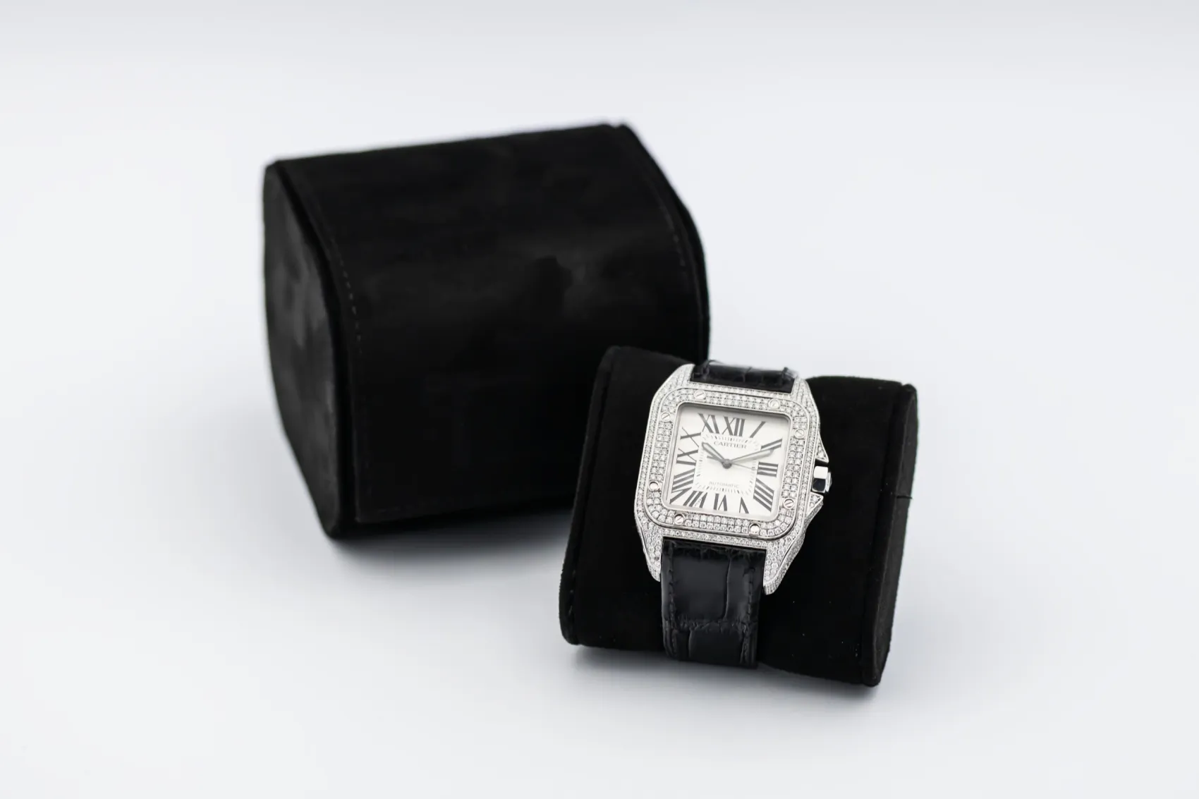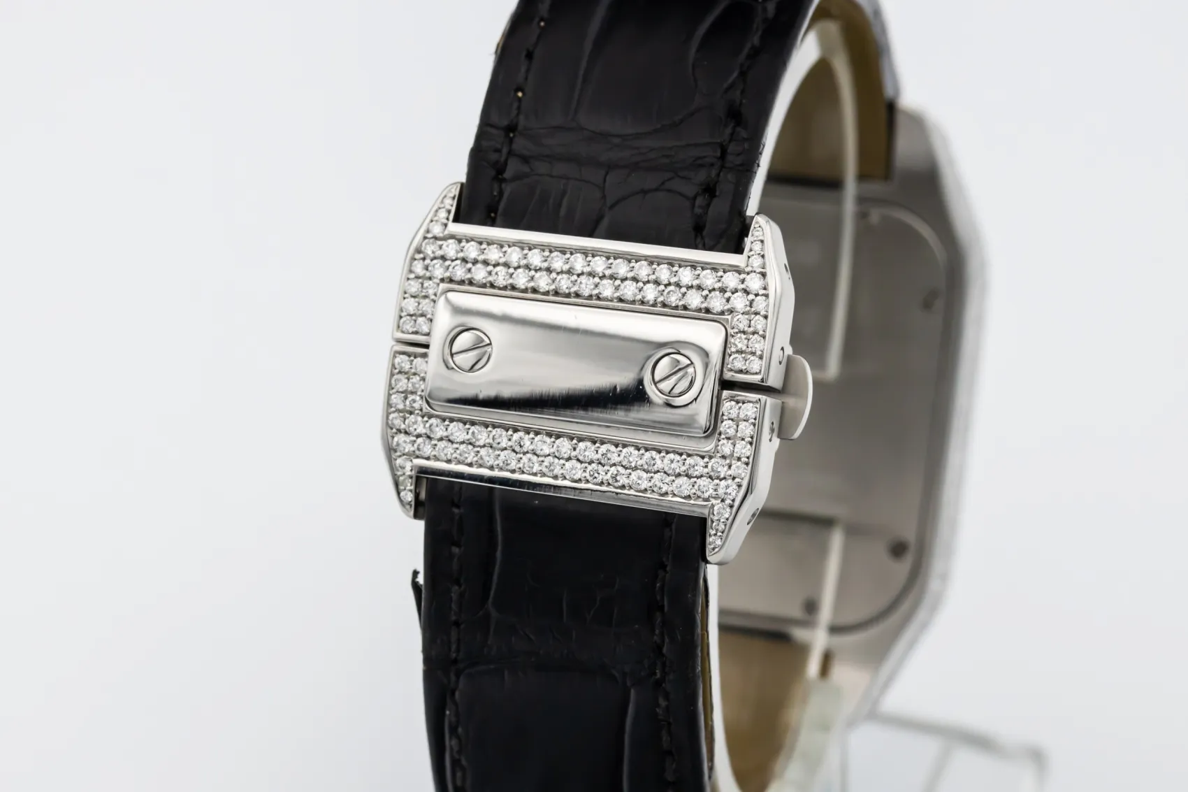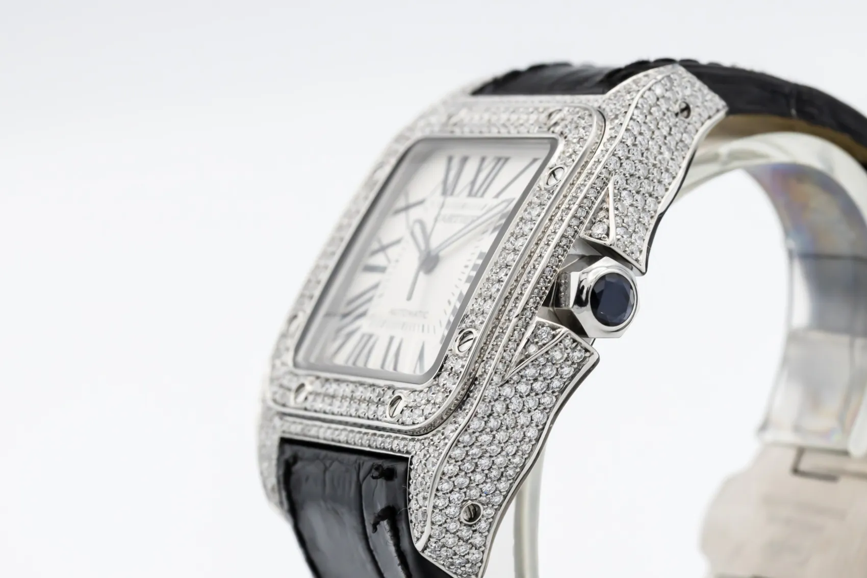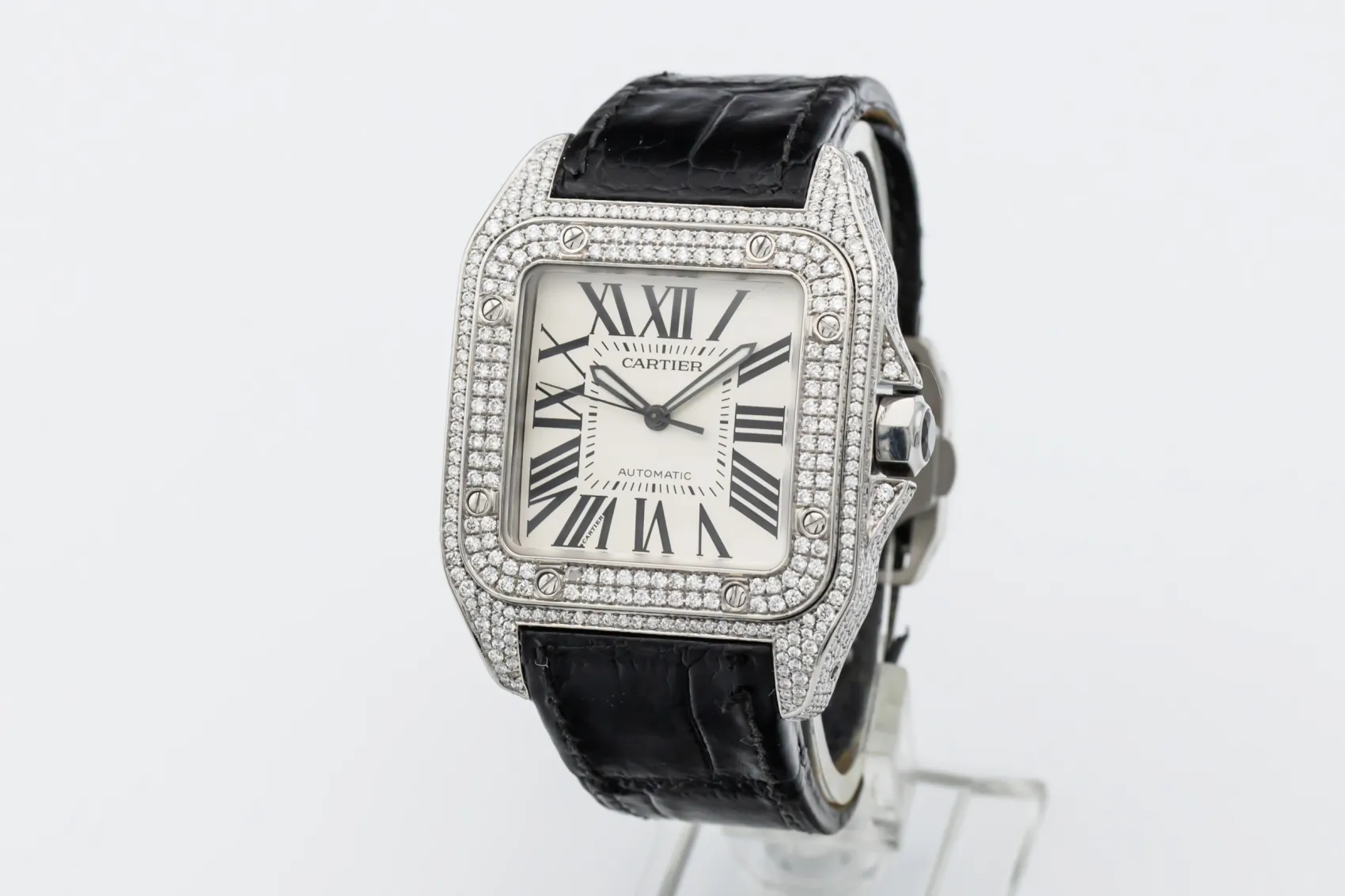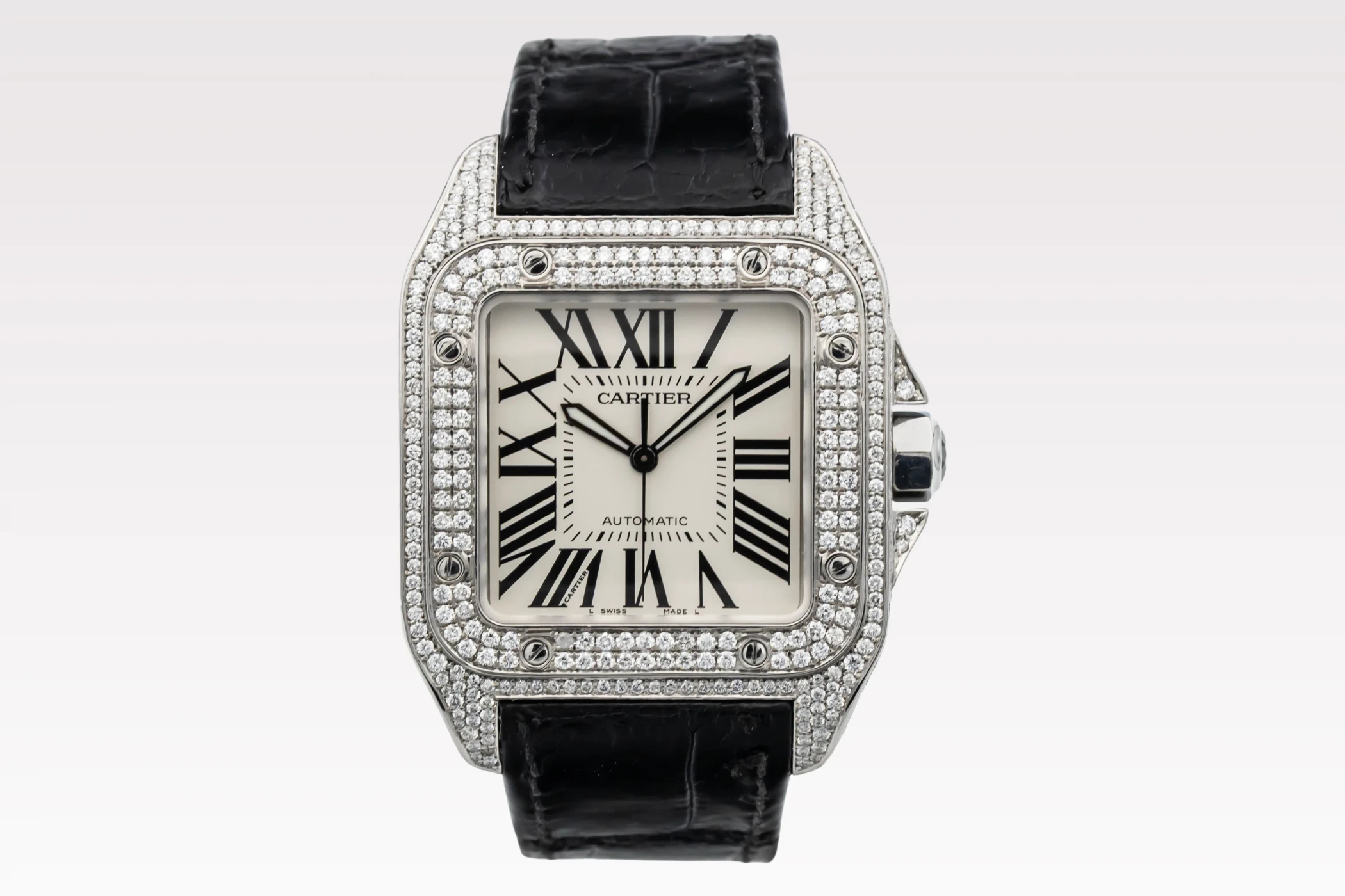 The circa 2010 Cartier Santos 100XL 41mm presents a bold and contemporary expression of the classic Santos design. The silver dial features black Roman numeral hour markers, a railway minute track, and blued-steel sword hands under a scratch-resistant sapphire crystal. This model is fitted to a black alligator leather strap with a Cartier steel deployment clasp, blending refined craftsmanship with everyday wearability.