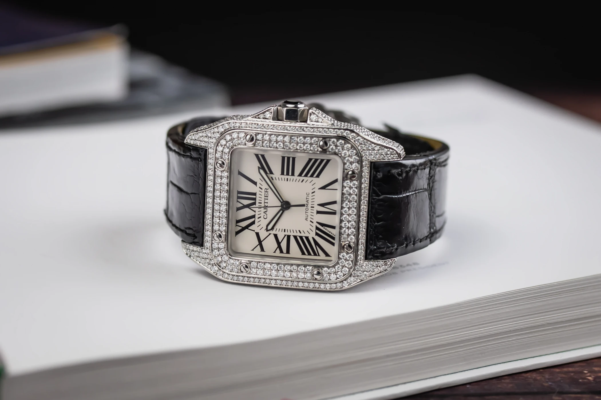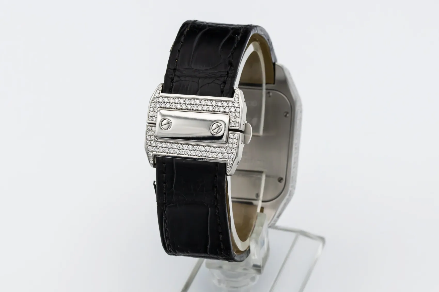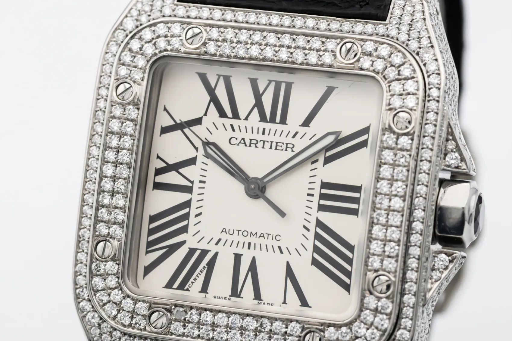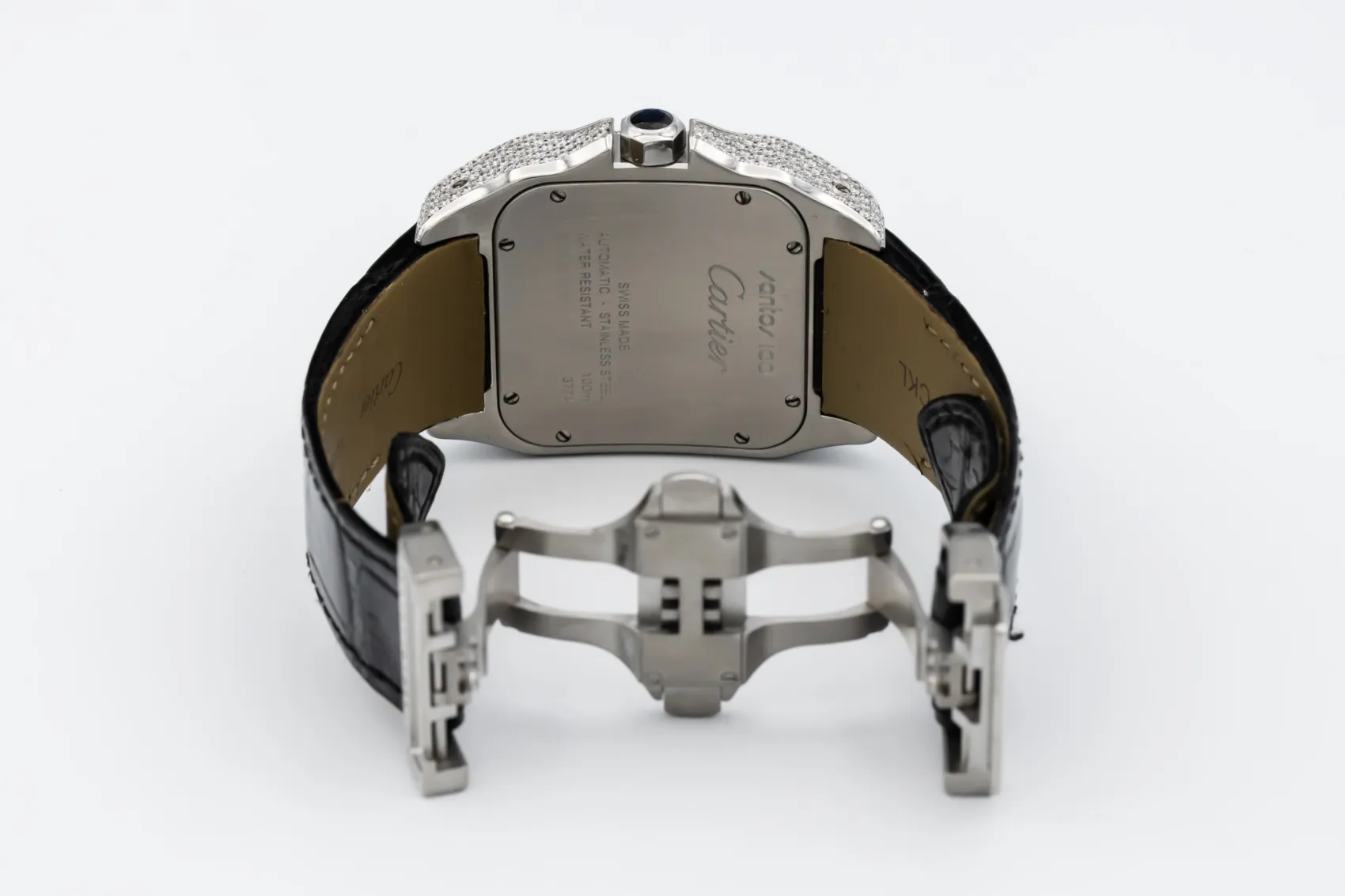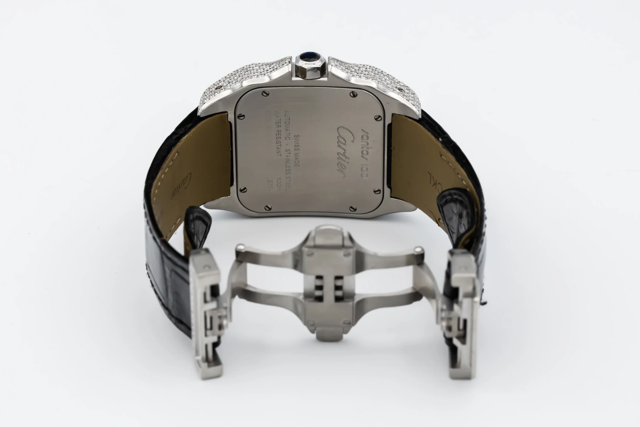 The circa 2010 Cartier Santos 100XL 41mm presents a bold and contemporary expression of the classic Santos design. The silver dial features black Roman numeral hour markers, a railway minute track, and blued-steel sword hands under a scratch-resistant sapphire crystal. This model is fitted to a black alligator leather strap with a Cartier steel deployment clasp, blending refined craftsmanship with everyday wearability.