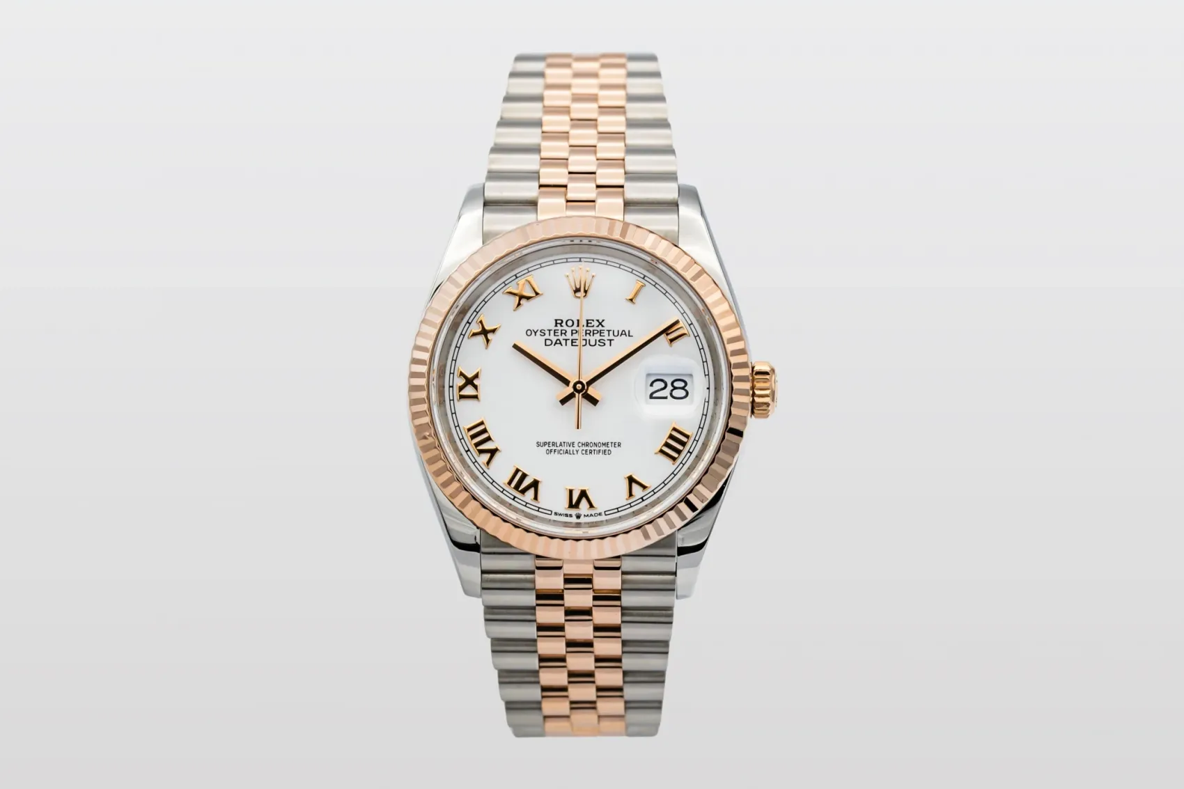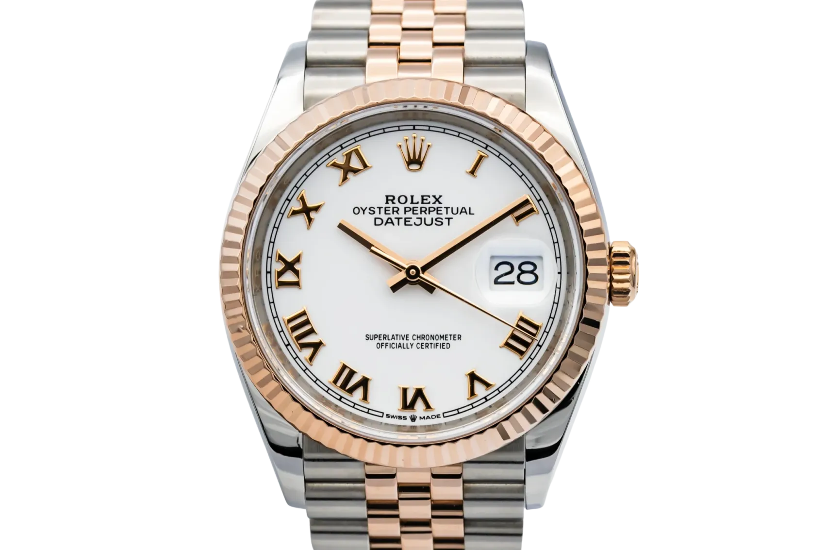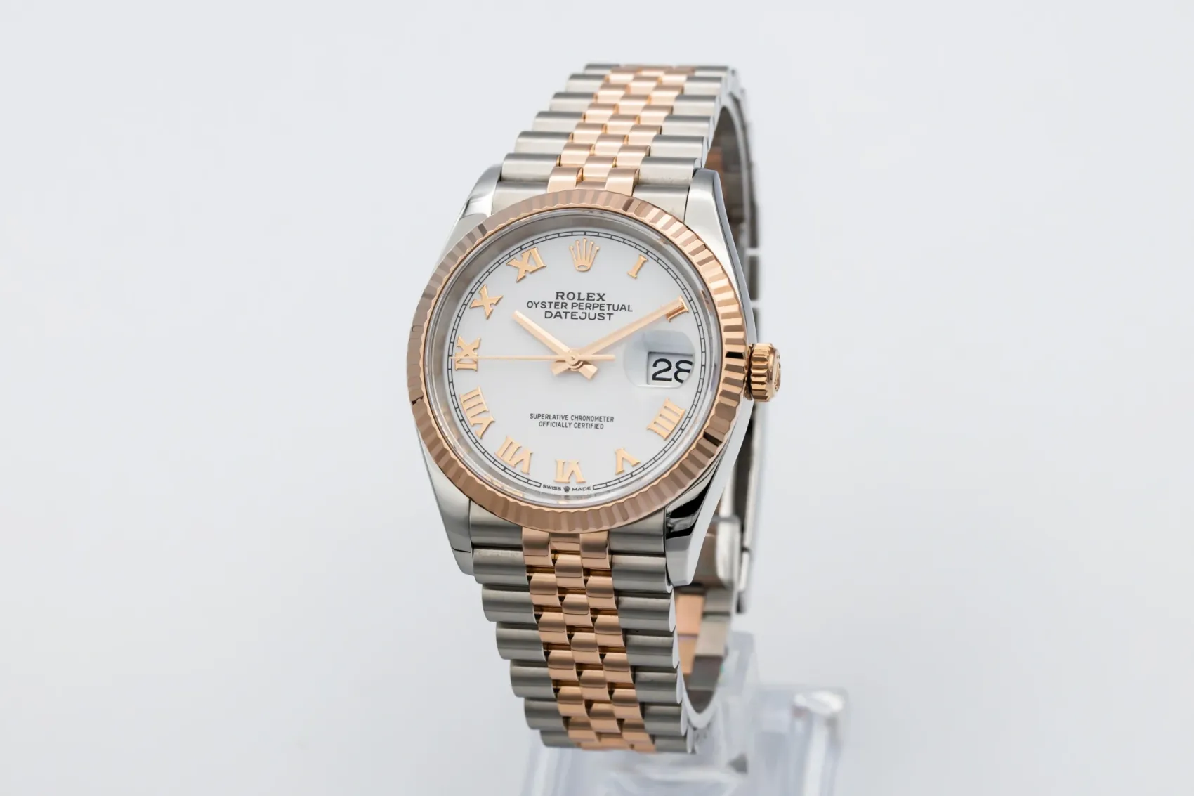 This 2021 Rolex DateJust 36mm features a white dial with roman numeral markers and an jubilee bracelet in steel and 18ct rose gold. It is also fitted with a 18ct rose gold fluted bezel.