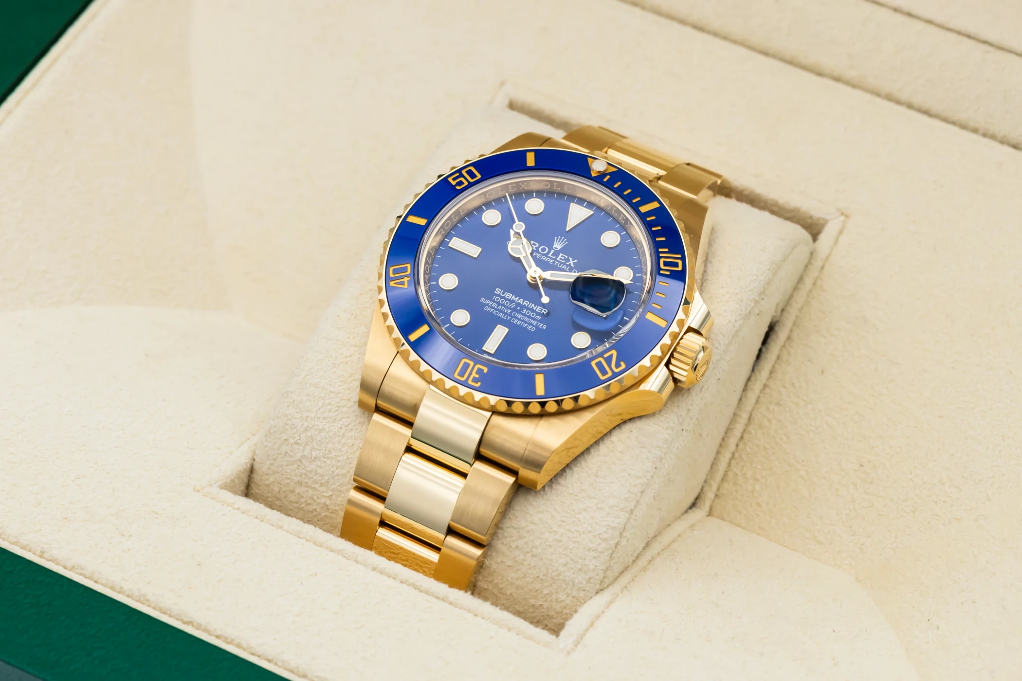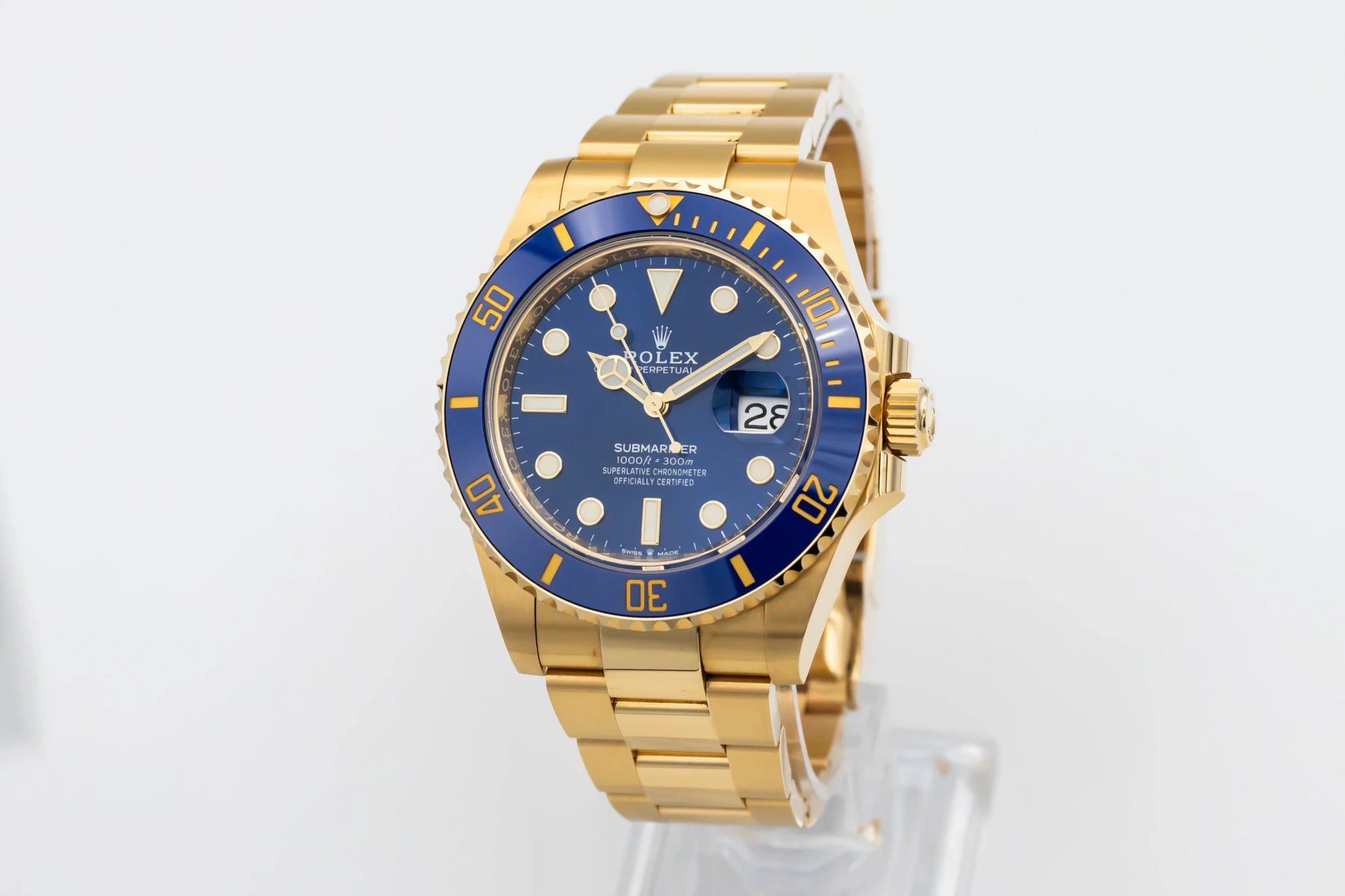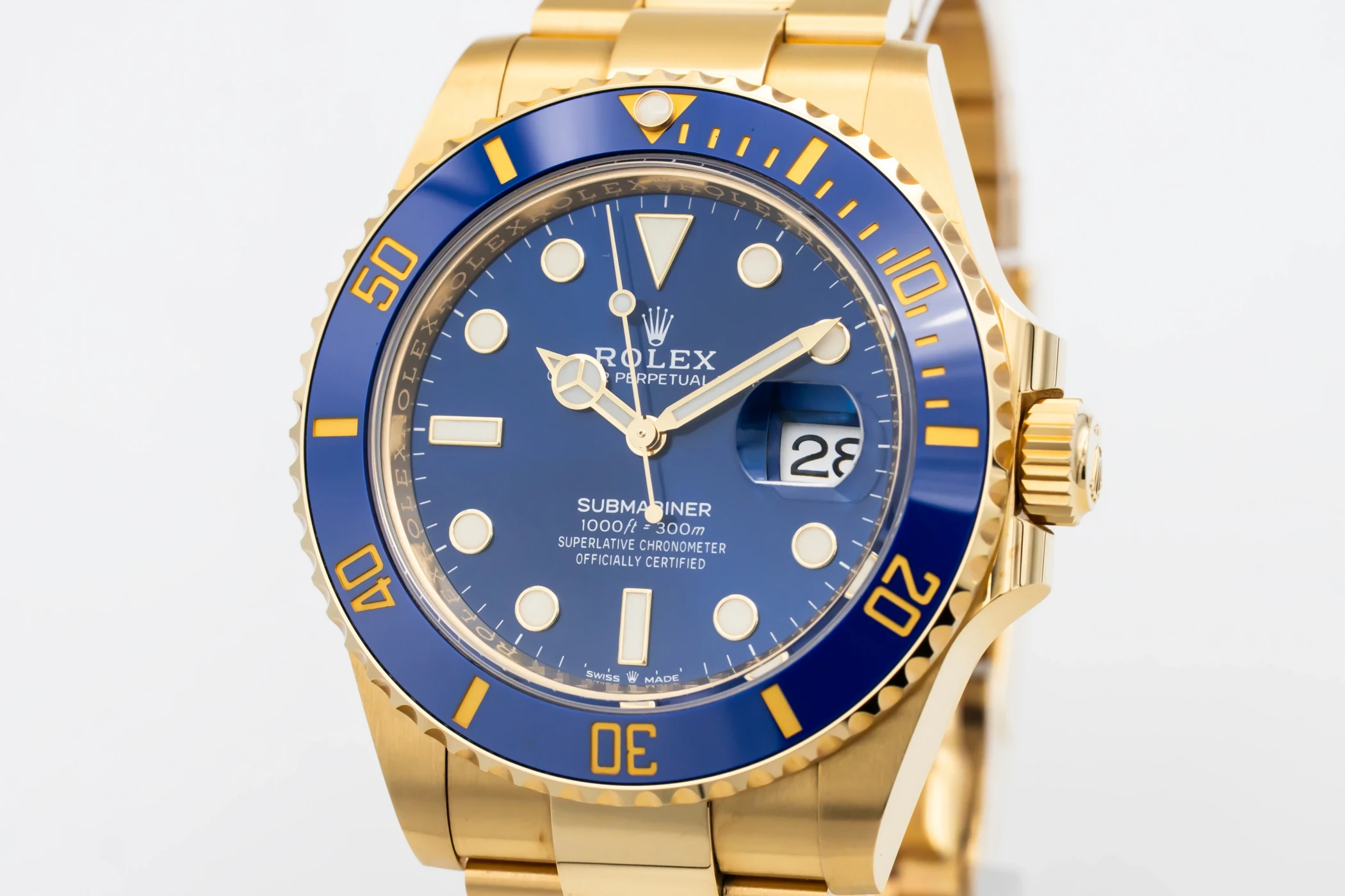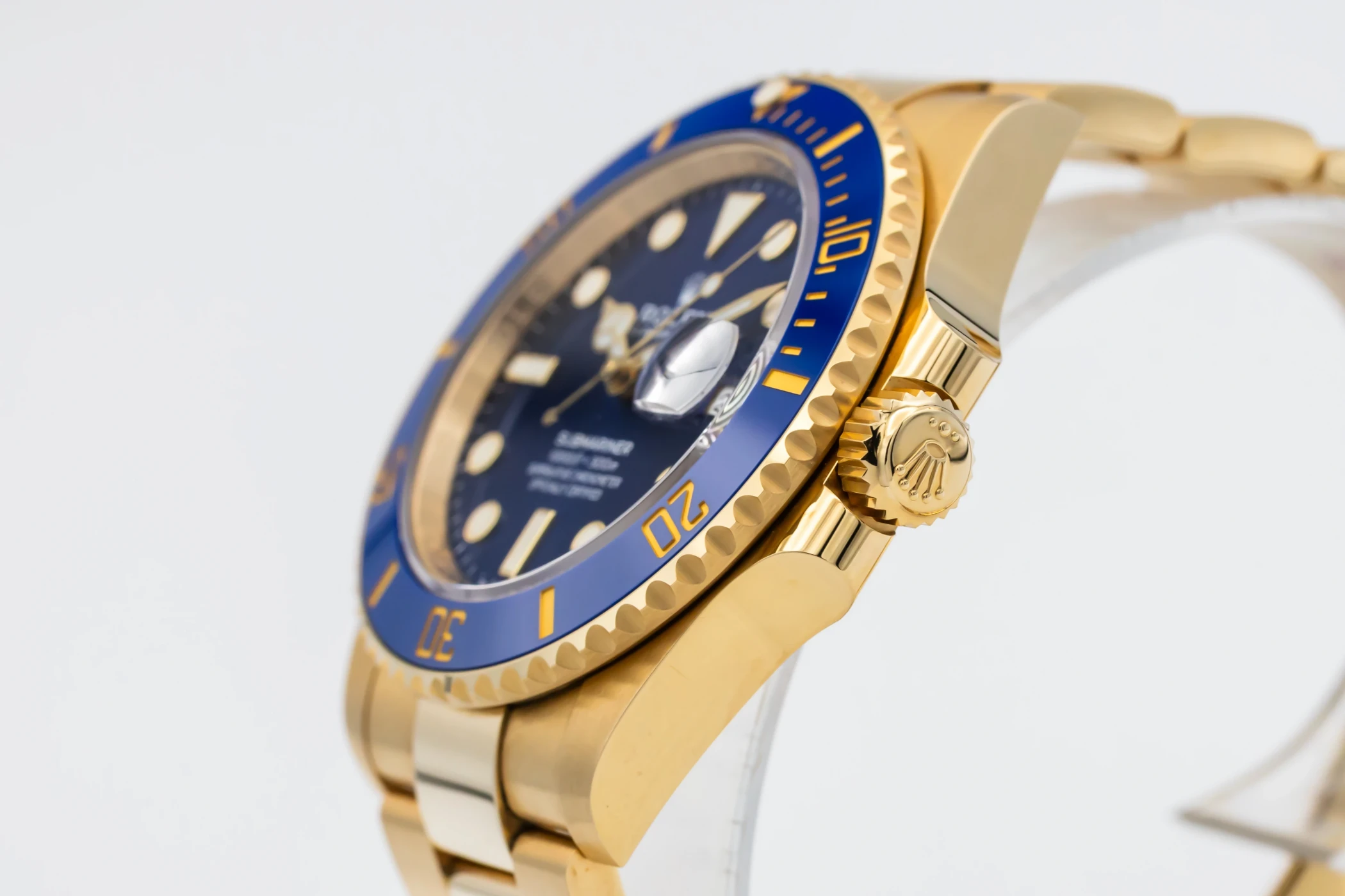 This 2022 Rolex Submariner 40mm features a blue dial with large luminescent hour markers and a solid-link oyster bracelet in 18ct yellow gold. It features a blue cerachrom unidirectional rotatable bezel.