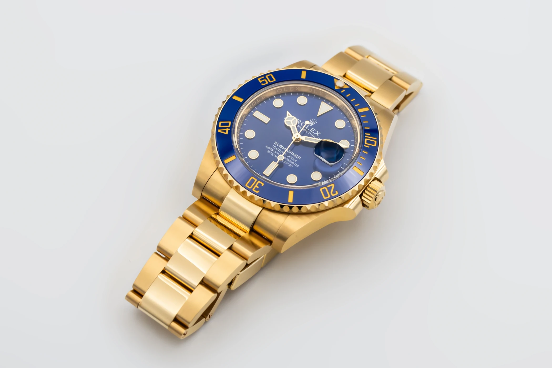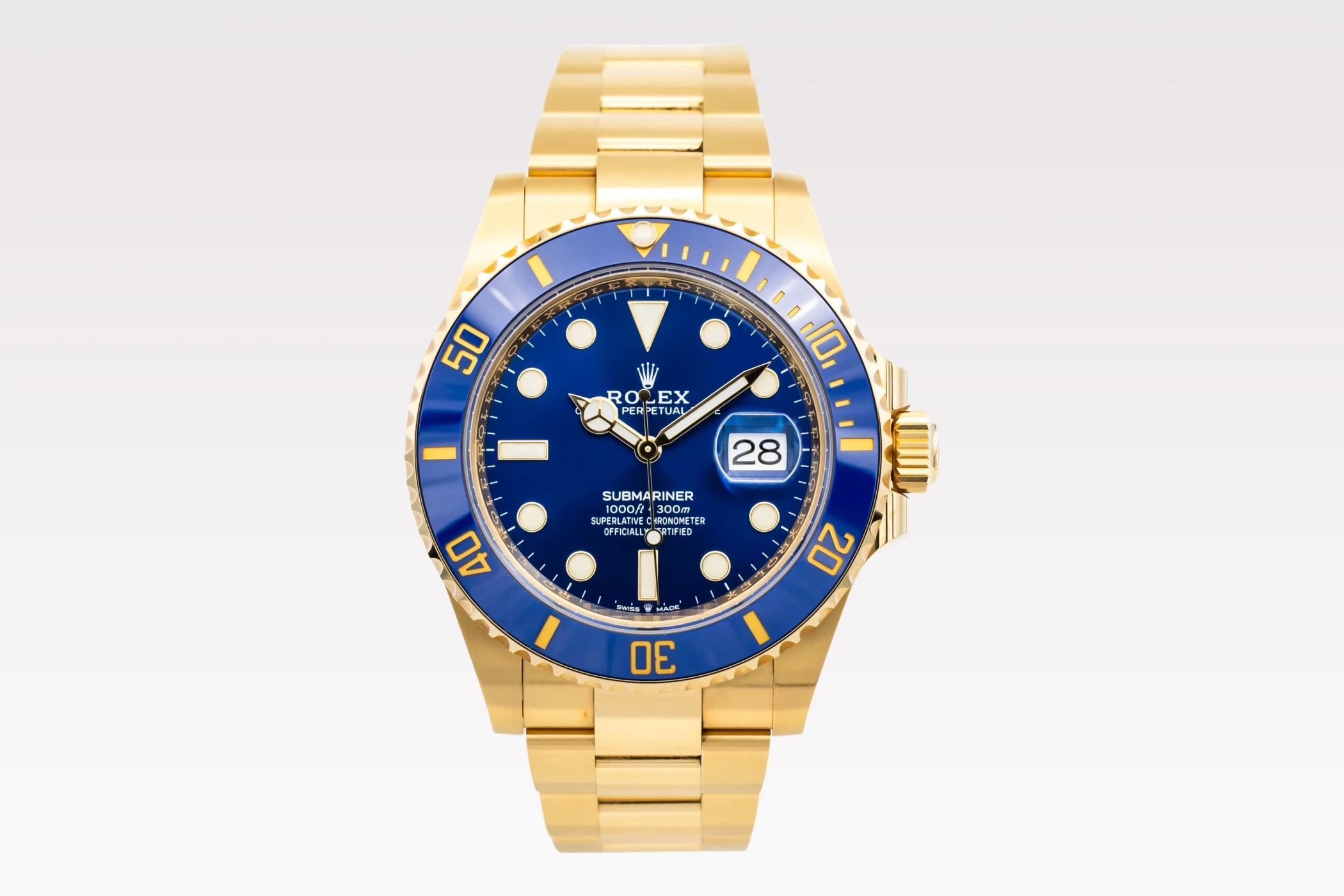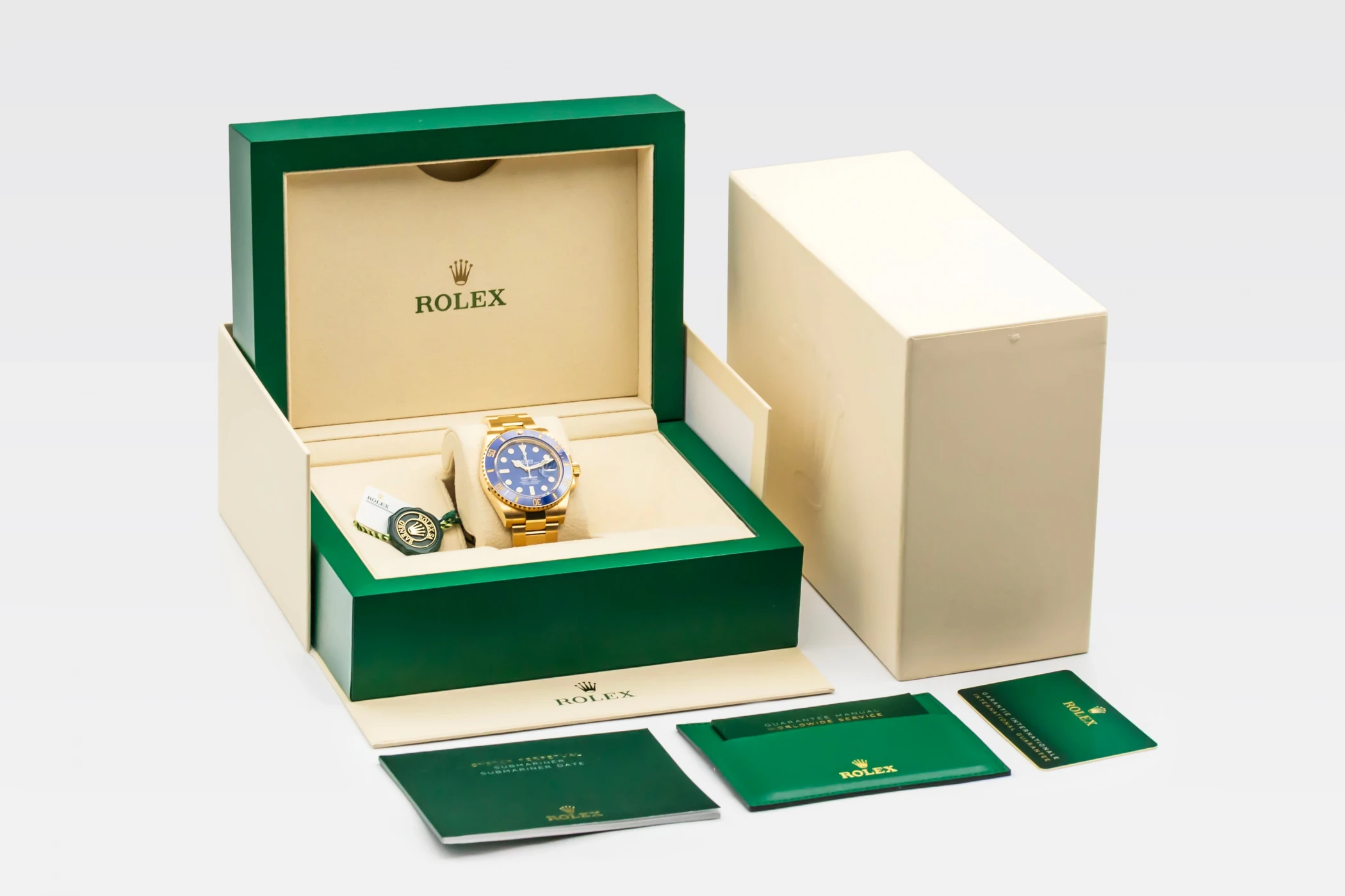 This 2022 Rolex Submariner 40mm features a blue dial with large luminescent hour markers and a solid-link oyster bracelet in 18ct yellow gold. It features a blue cerachrom unidirectional rotatable bezel.